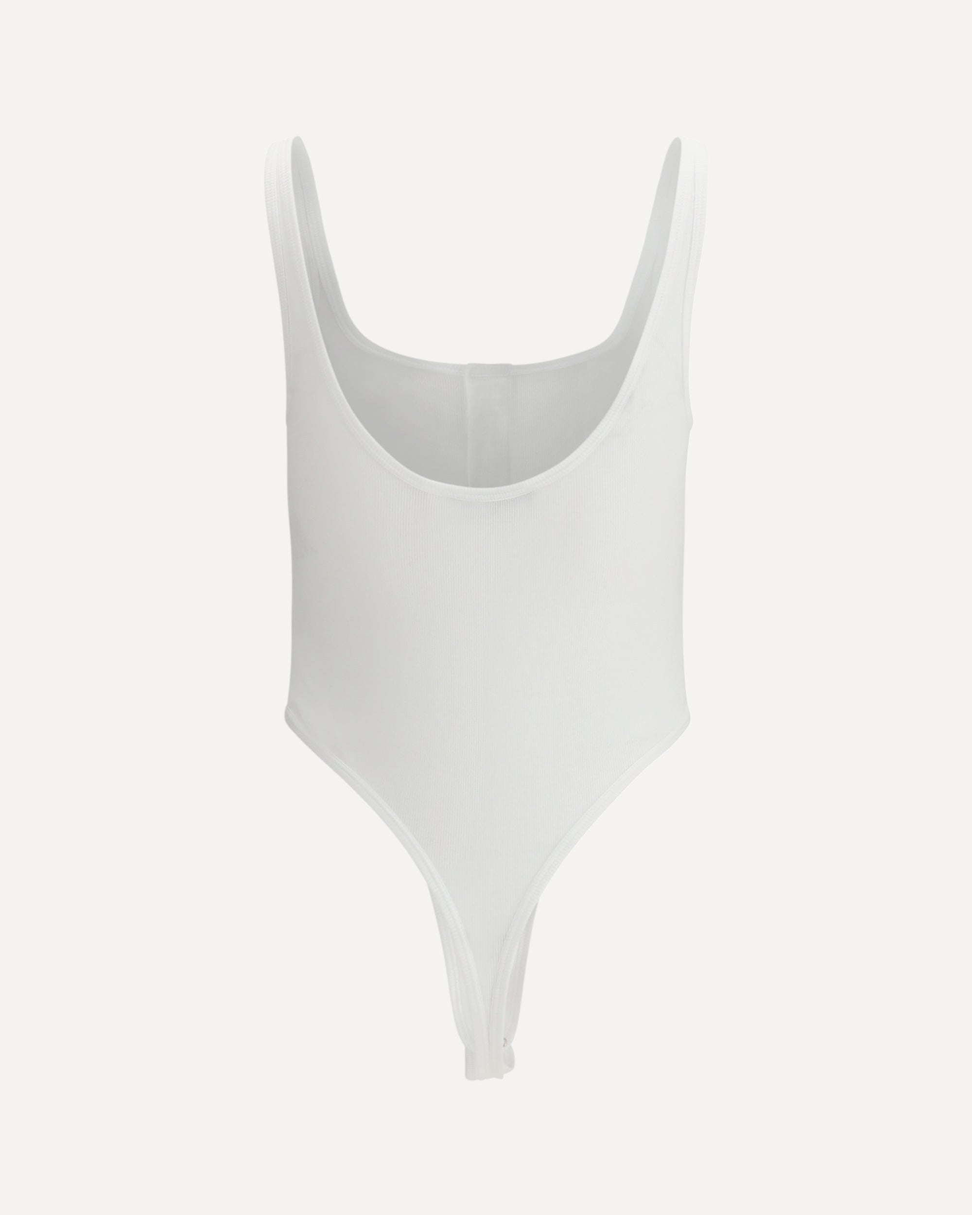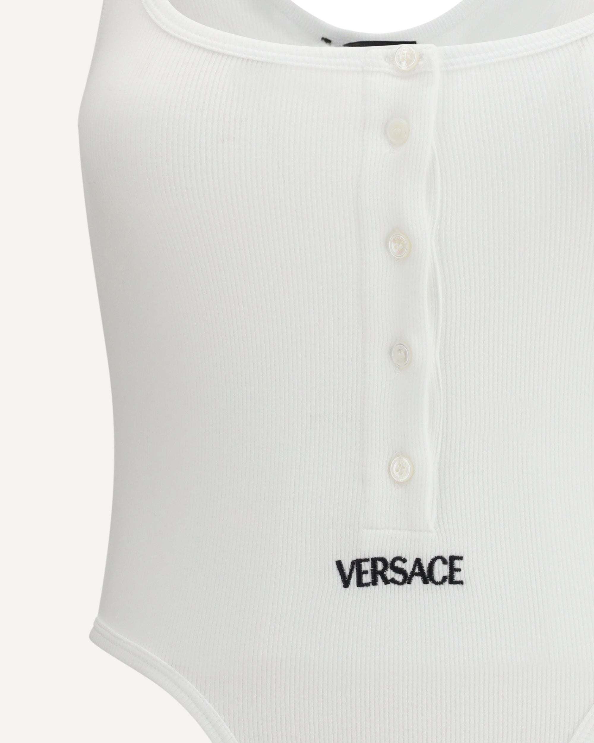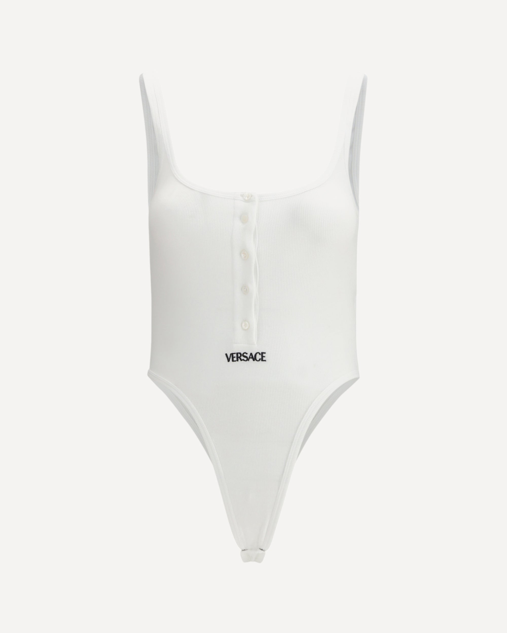 The ribbed cotton Bodysuit by Versace enhances the silhouette with a high-cut shape and a deep neckline balanced by a round neck and slim straps. The front button closure paired with a hook fastening defines the construction, while the embroidered Versace Logo in matching thread adds an iconic and refined signature. The sleeveless design reinforces a bold and modern attitude.