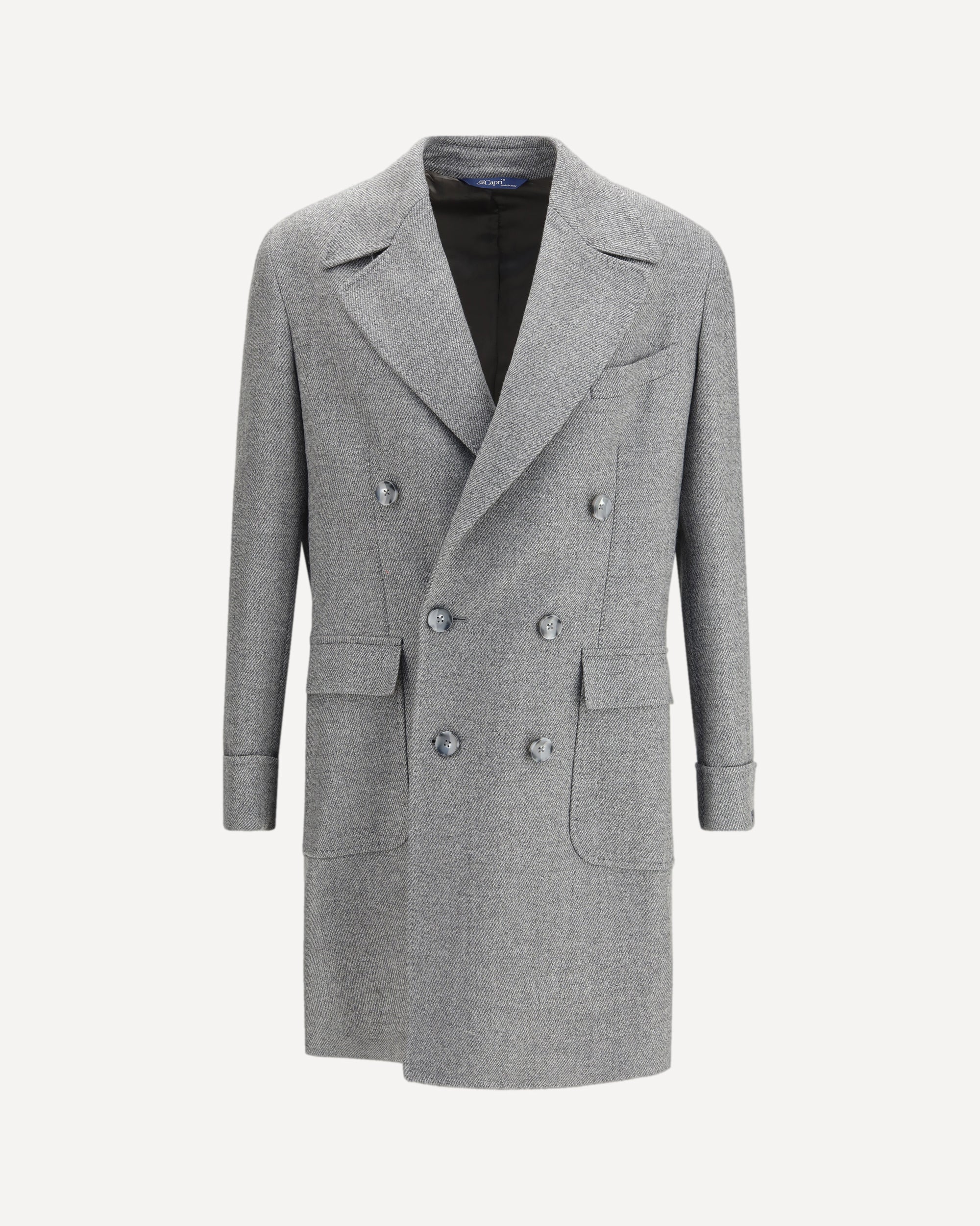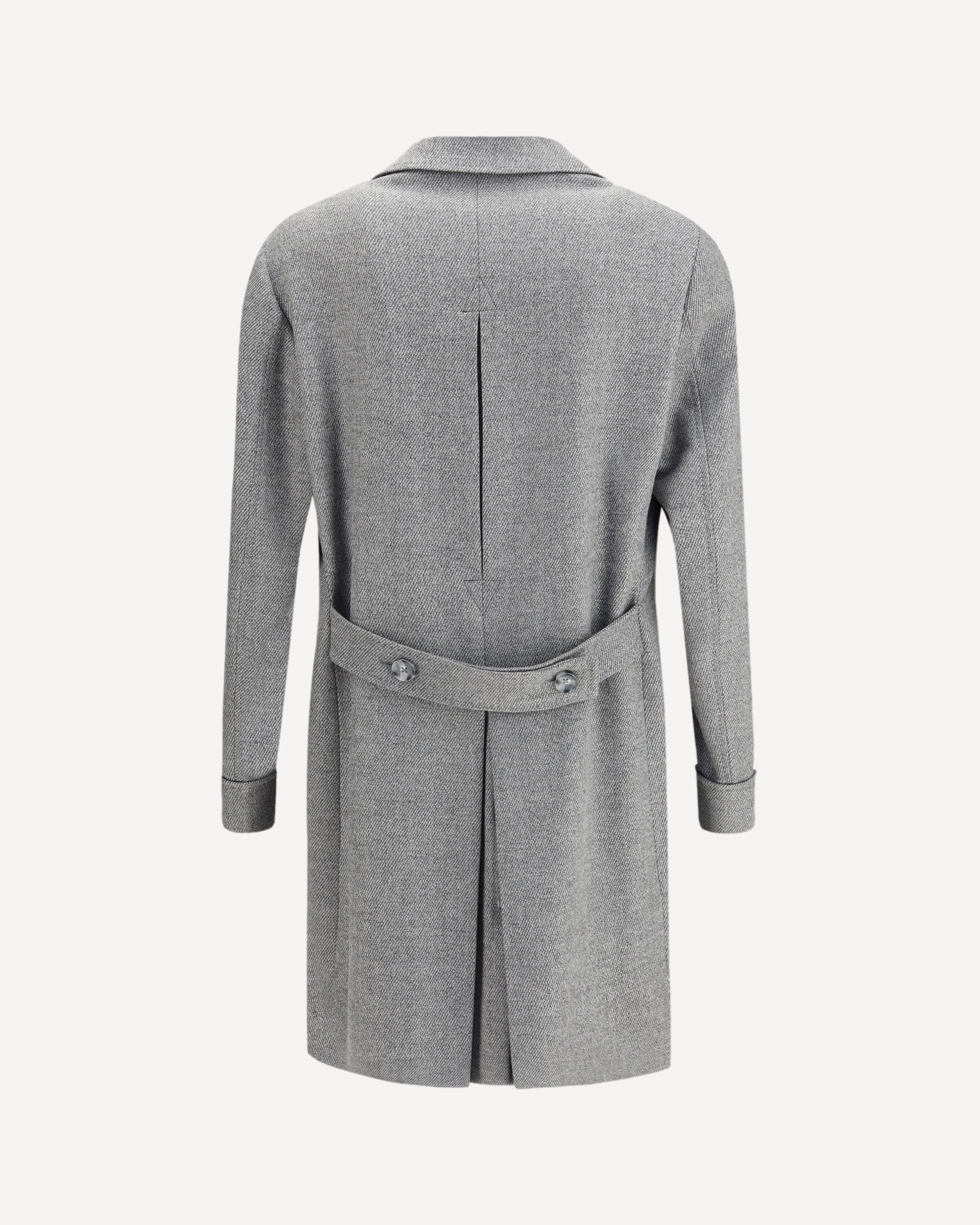 The Gi Capri Coat is a refined double-breasted design crafted from pure virgin wool, featuring classic lapels and two front flap pockets. A fabric band on the back provides a distinctive and modern touch, elevating this timeless piece with a note of understated sophistication.