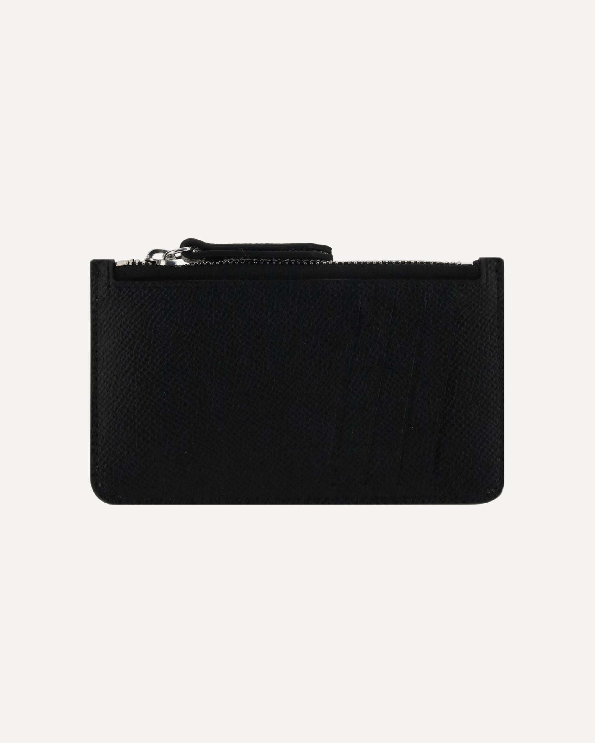 Calfskin Card Holder by Maison Margiela, top zipper closure, grained leather front, smooth leather back with iconic contrasting brand embroidery, card slot on front.