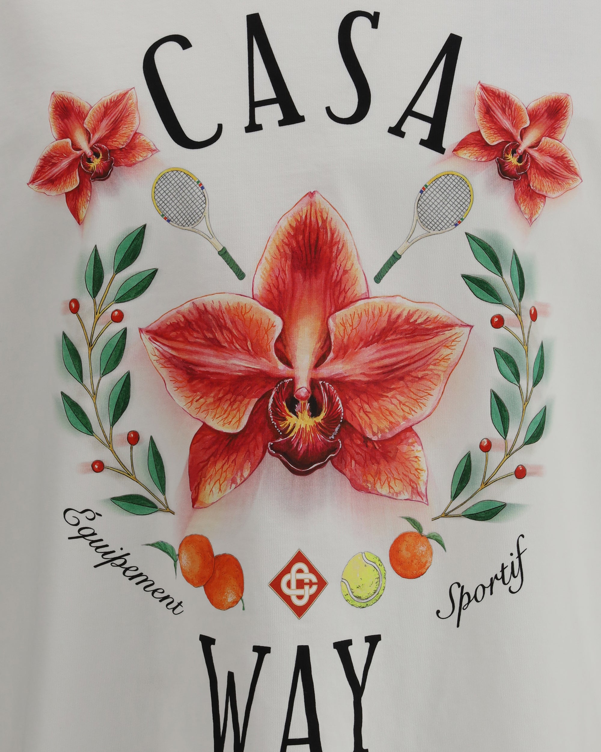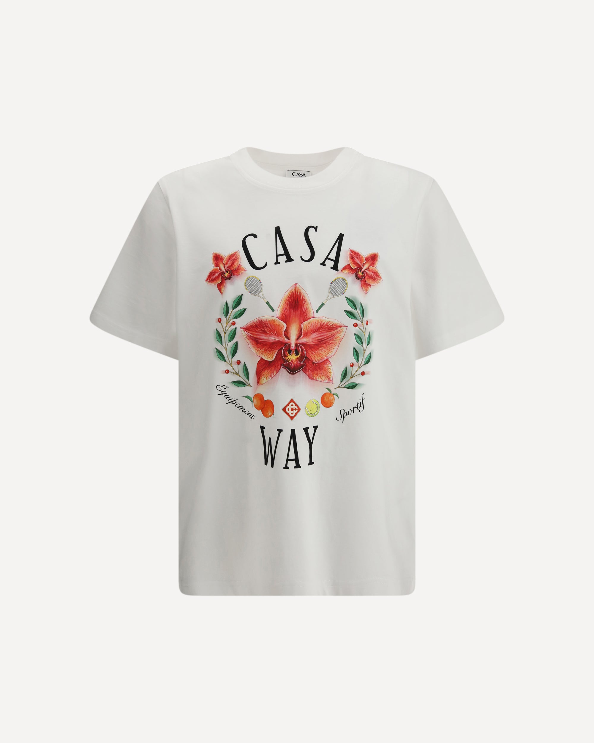 The Casa Way Orchid Logo Short Sleeve T-Shirt by Casablanca is a printed cotton short-sleeve T-shirt featuring refined artwork that highlights the orchid as the season’s signature flower. The design is completed with a classic ribbed crew neck, blending comfort with Casablanca’s iconic visual identity.