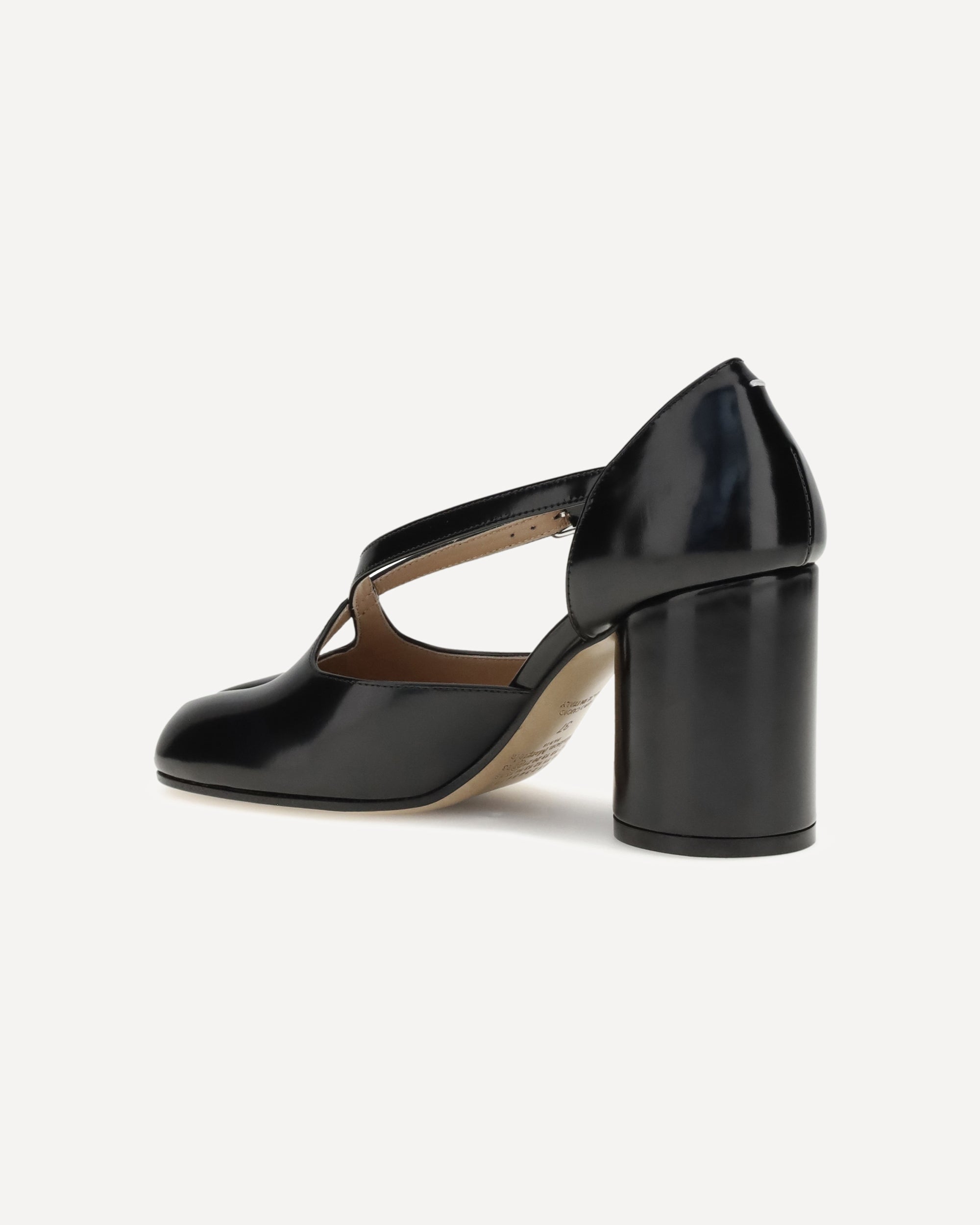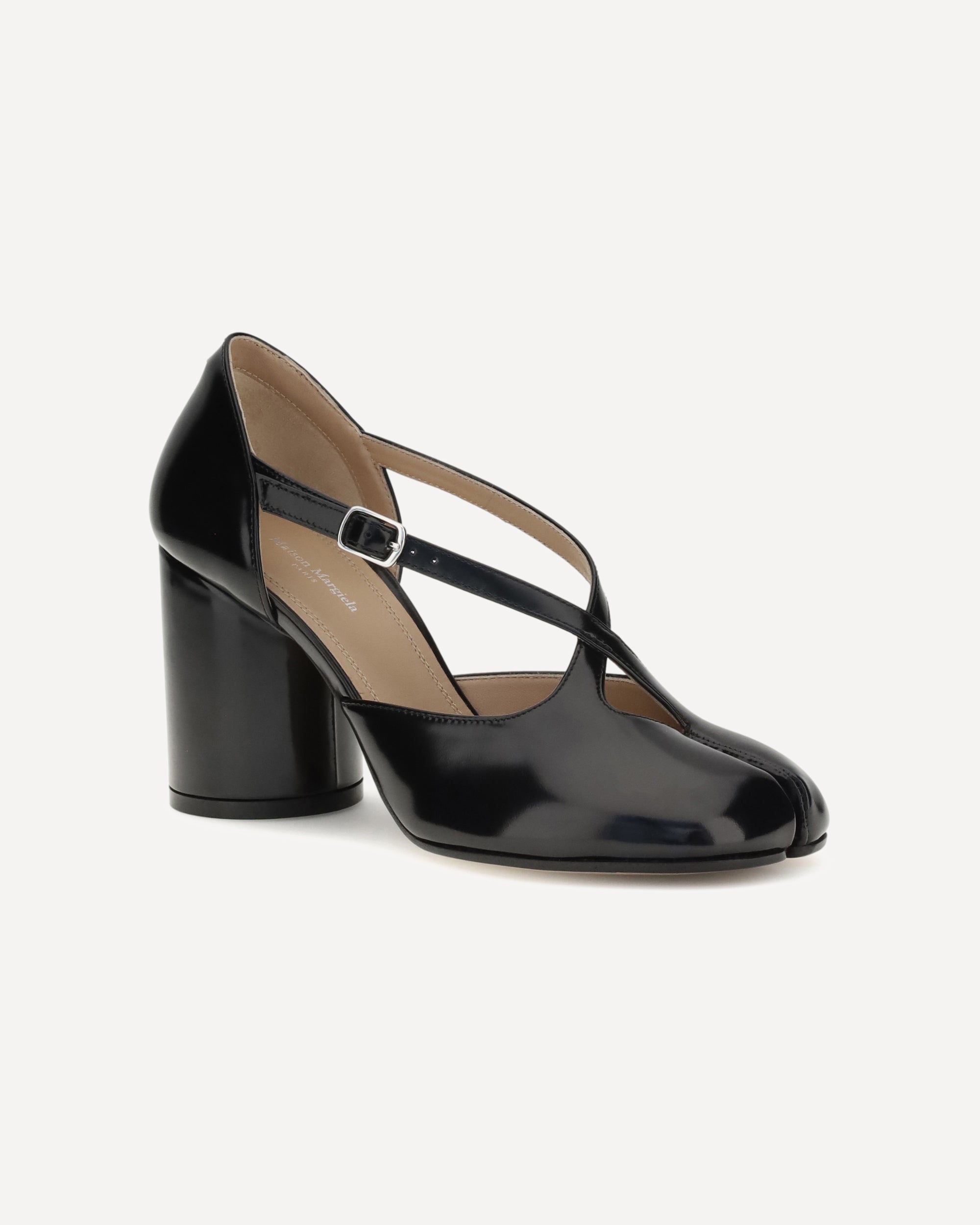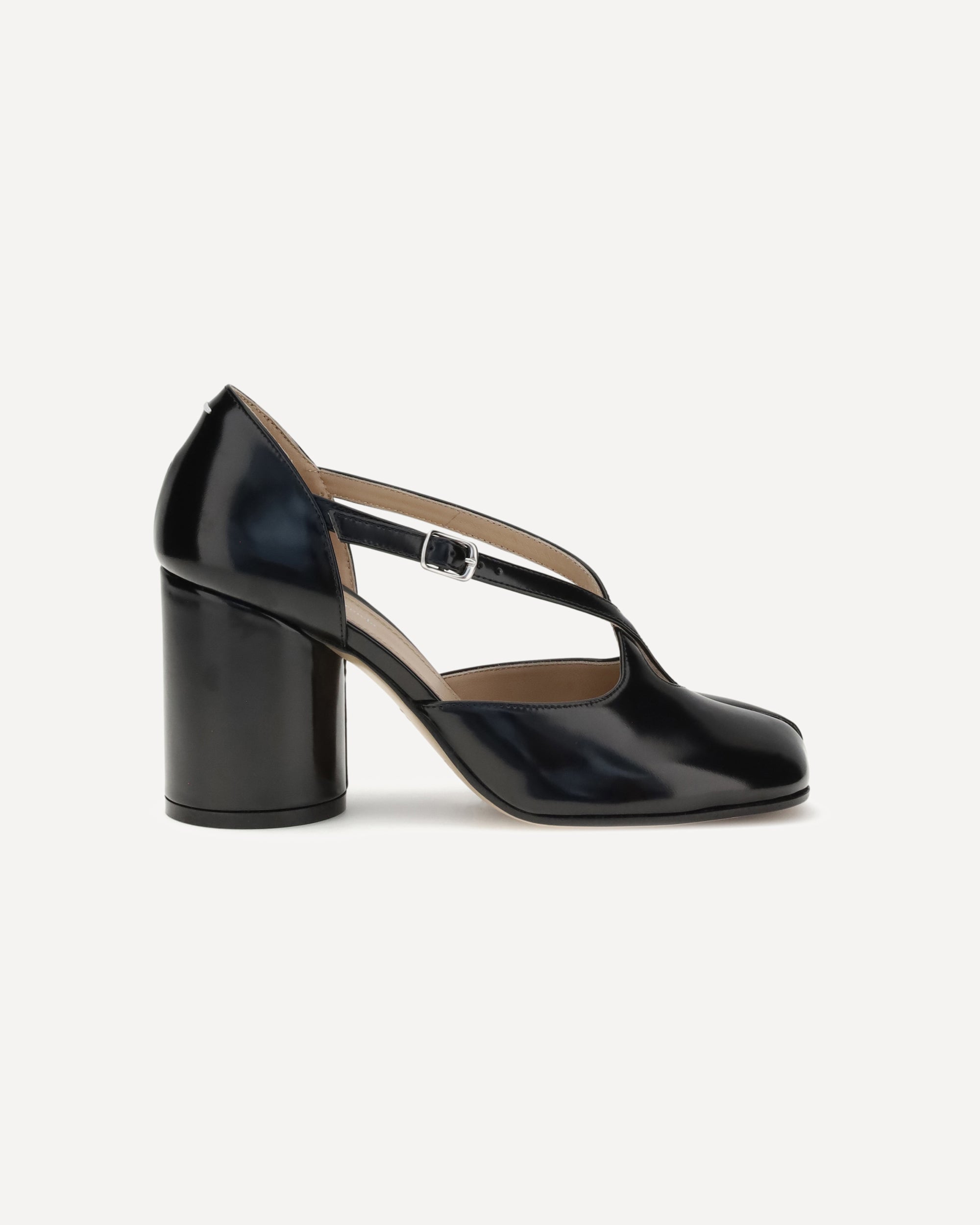 Maison Margiela's Tabi Pumps stand out for their iconic separated toe and bold design. Featuring crisscrossed straps and a side buckle closure, they are complemented by a wide high heel and a logo insole. A model with a recognizable style that combines character and sophistication.