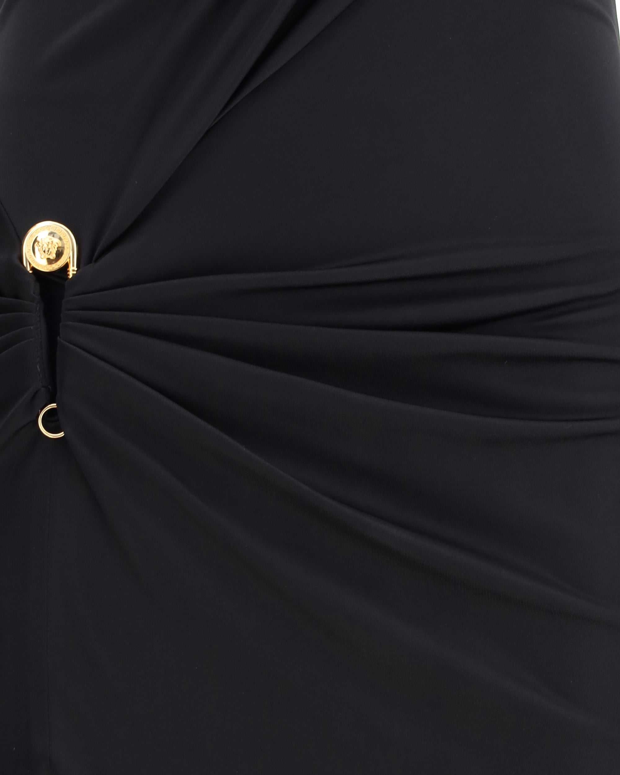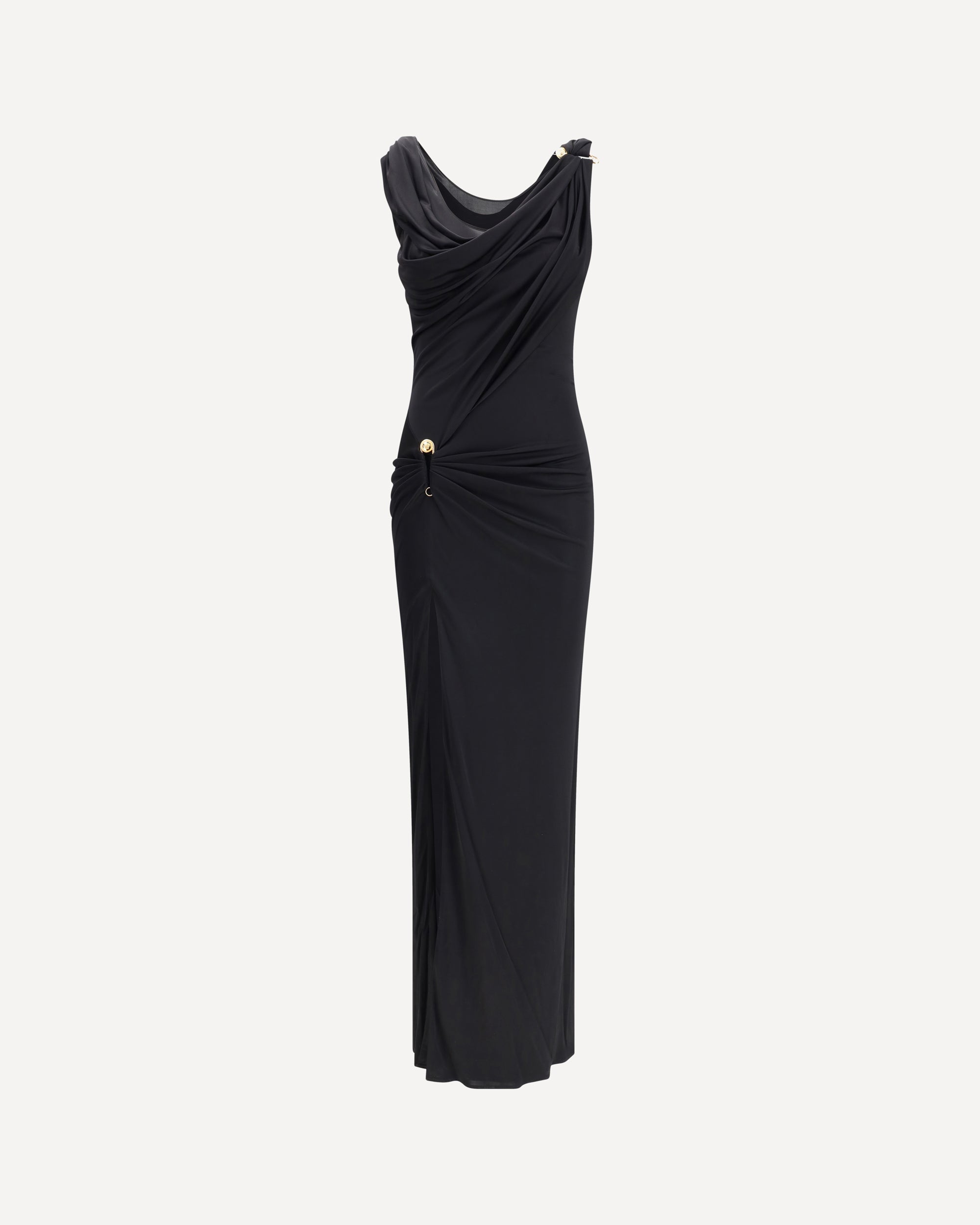 Versace's Sleeveless jersey Dress is a draped design that elegantly enhances the silhouette. Featuring a soft neckline, it is embellished with iconic details: golden logo pins applied on the front and shoulder, recalling the Maison's bold and sophisticated aesthetic.