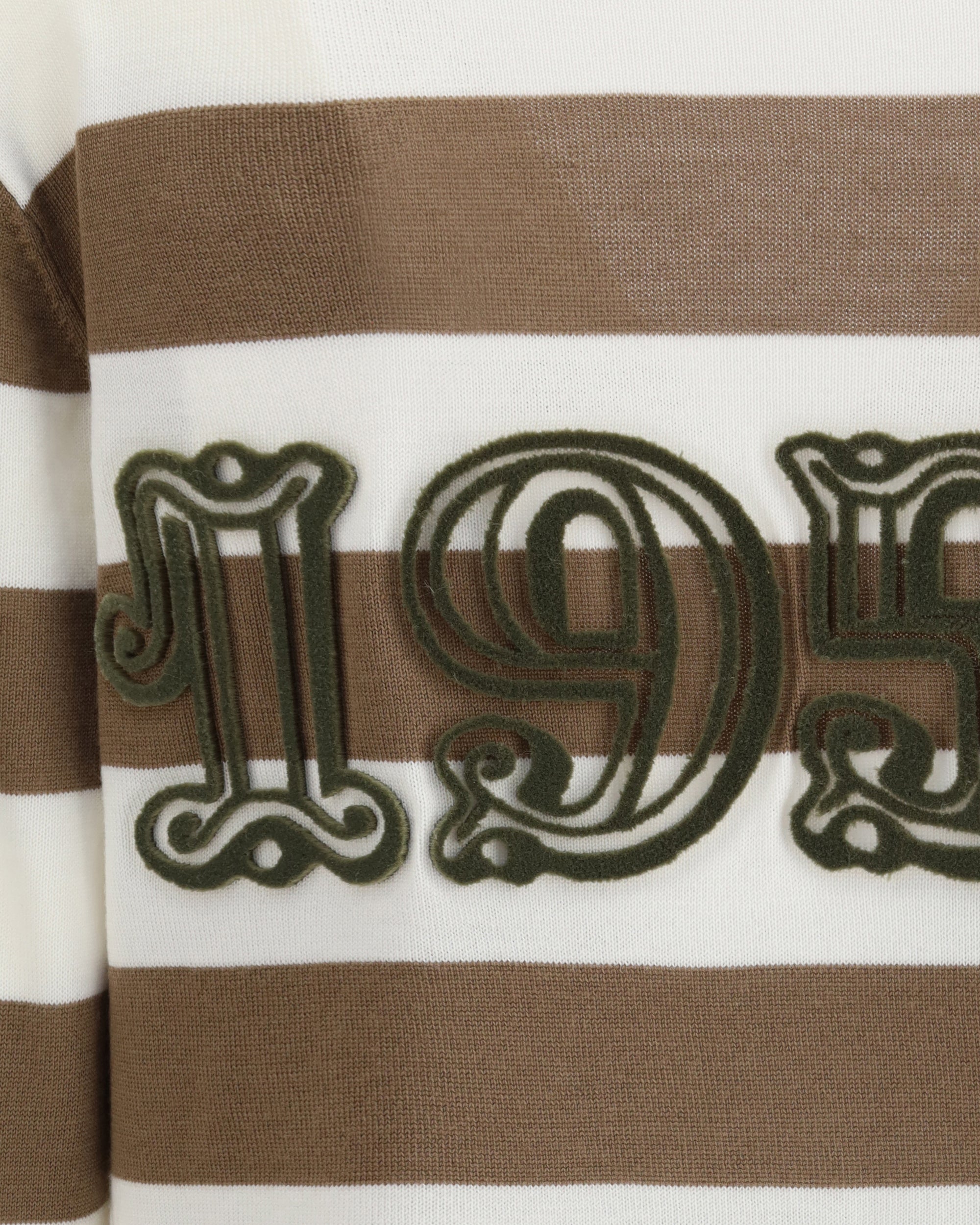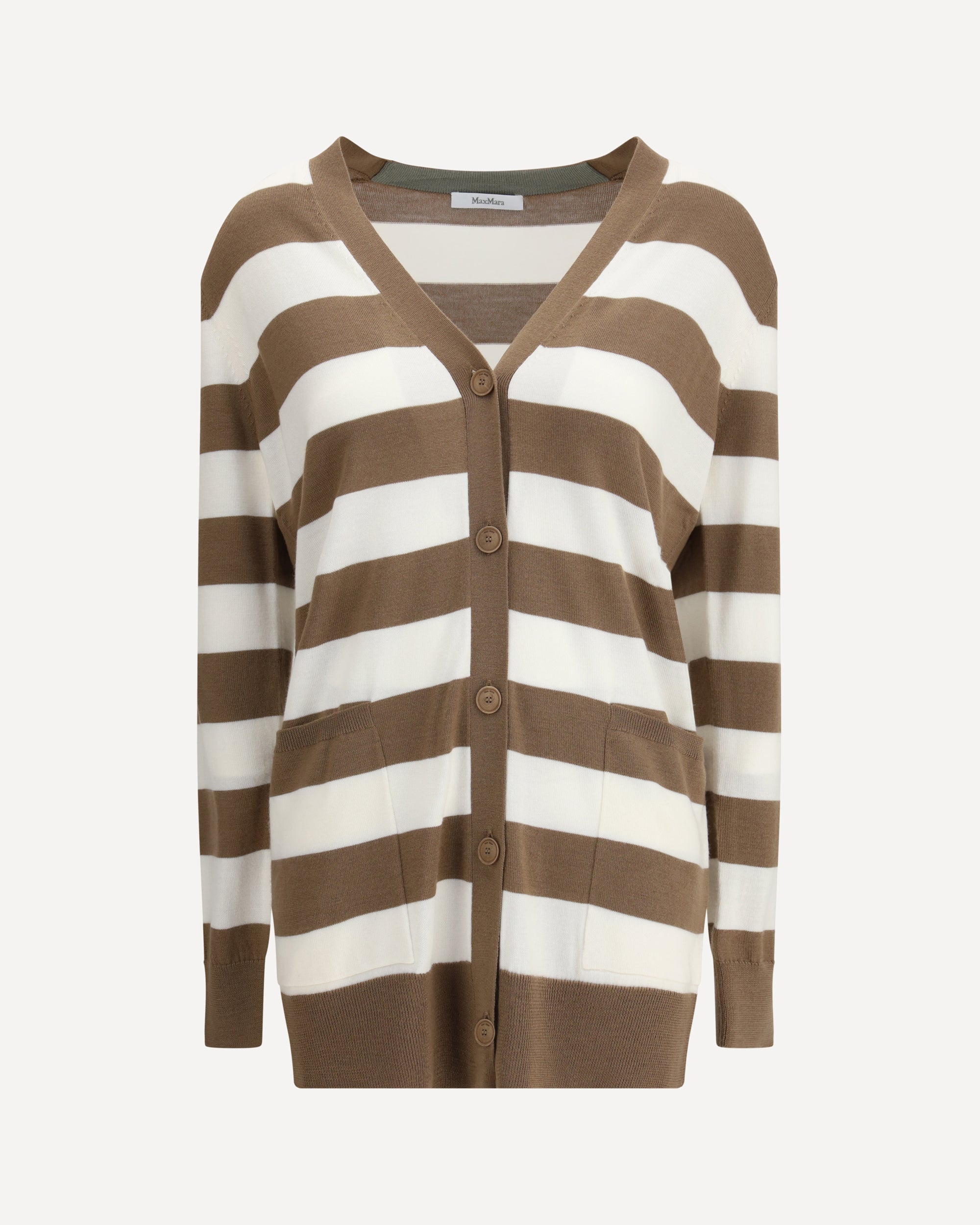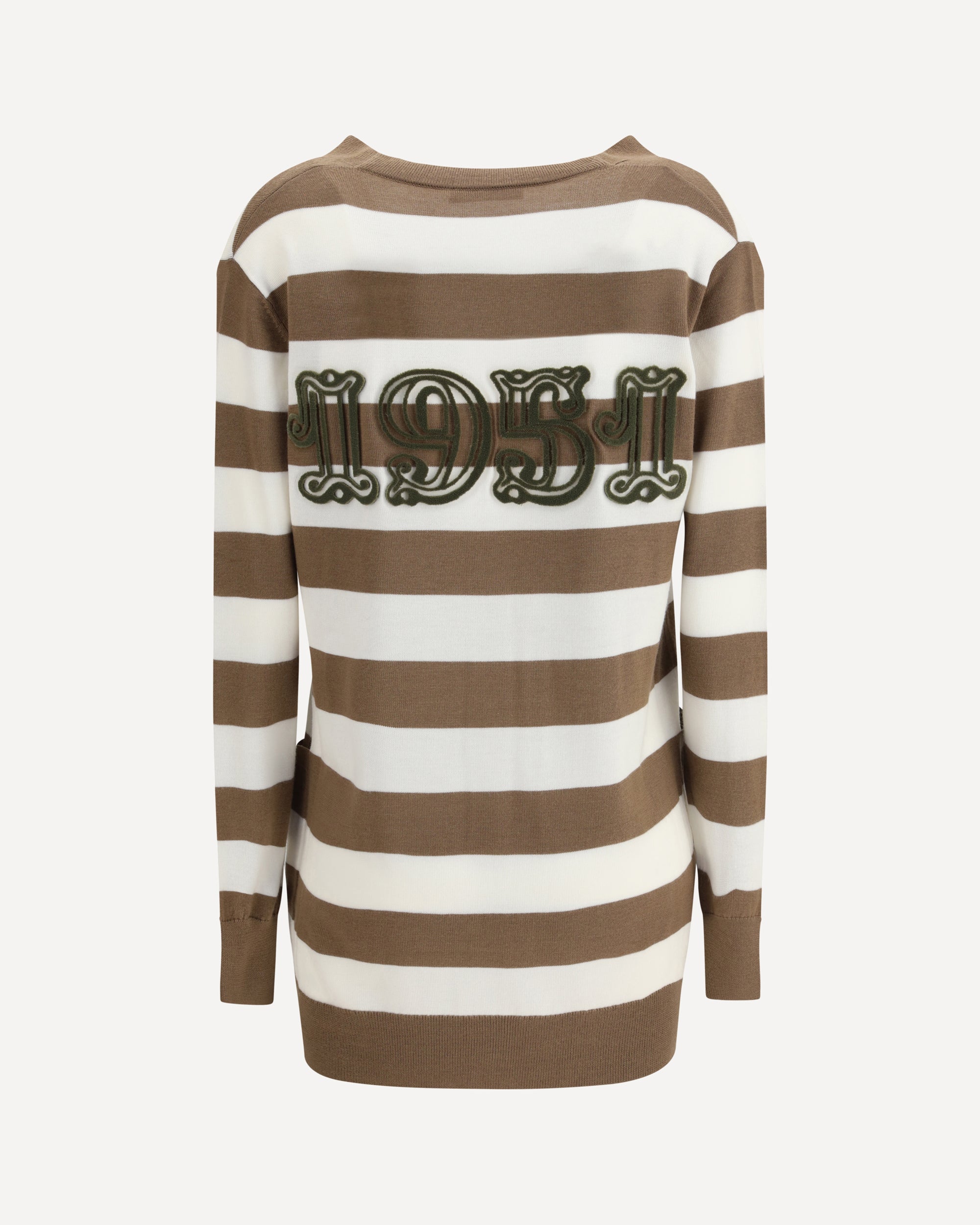 Max Mara's Fiemme Cardigan is made of pure virgin wool yarn and features a striped pattern that lends dynamism and character to the design. With long sleeves, it is enriched on the back by a flocked decoration with the "1951" motif, a tribute to the brand's tradition. A warm and distinctive garment, ideal for a casual yet sophisticated style.