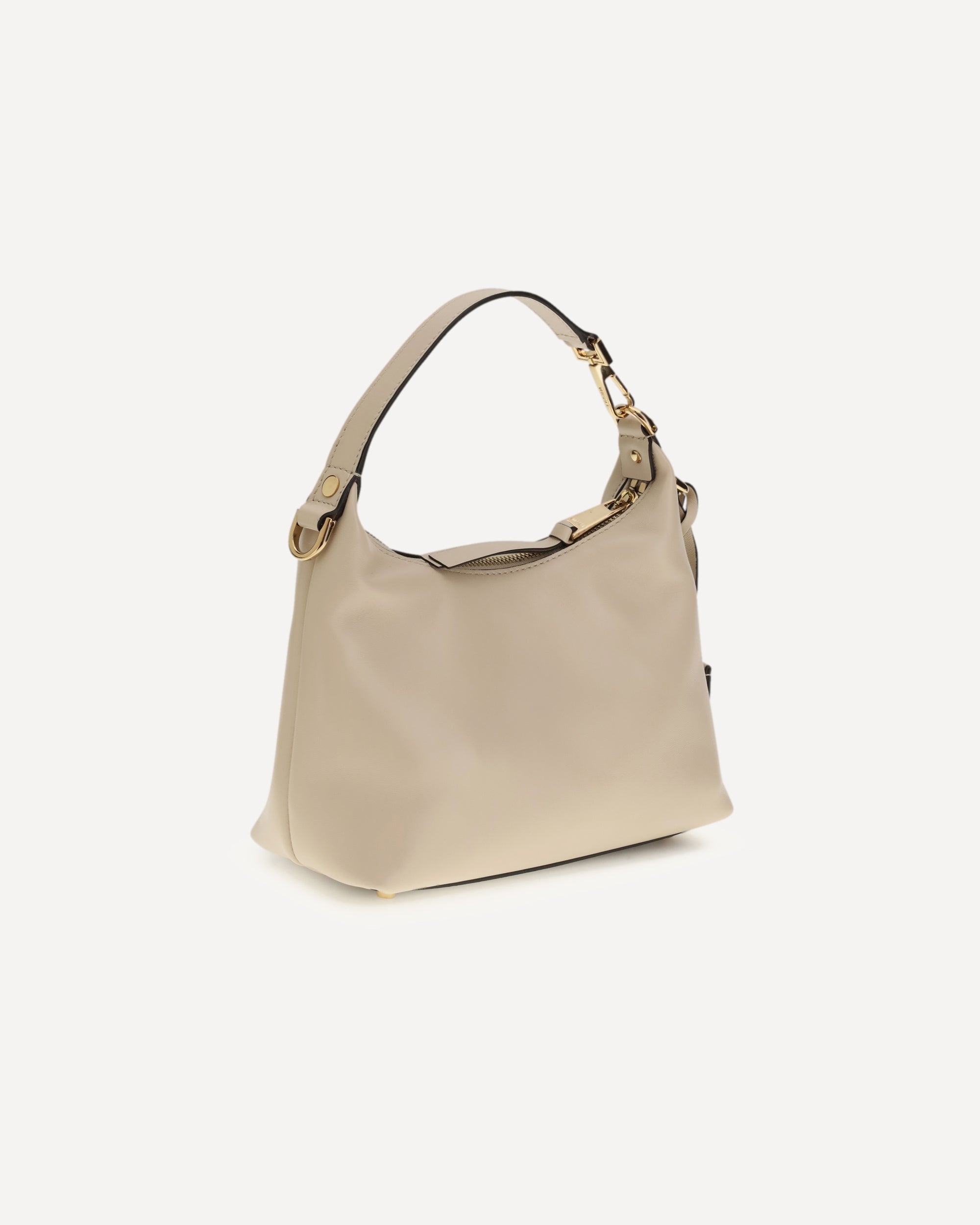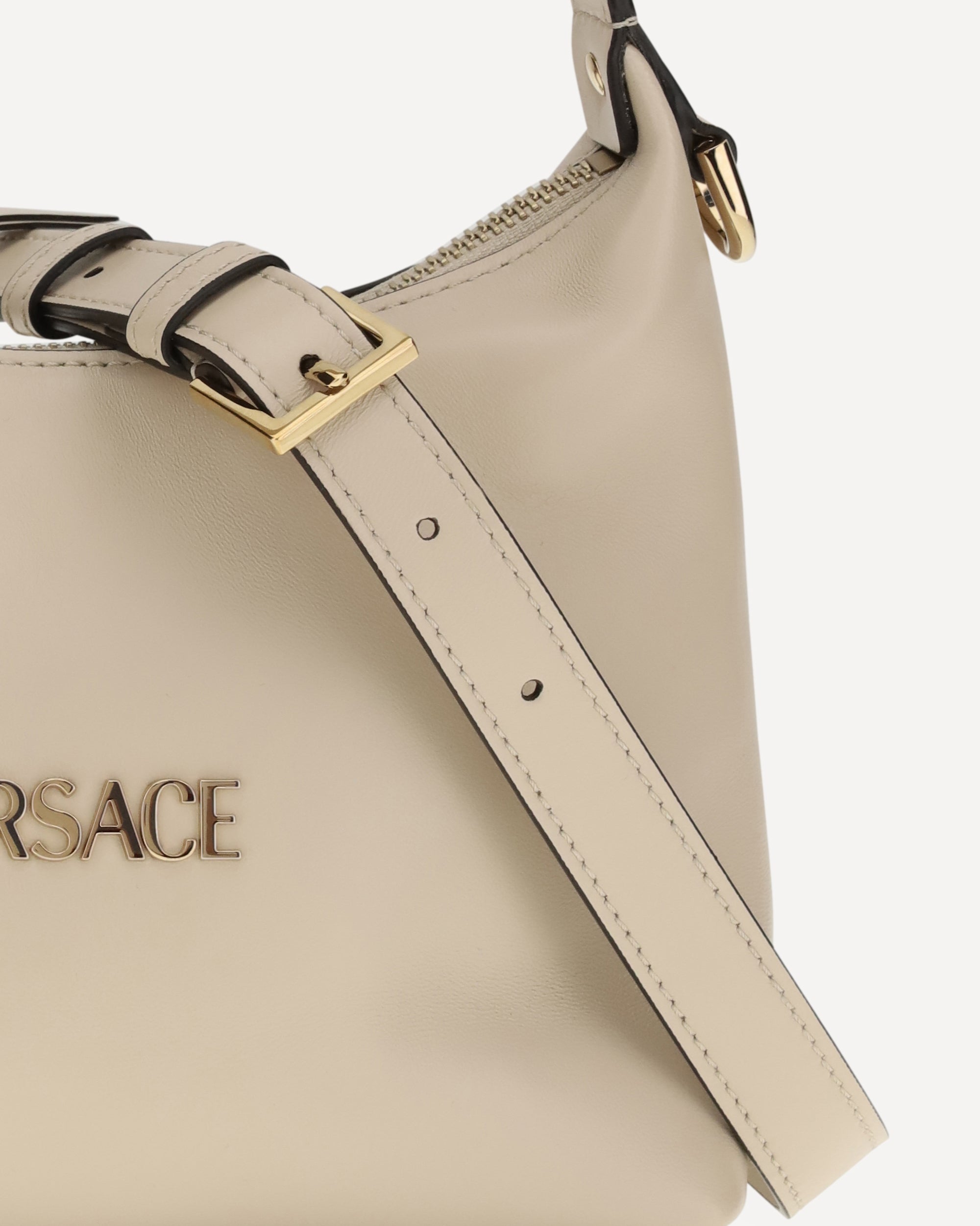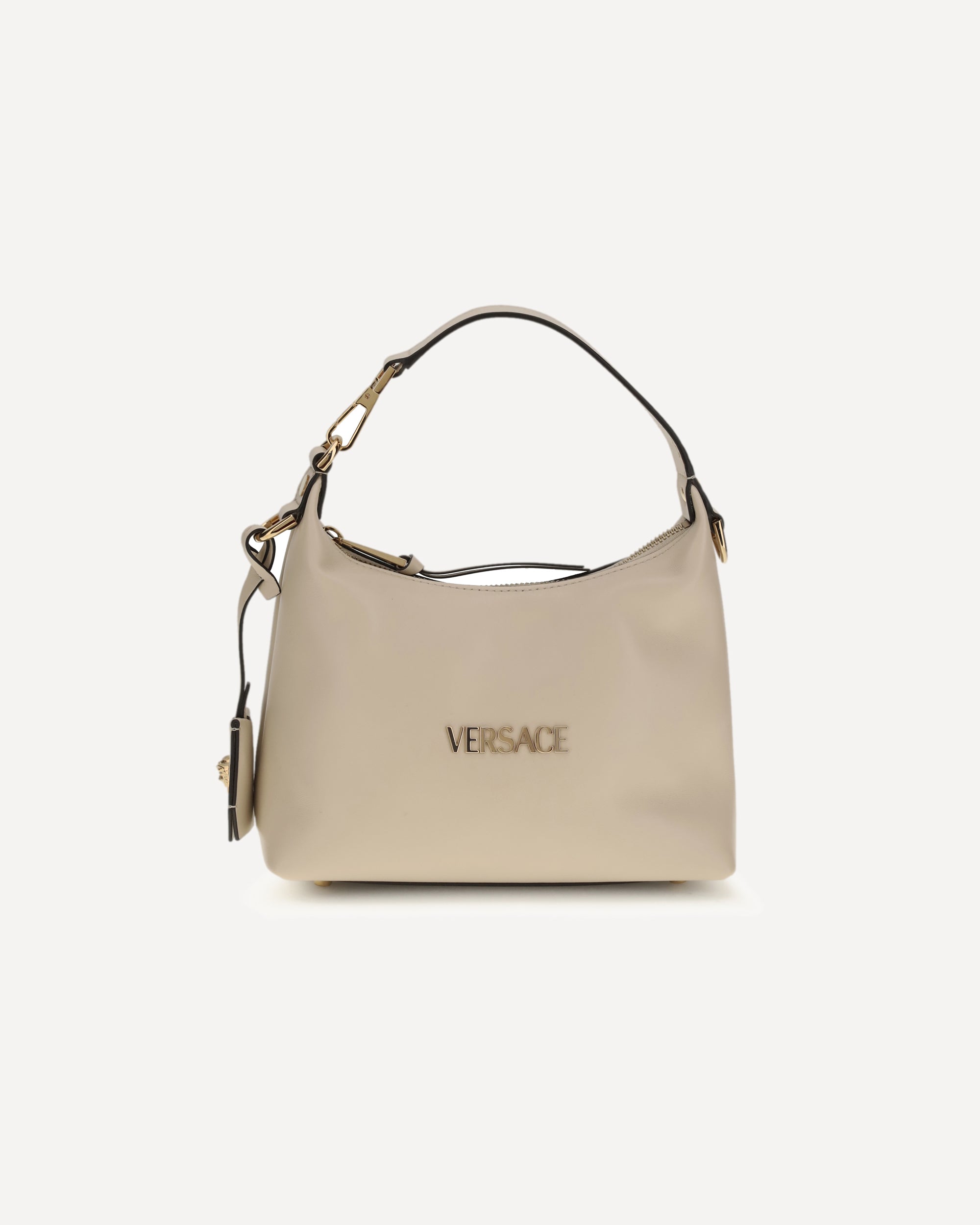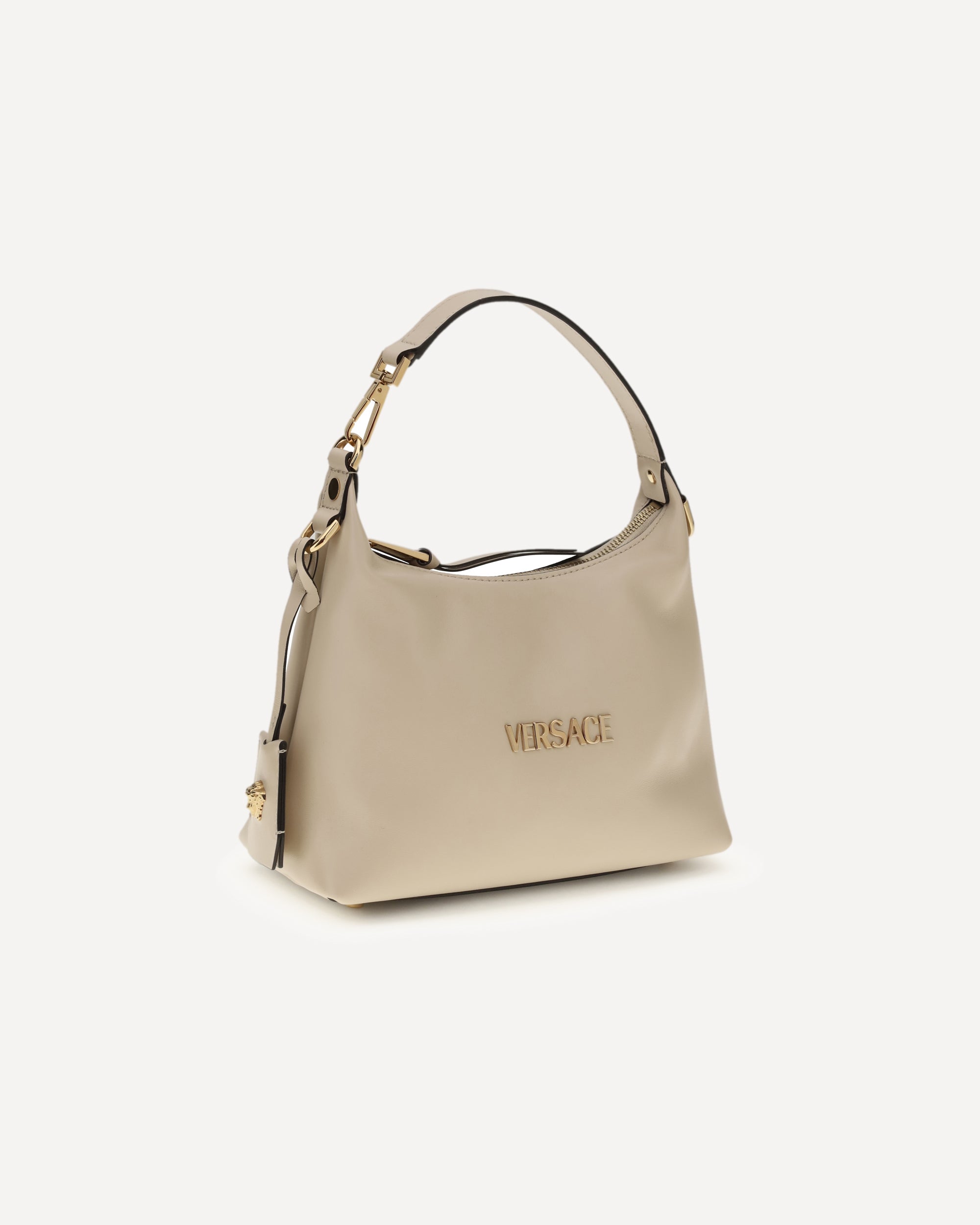 The Leather Hobo Handbag by Versace, flat handle that can be opened on one side, adjustable and removable flat shoulder strap, three-dimensional iconic brand monogram plaque applied to front, zipper closure at top, metal feet at base of bag, single interior compartment.