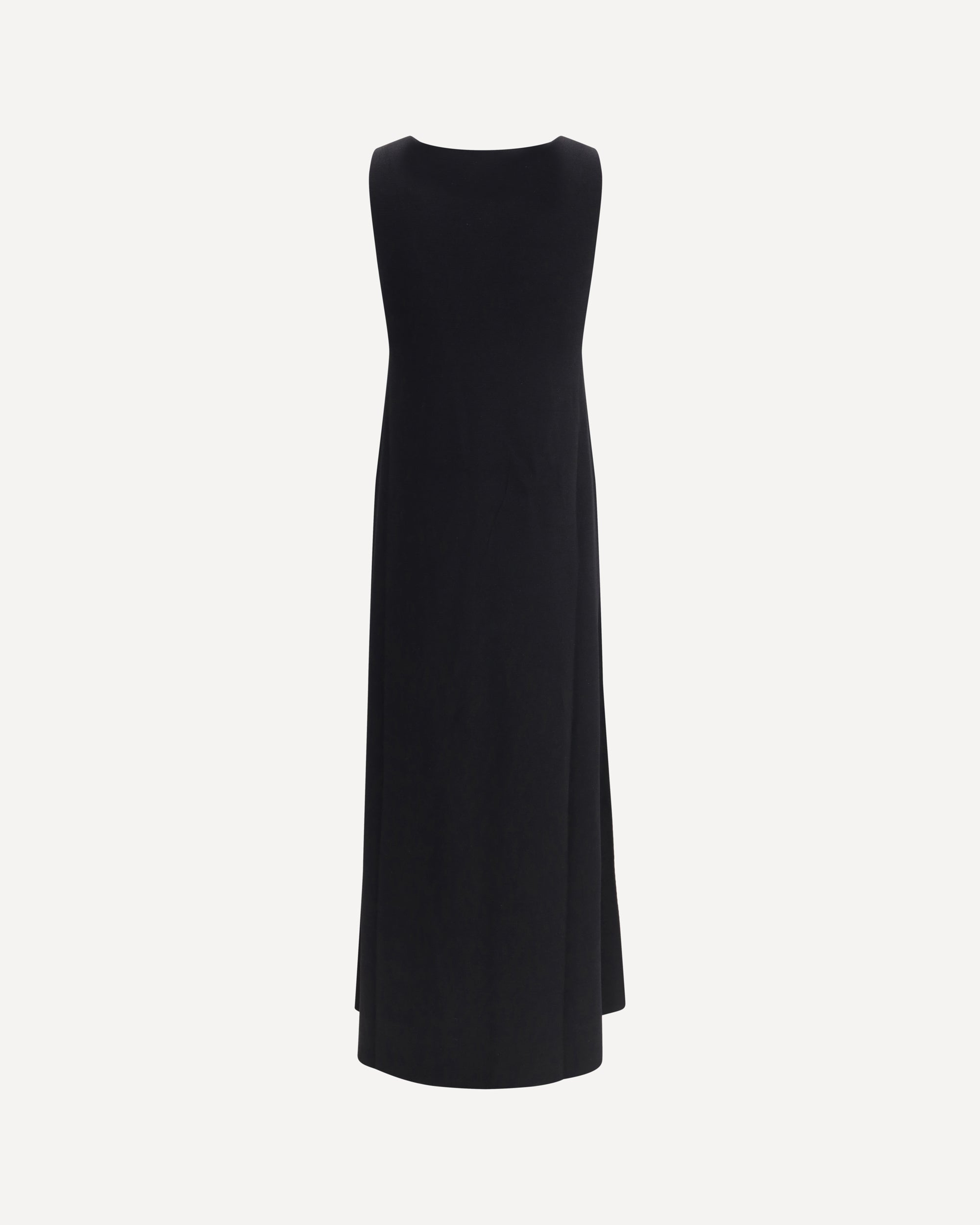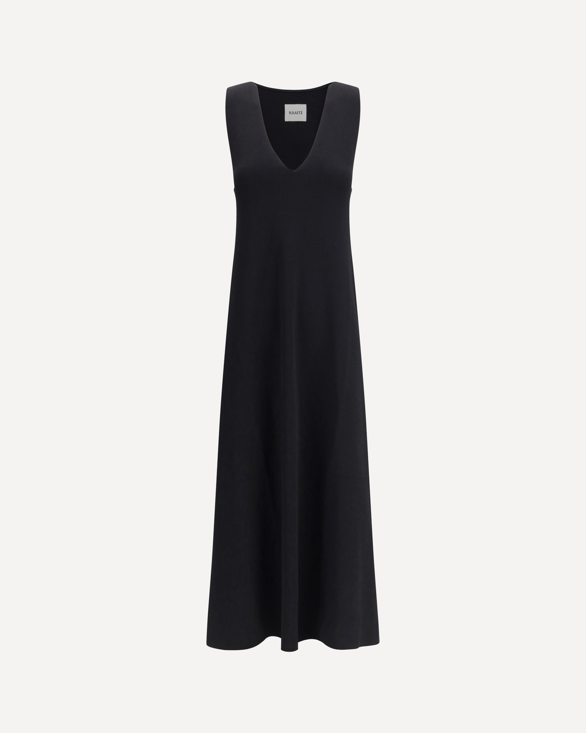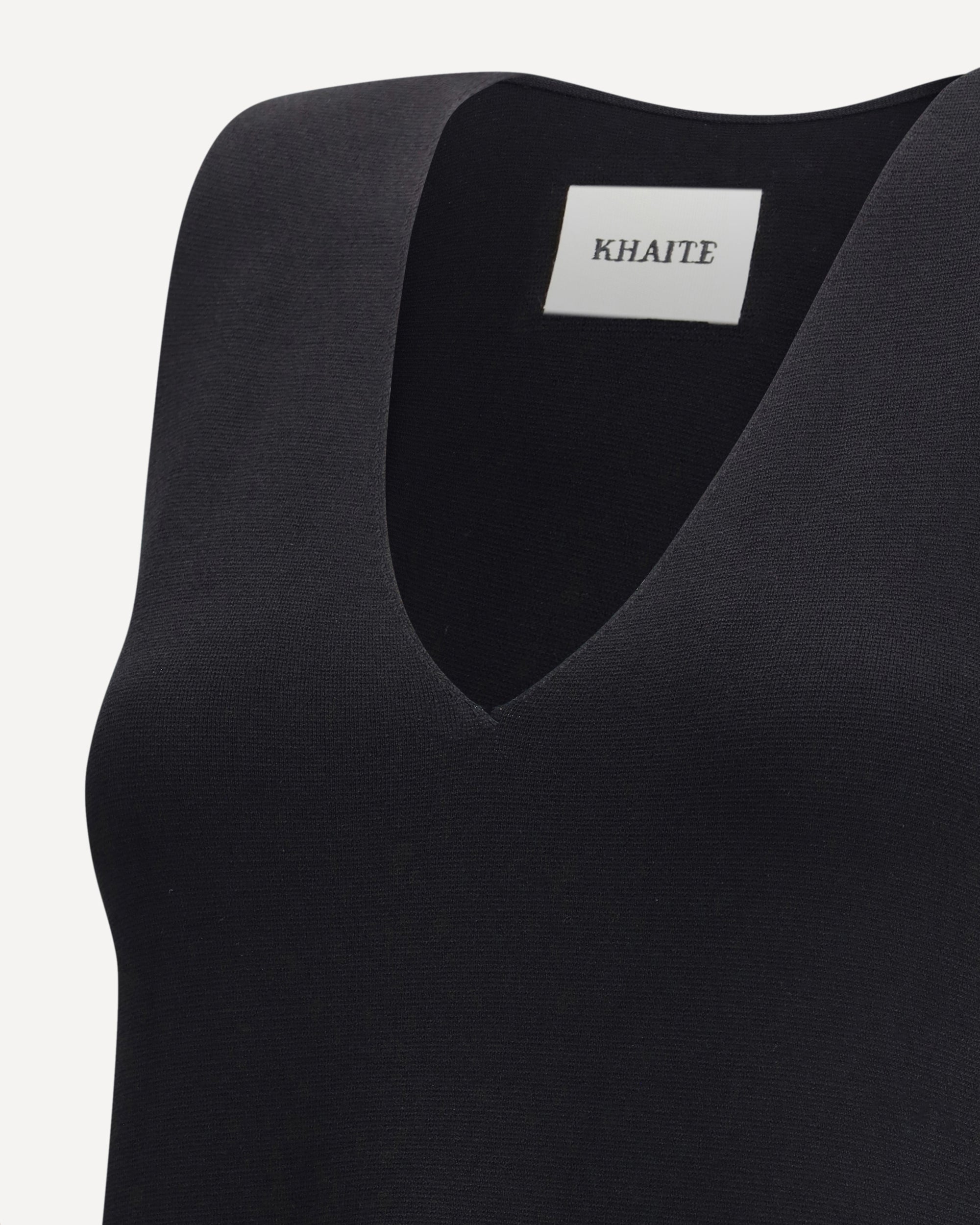 The Keran Dress by Khaite is a sophisticated and minimalist piece, featuring a sleeveless design that offers a sleek and cool silhouette. The V-neck on the front adds a sensual and refined touch, while the monochrome pattern makes the dress versatile and easy to match with various accessories. Perfect for a simple yet classy look, ideal for formal occasions or evening events.