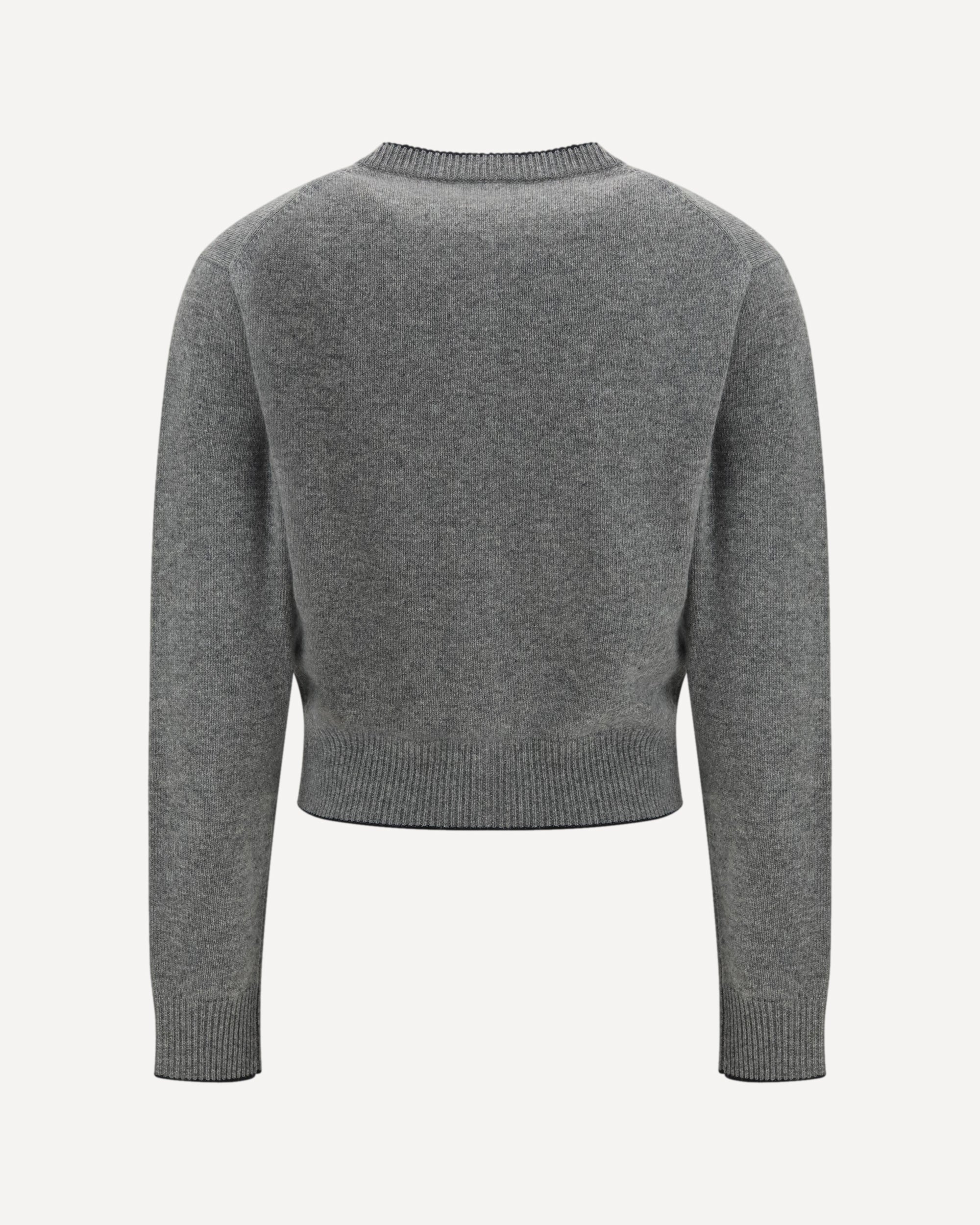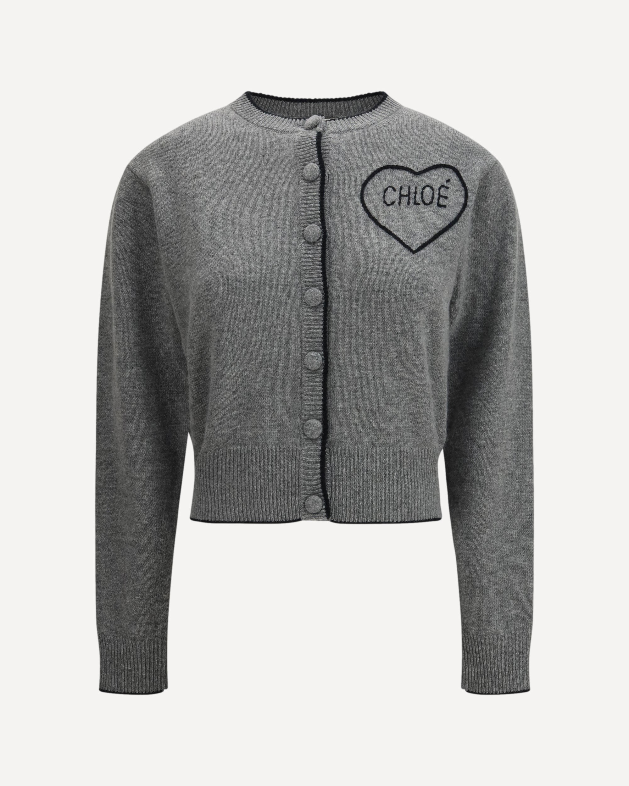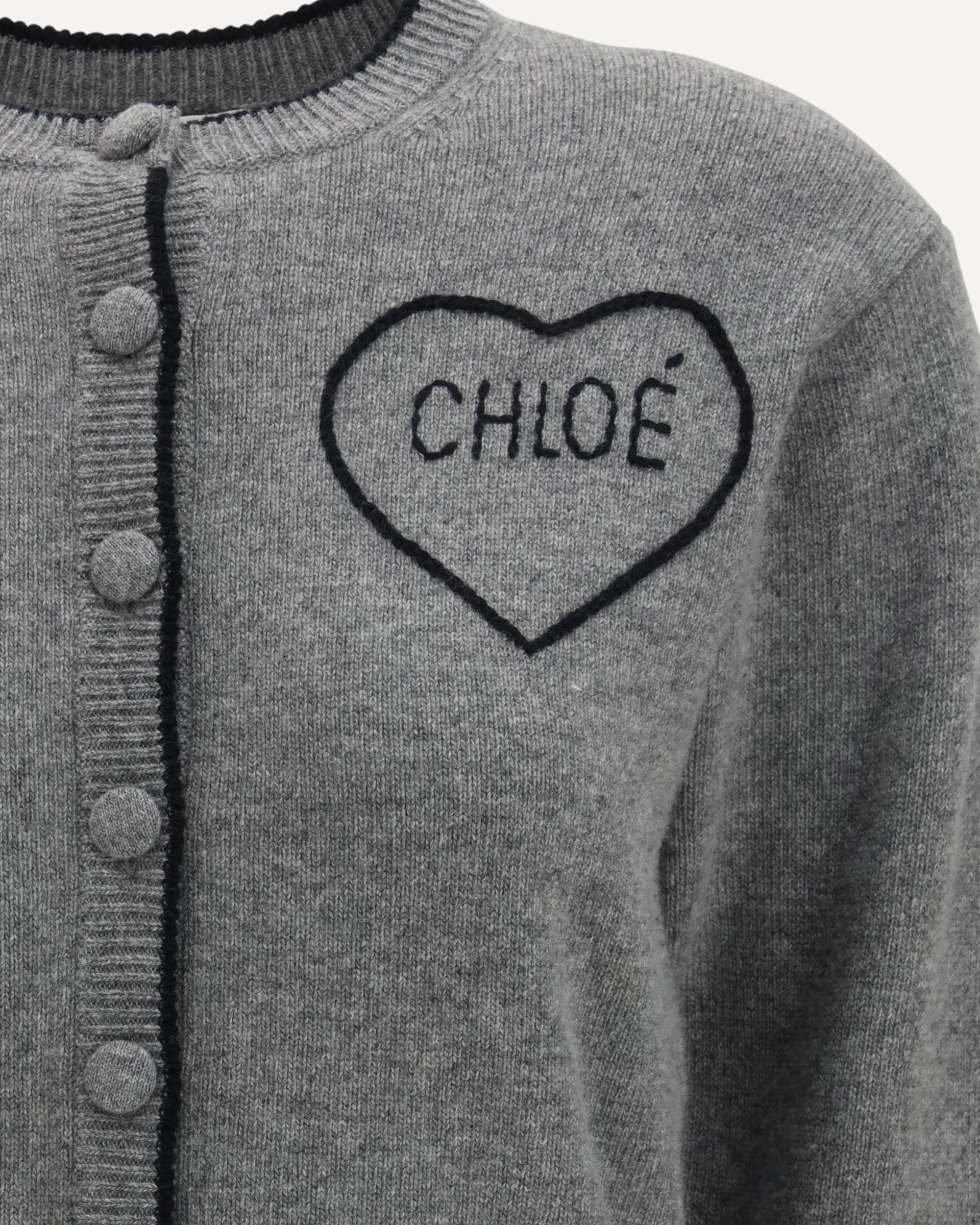 The fitted logo Cardigan by Chloé is crafted from ribbed wool and cashmere knit, featuring a refined crew neck and contrasting trims that define its silhouette. The front fastening is detailed with fabric-covered buttons, while the embroidered Chloé logo on the chest—framed by a heart—adds a distinctive and romantic touch to the design.