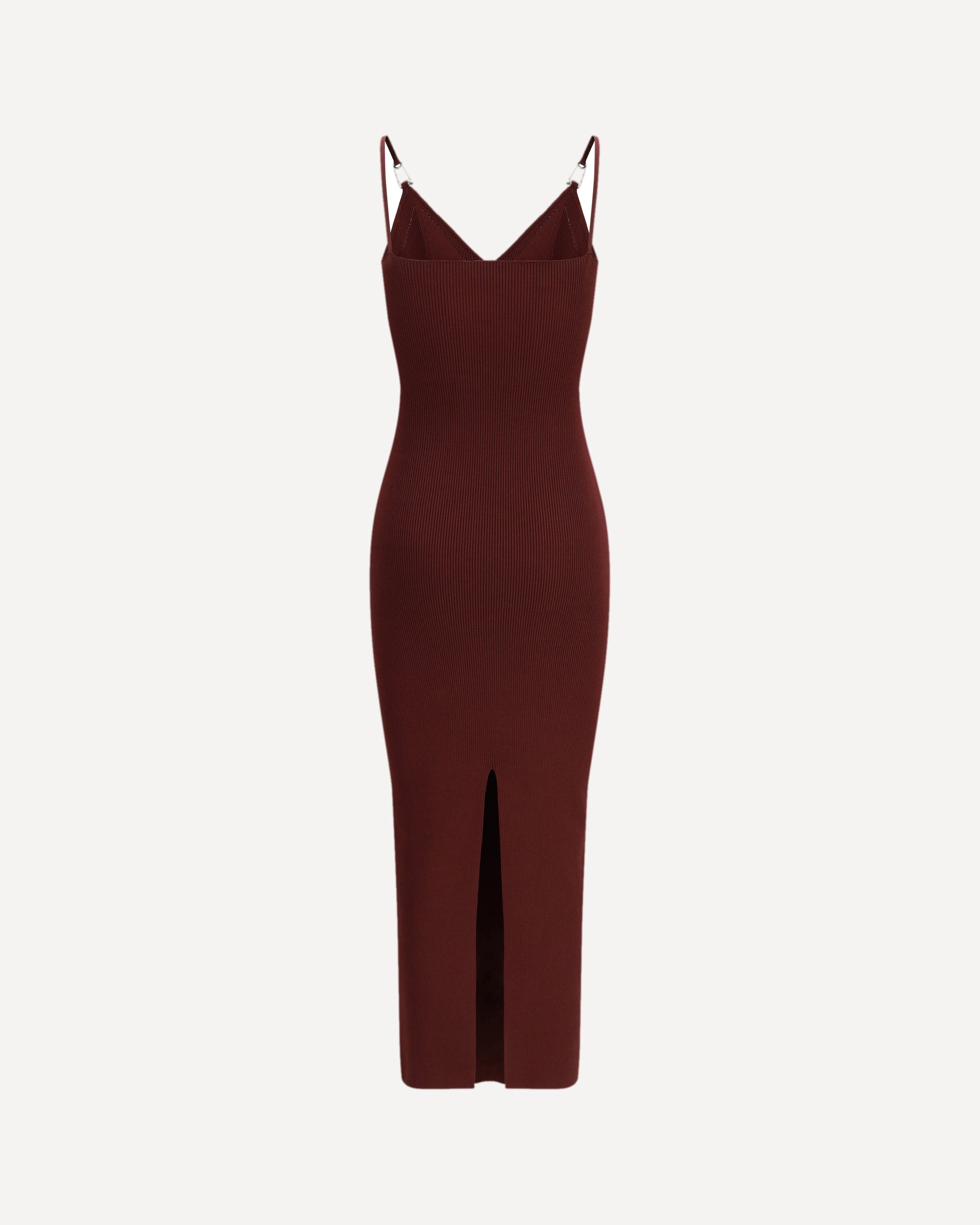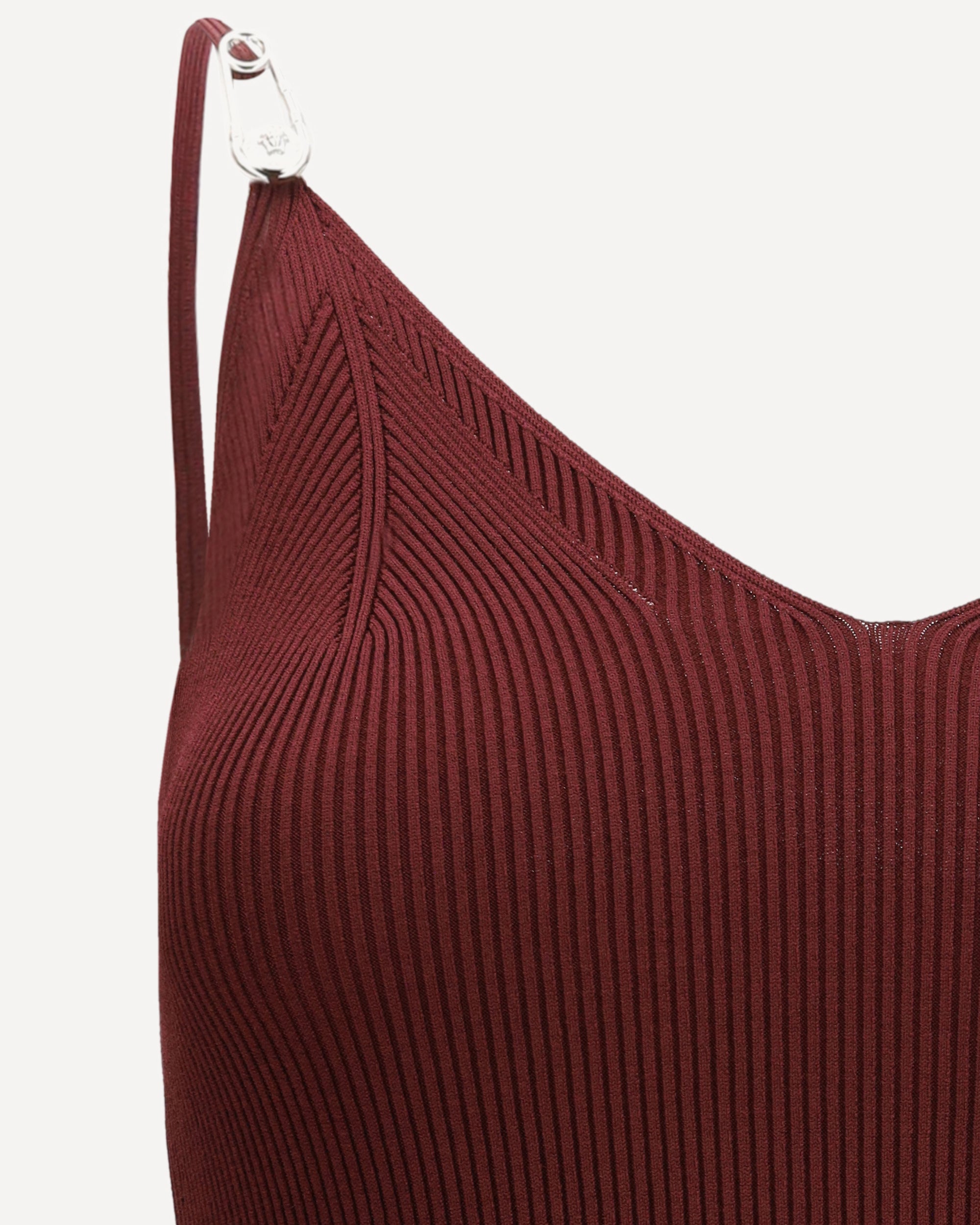 The Safety Pin Slip Midi Dress by Versace features a fitted line crafted from stretch viscose knit, offering a controlled, body-skimming elasticity. The V-neckline is cleanly defined, while the ribbed texture adds structure and maintains a streamlined appearance. The Safety Pin detail and the Medusa Head motif introduce the house’s signature elements with subtle precision. A rear slit allows ease of movement, completing a silhouette designed for modern, effortless elegance.