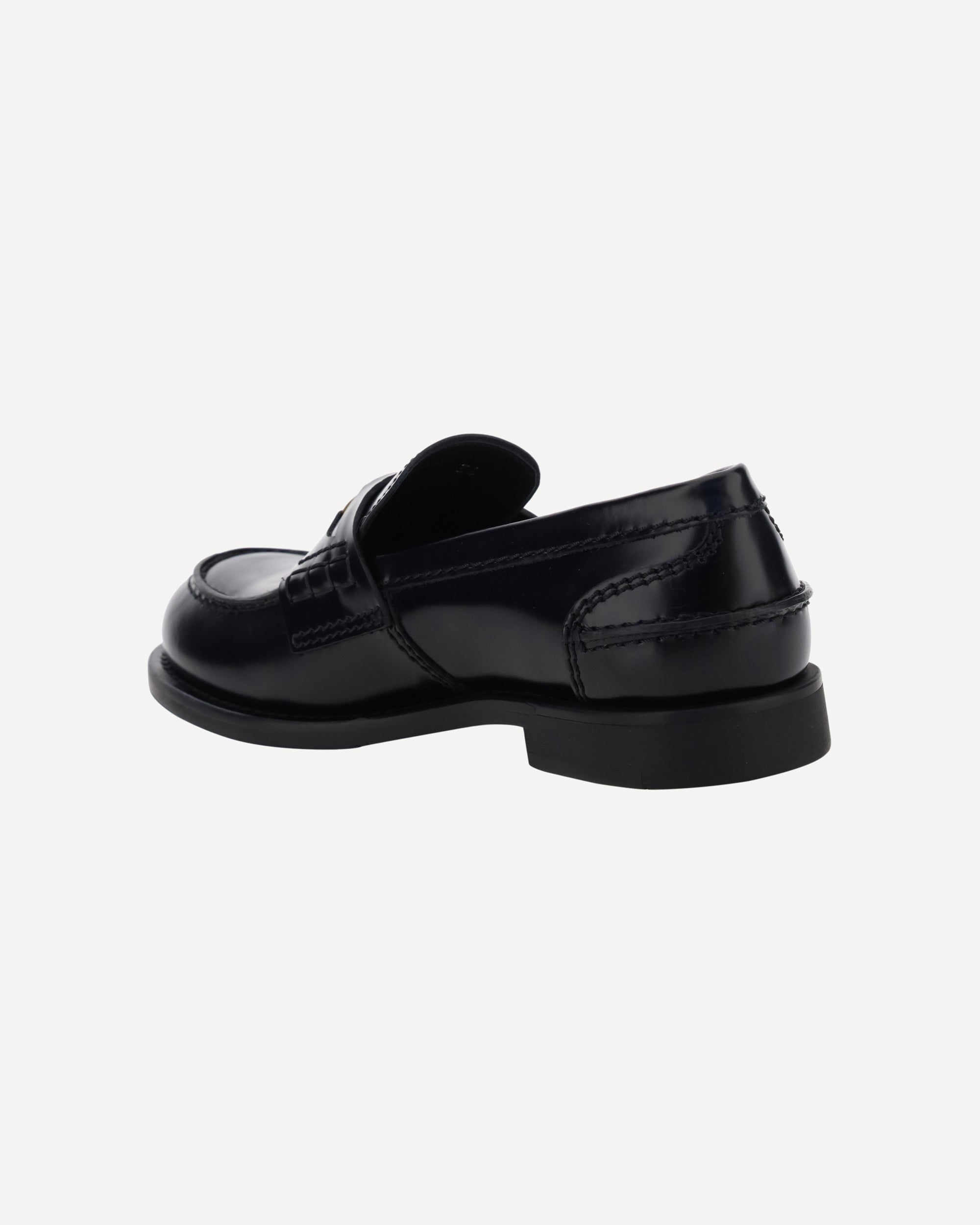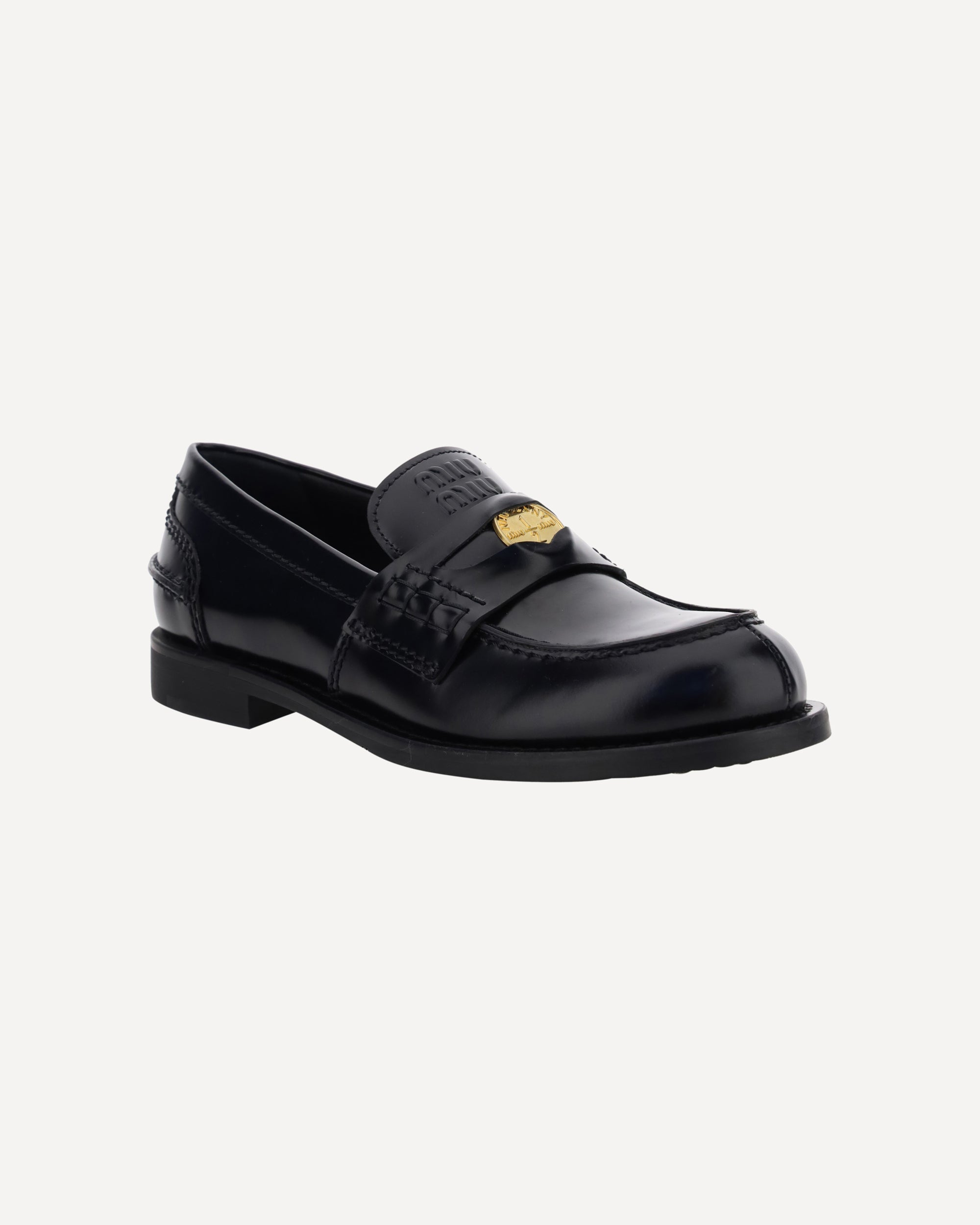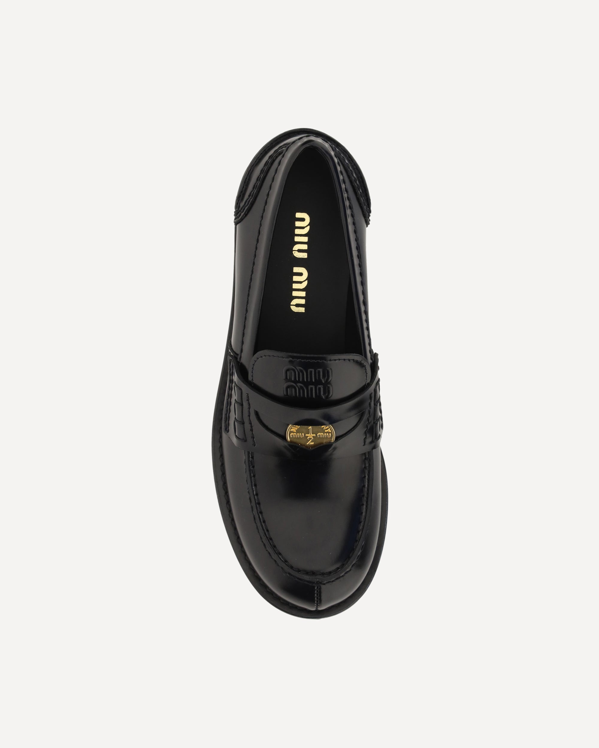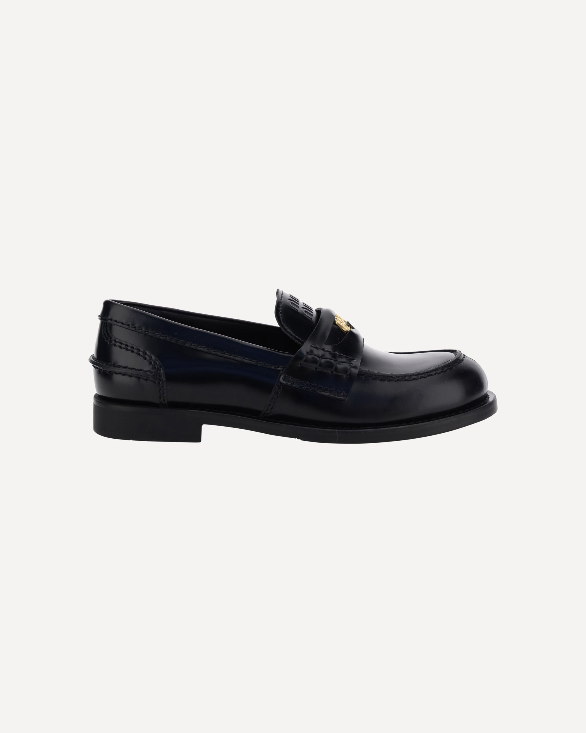 Miu Miu's leather penny Loafers reinterpret a wardrobe classic with a contemporary twist. Featuring a round toe and traditional front band, they feature the brand's embossed tone-on-tone logo and a contrasting coin detail set into the band, adding a distinctive element. The design is completed with a contrasting logoed insole and carefully crafted workmanship for a sophisticated, modern style.