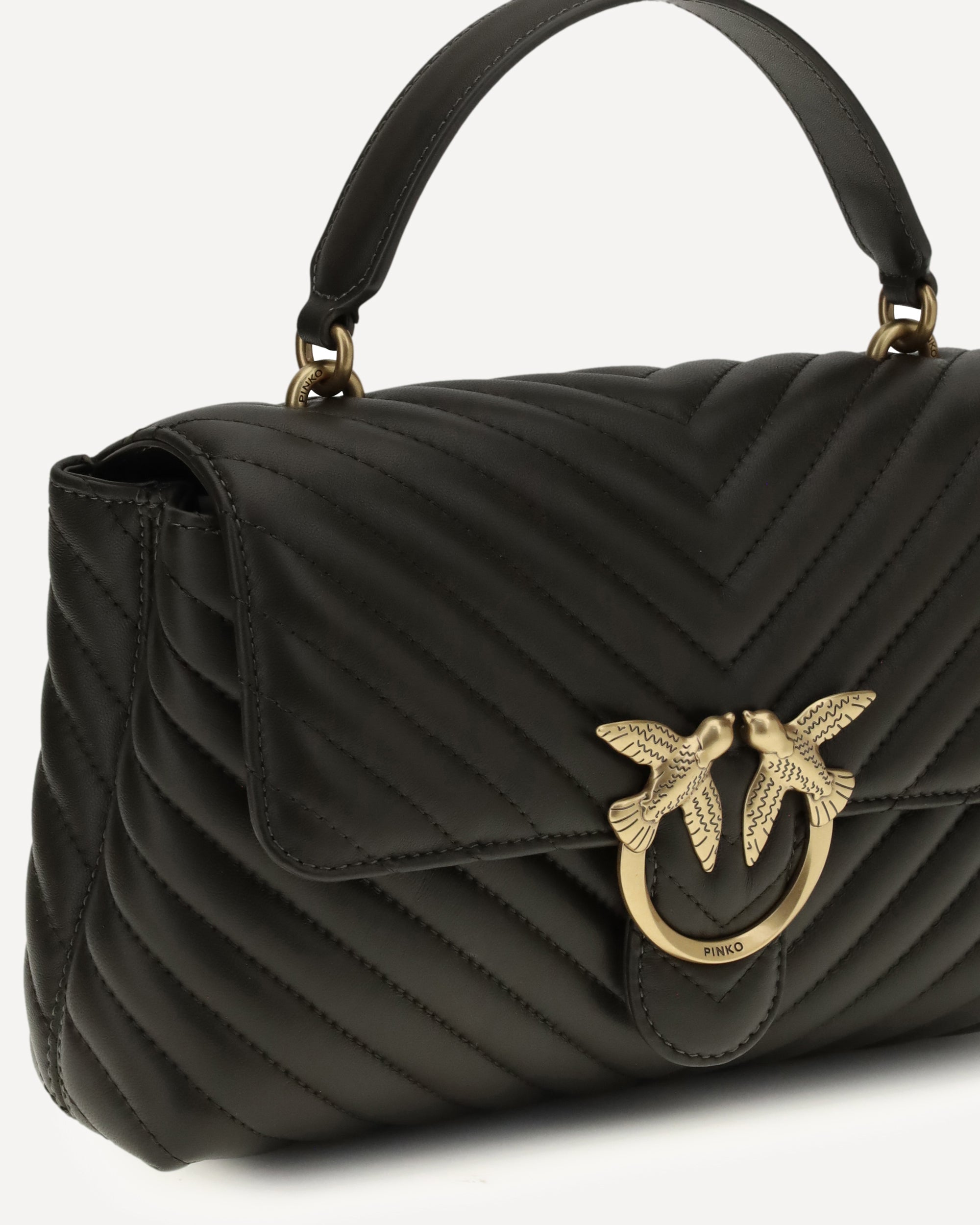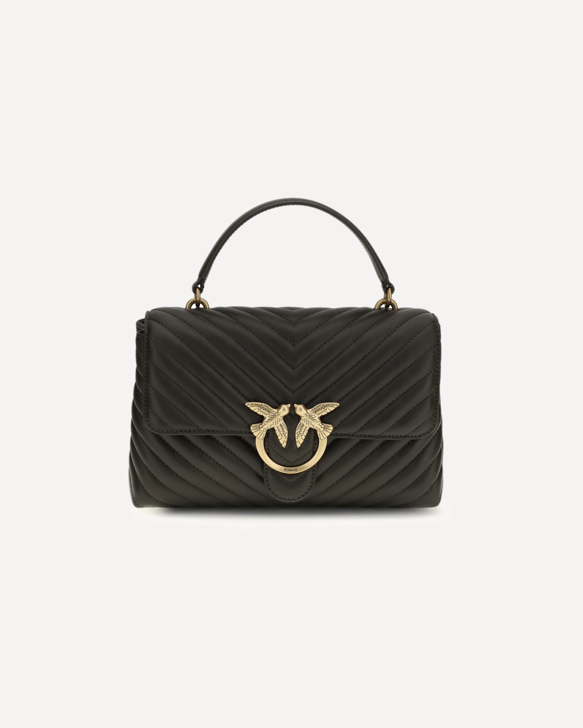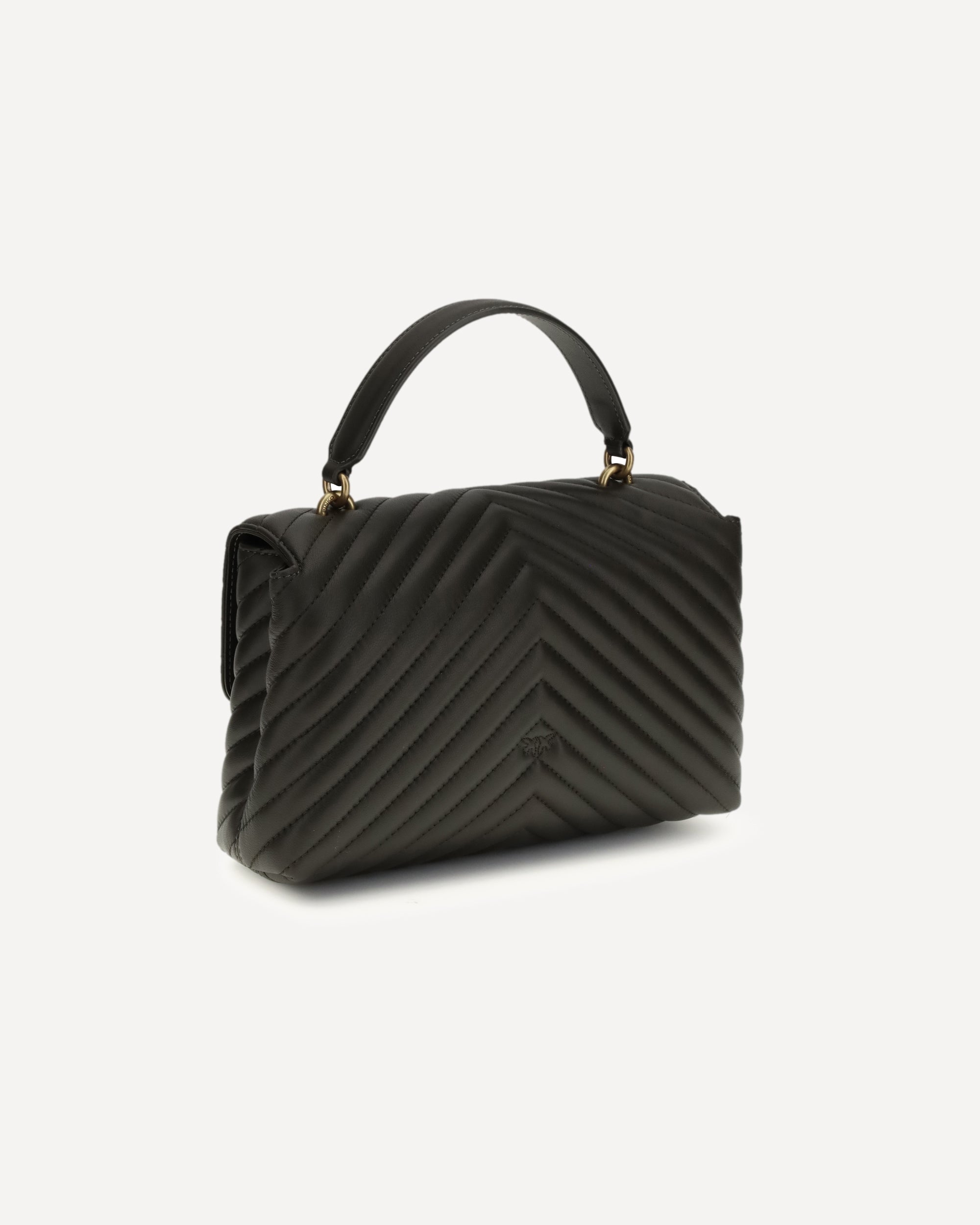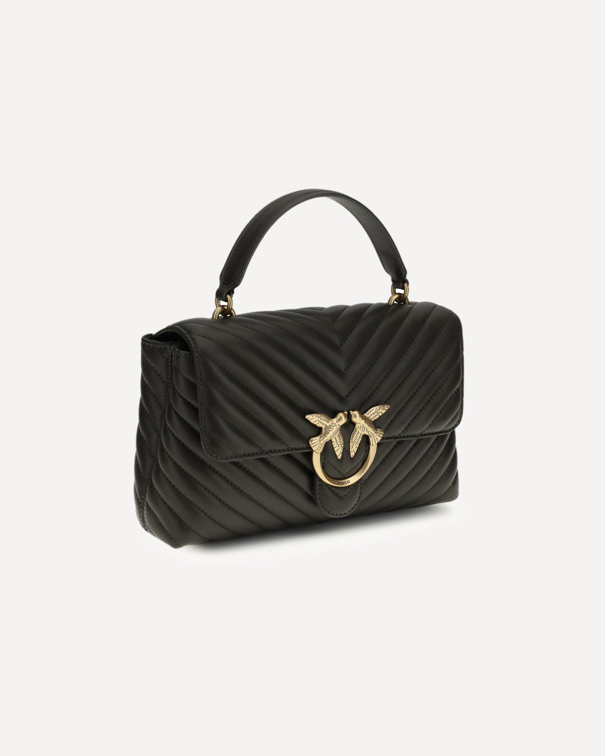 The Calfskin Love Lady Handbag by Pinko, front magnetic button closure, iconic gold-plated and embossed Love Birds logo on front, quilted and padded design, double interior compartment, sliding chain shoulder strap, flat rigid handle at top, interior flat pocket with zipper, iconic tone-on-tone embroidered brand monogram on back.