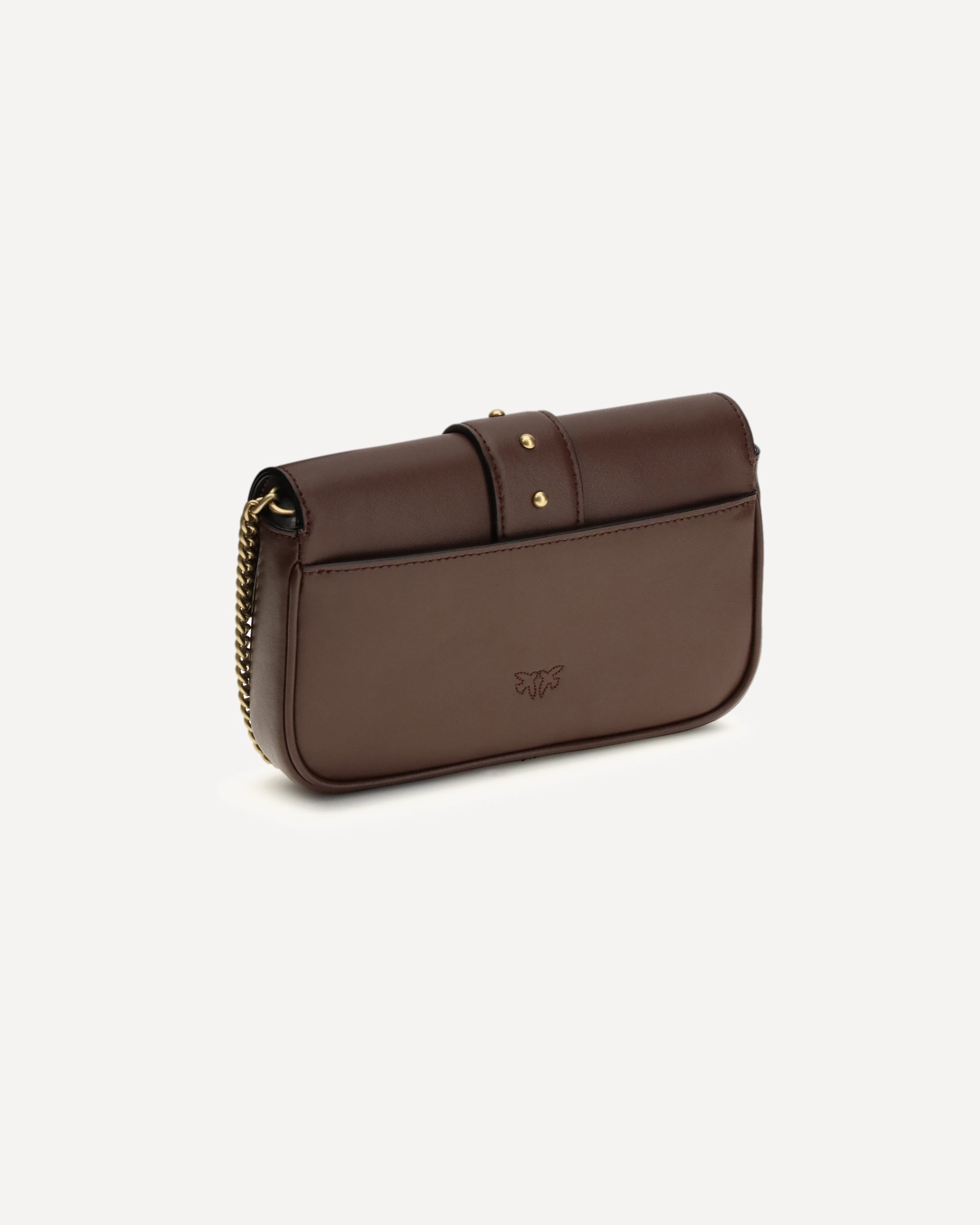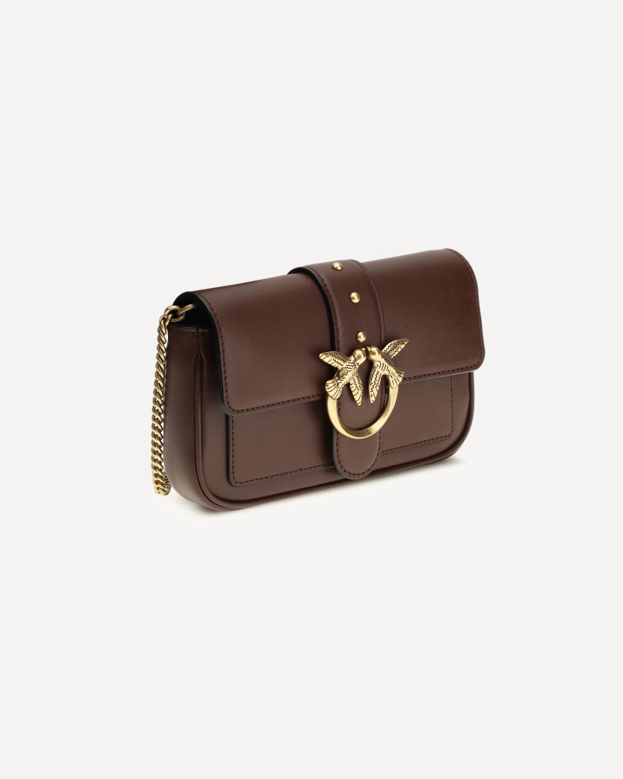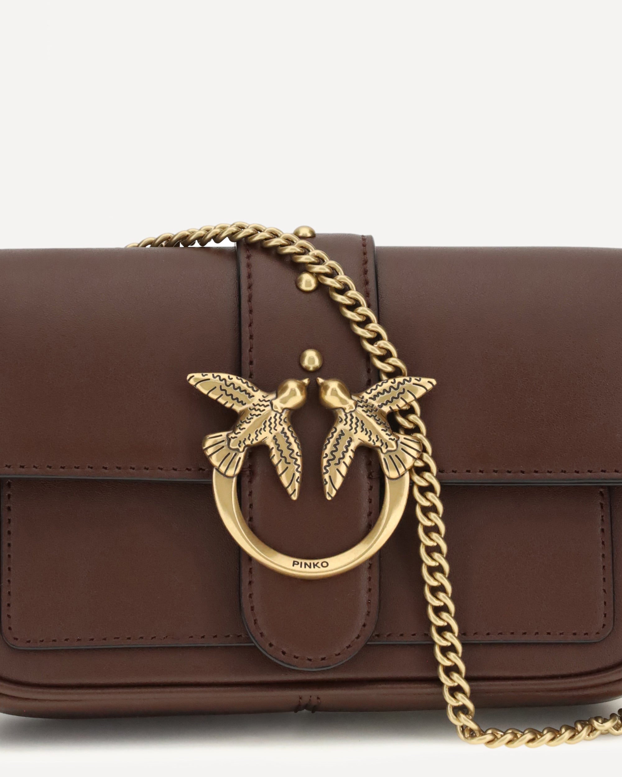 The Calfskin Love One Shoulder Bag by Pinko, interlocking front fastening, adjustable and sliding chain shoulder strap, iconic Love Birds buckle embossed on the front, double internal compartment, internal zipped pocket, flat card pocket, iconic tone-on-tone embroidered brand monogram on the back.