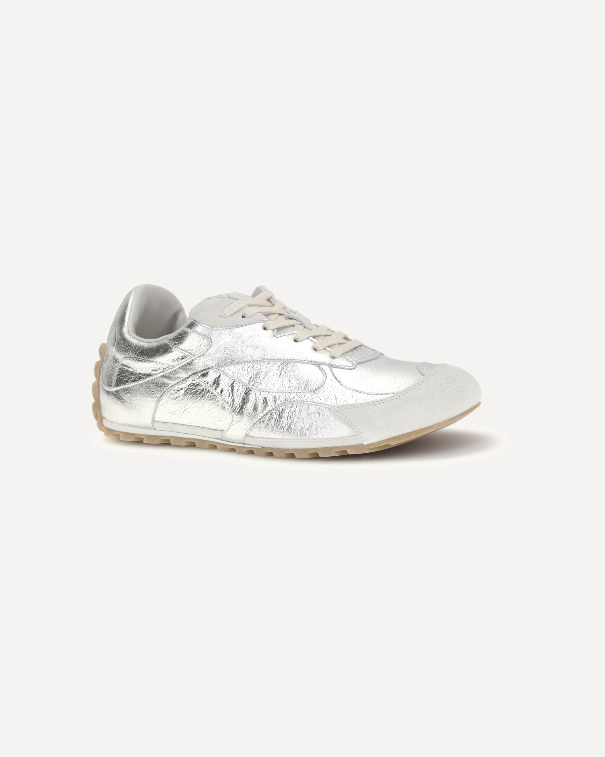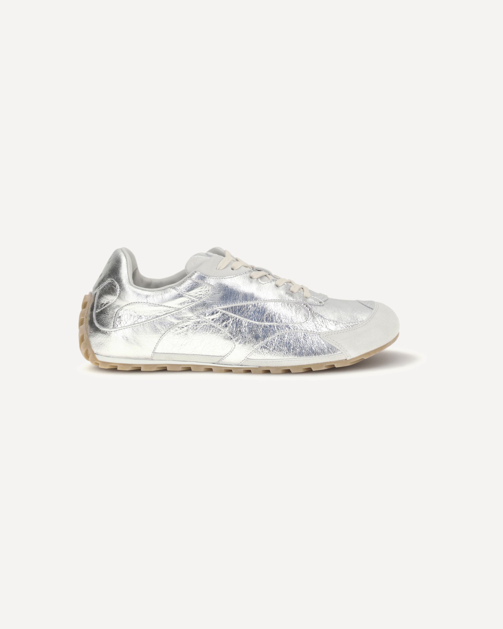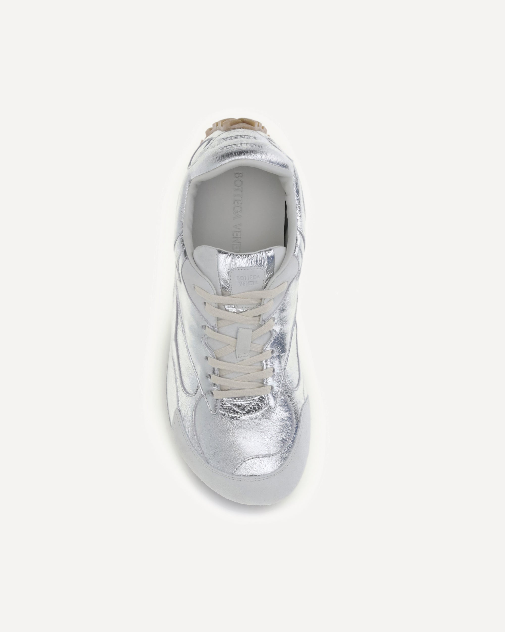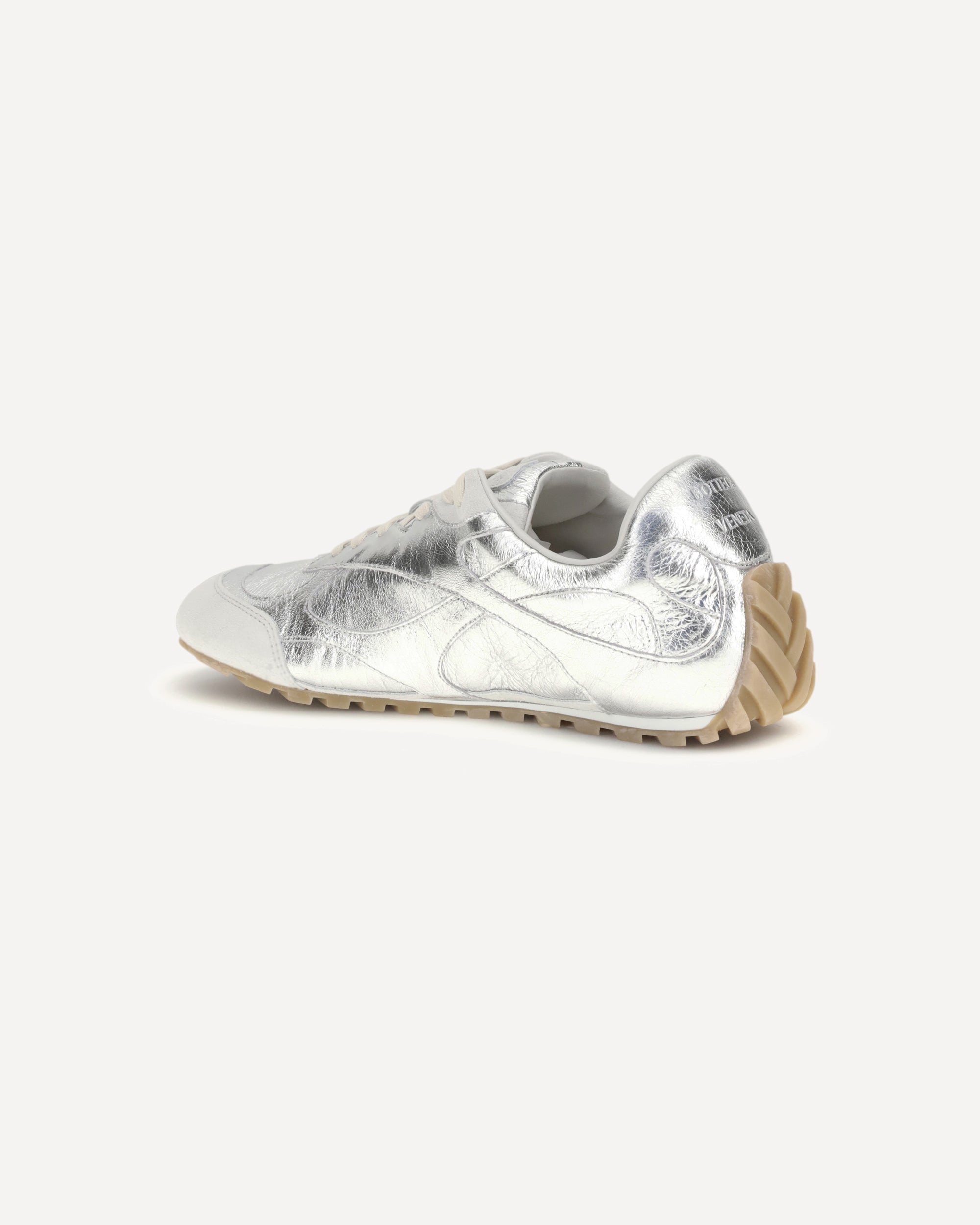 The Orbit Flash Sneakers by Bottega Veneta reinterpret sporty design with a touch of luxury. Made of laminated leather with suede trim, they feature a low, lace-up silhouette with a modern profile. The soft lambskin lining ensures comfort and a snug fit, while the refined details express the Maison's contemporary elegance.