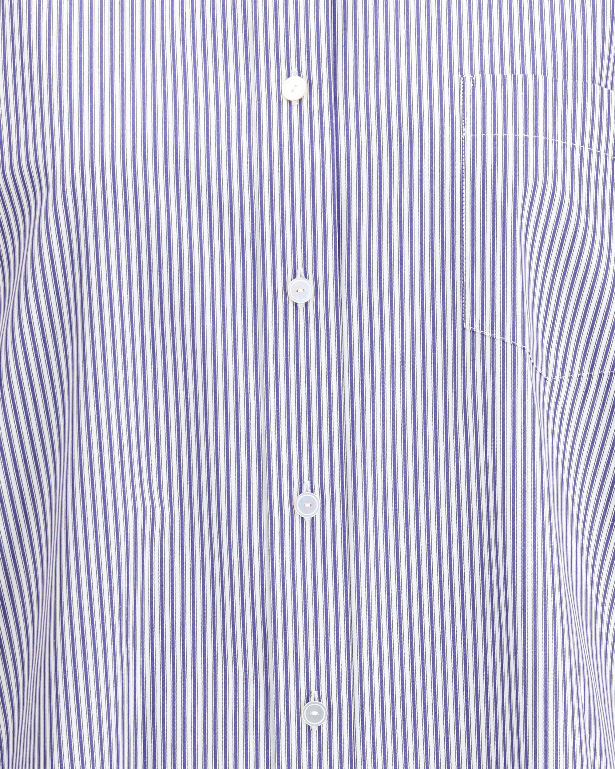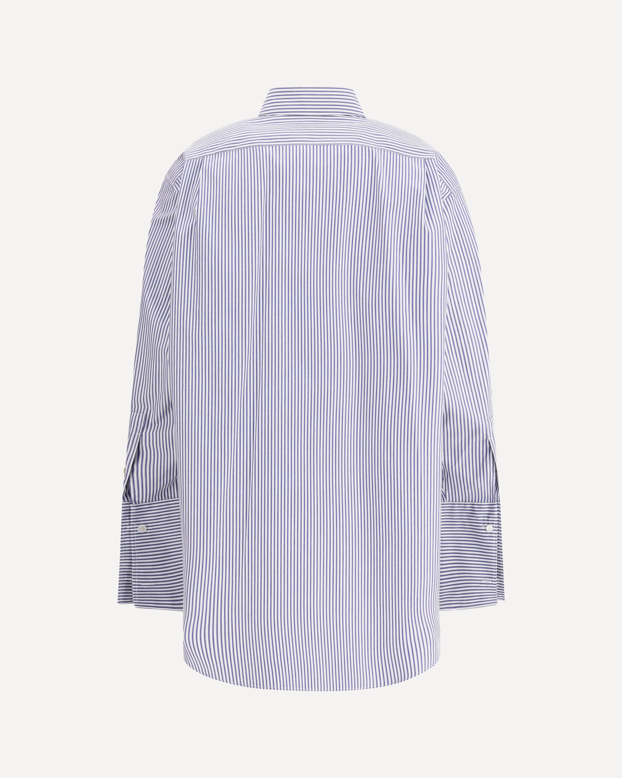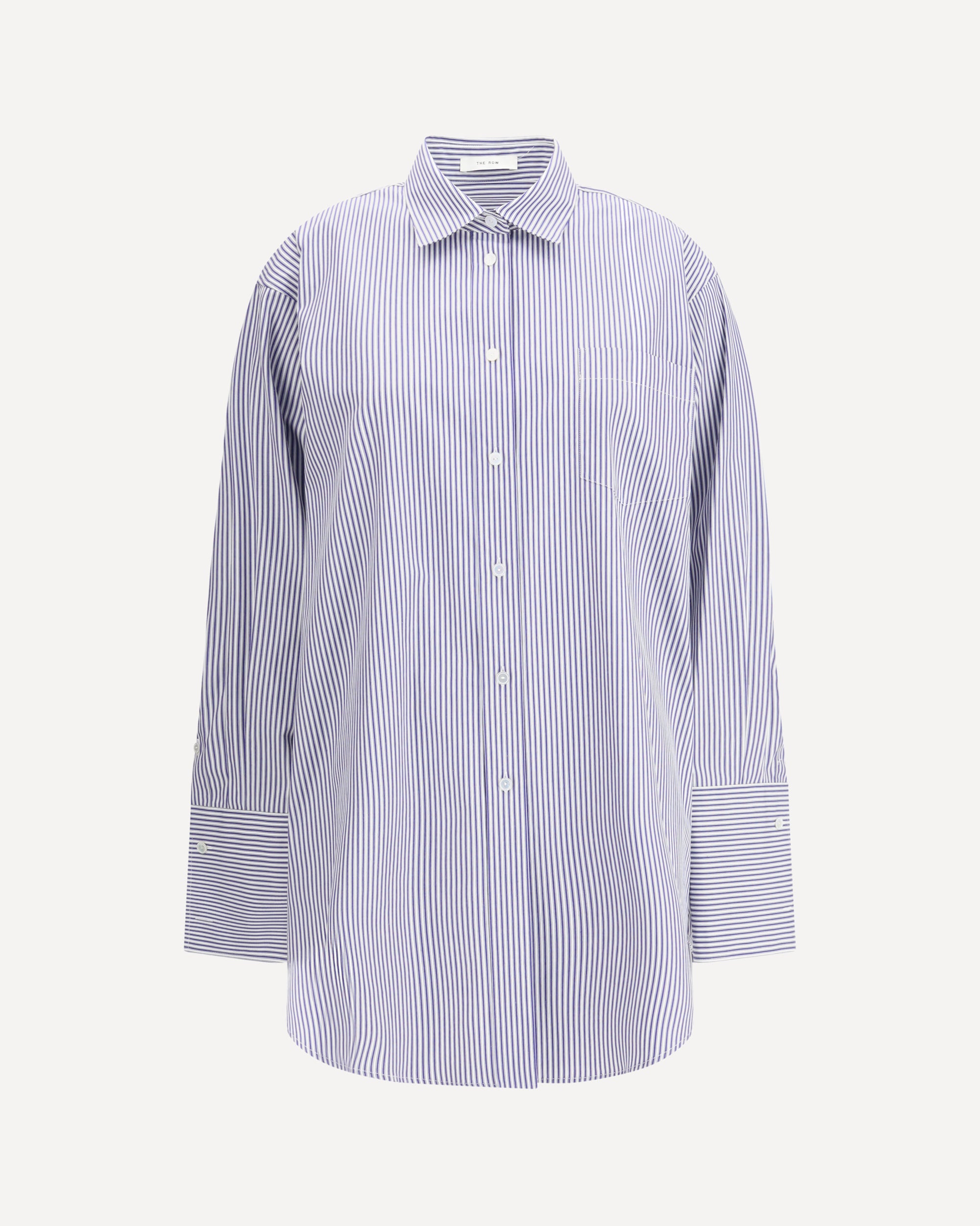 The Ment Shirt by The Row is a sophisticated reinterpretation of the classic men's shirt. Made of fine striped Japanese poplin, it stands out for its essential cut and attention to detail: patch pocket on the chest, elongated cuffs and exposed front buttoning with mother-of-pearl buttons. An iconic garment with an understated and impeccable style, an emblem of the brand's understated elegance.