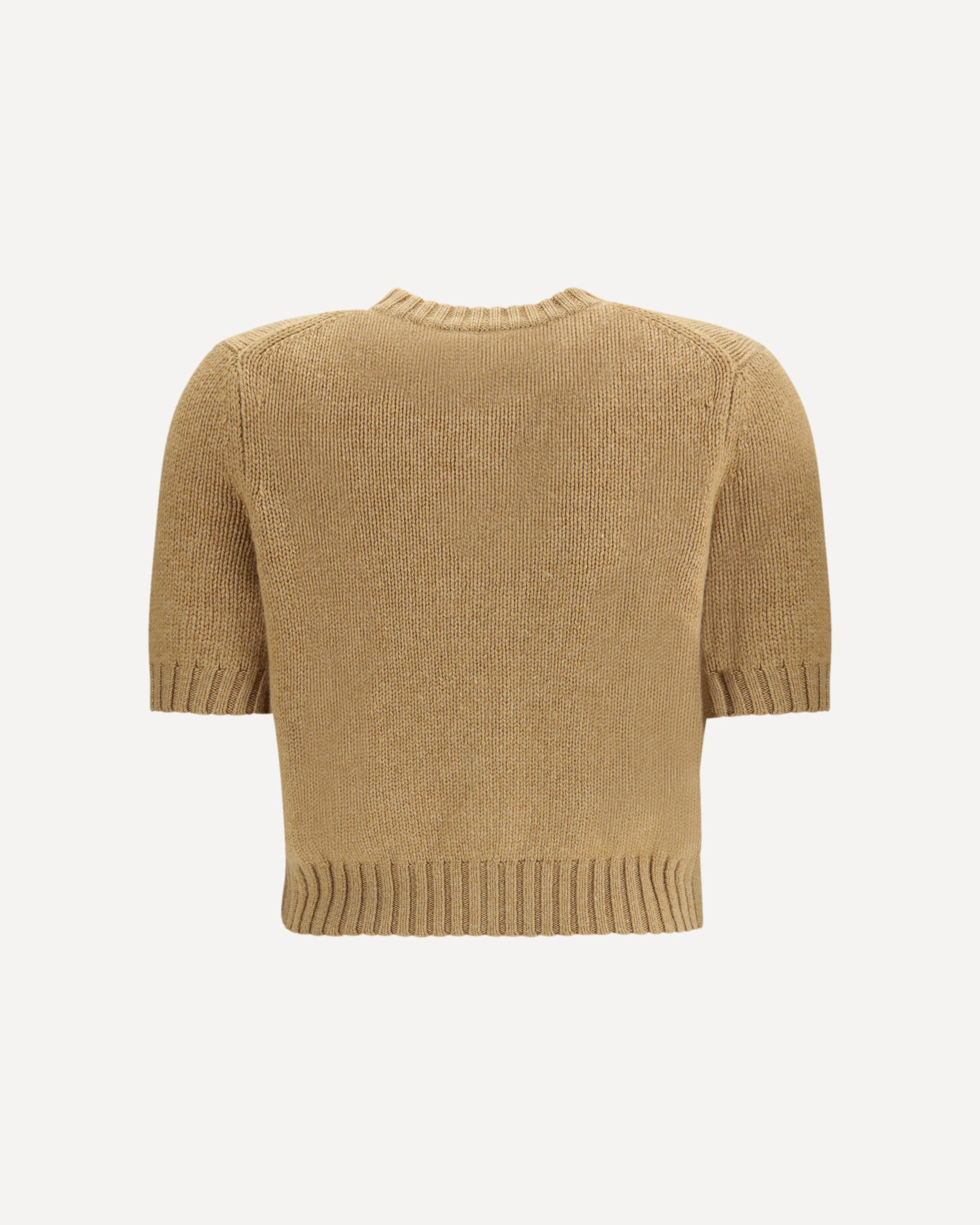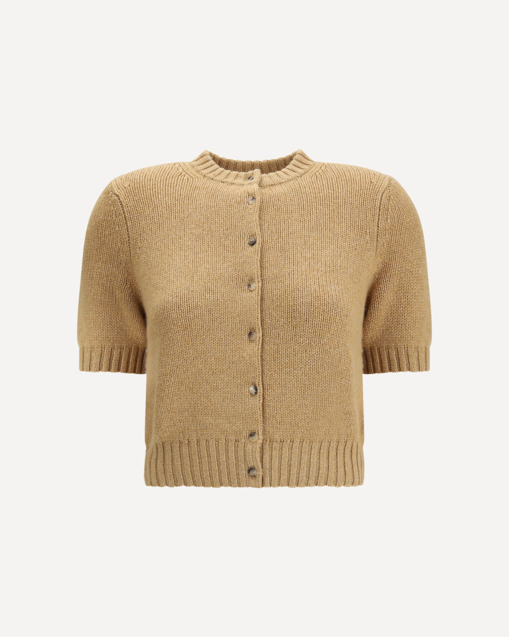 The Nora cropped Cardigan by Khaite is crafted from a soft cashmere blend, combining comfort and understated luxury. Designed with short sleeves and a front button closure, it features ribbed trims along the neckline, sleeves, and hem for a structured, refined finish.