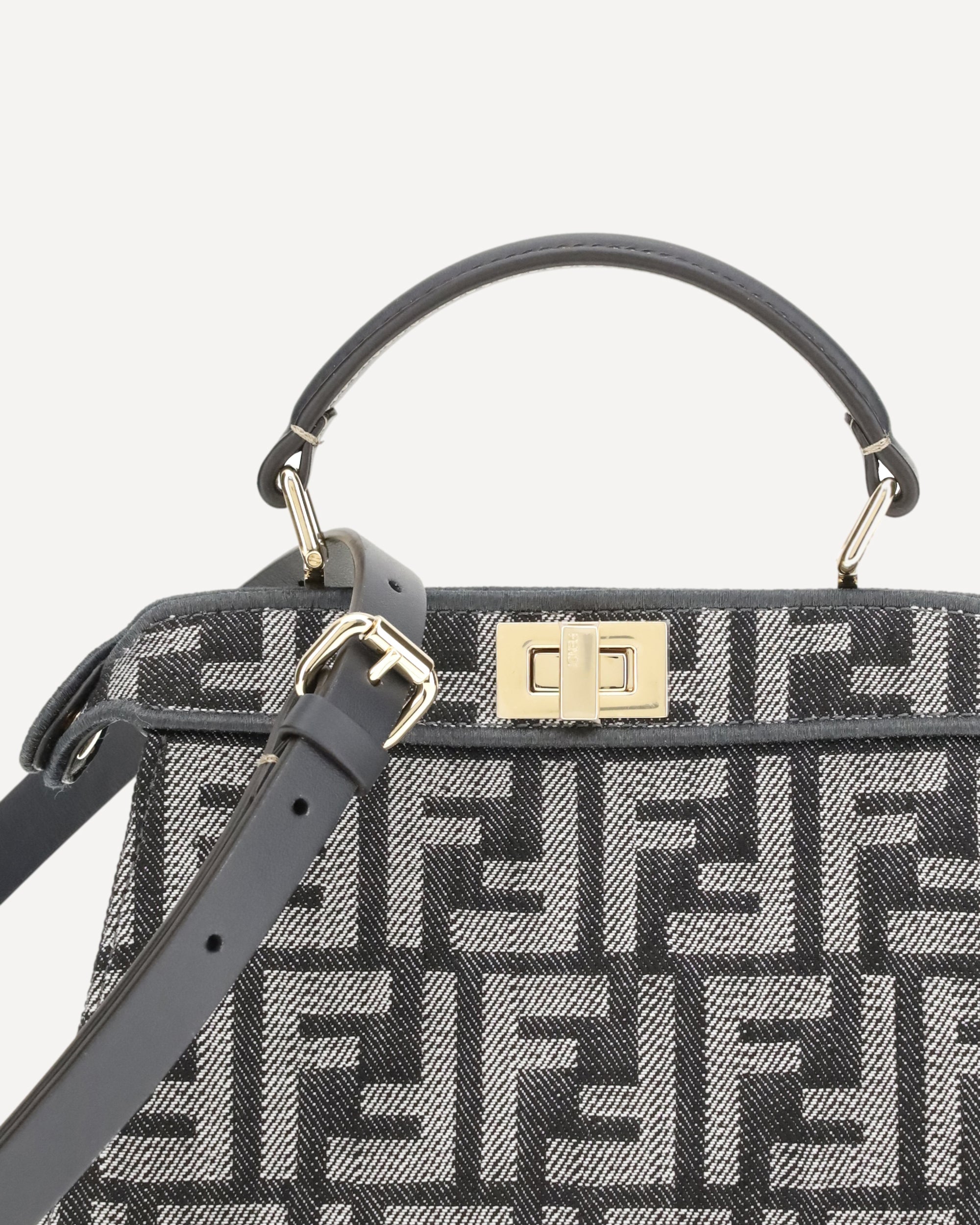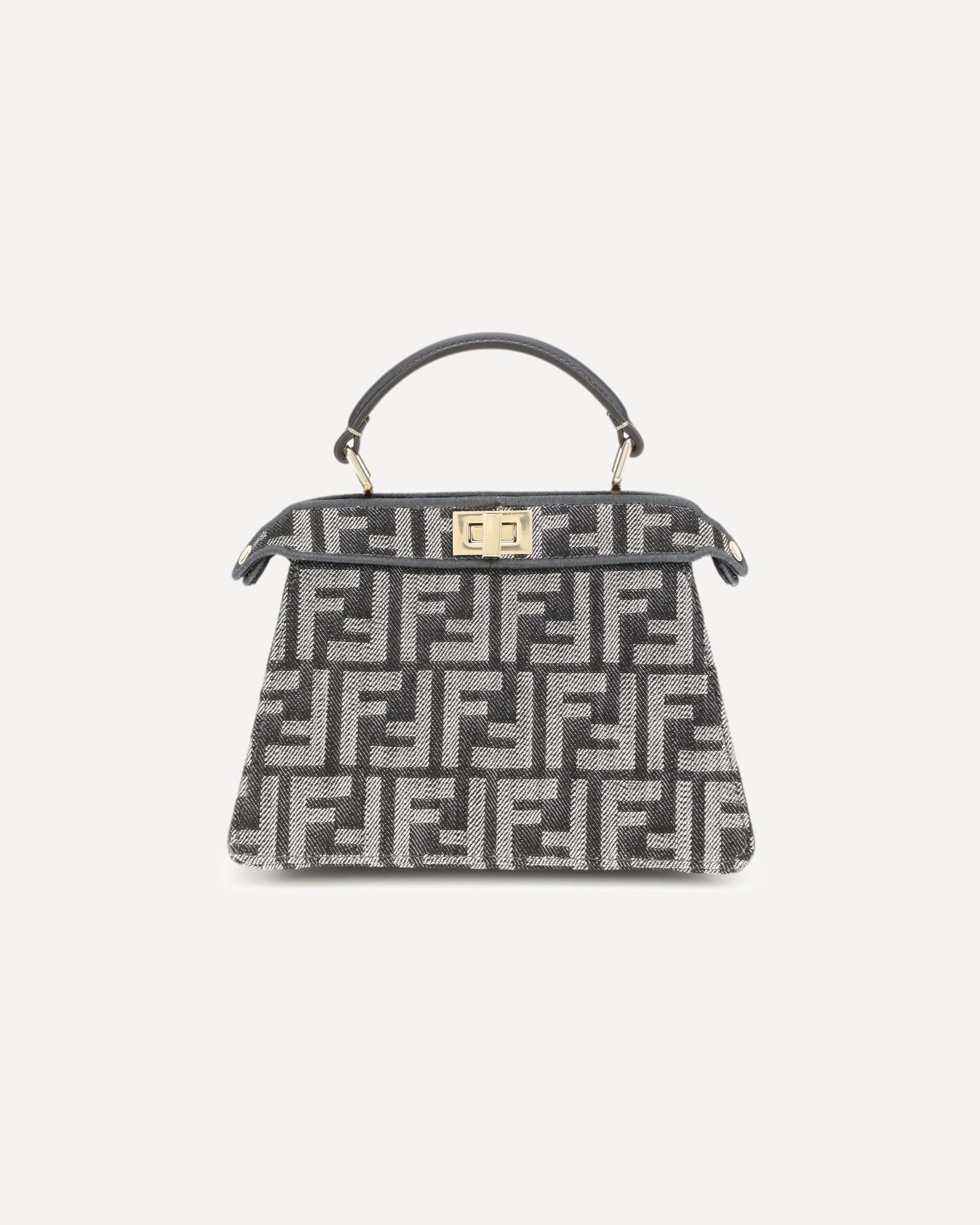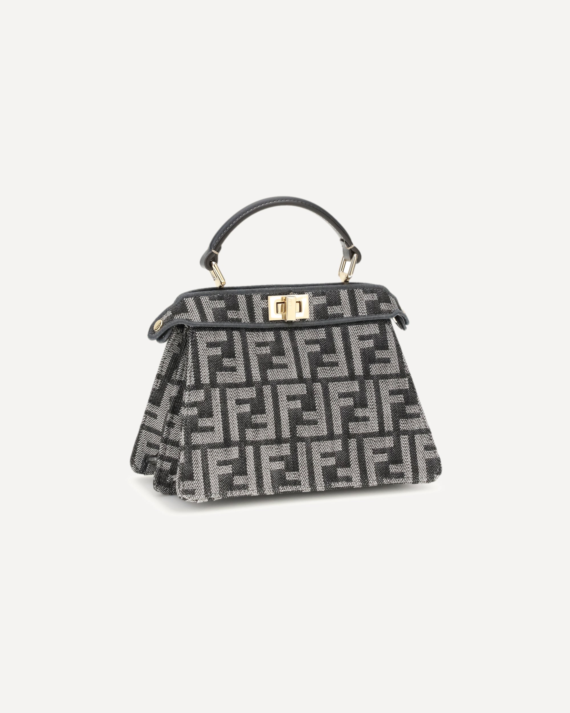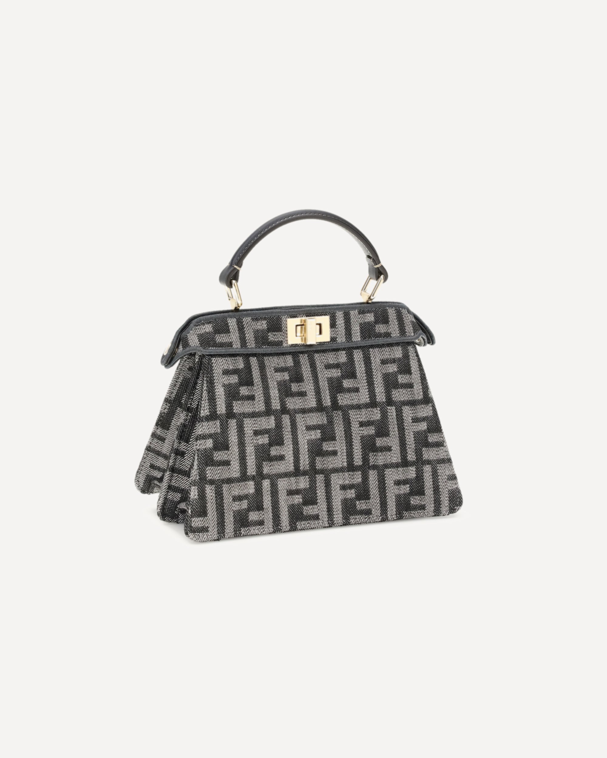 The Peekaboo ISeeU Handbag by Fendi, made of fabric with the distinctive FF pattern, is distinguished by its silky texture and pony-effect calfskin-lined interior with Fendi Leo print. Featuring two separate compartments and an inside pocket, it offers ample space to organize your belongings. The swivel closure on both sides adds a touch of sophistication, completing the elegant and functional design.