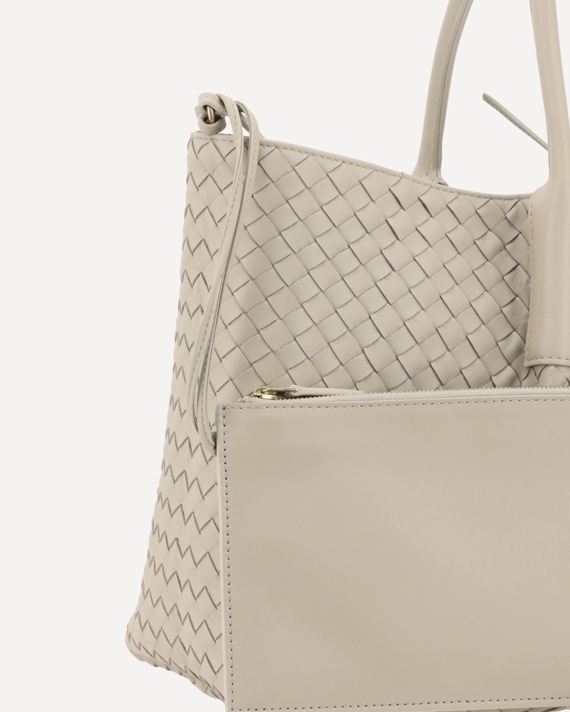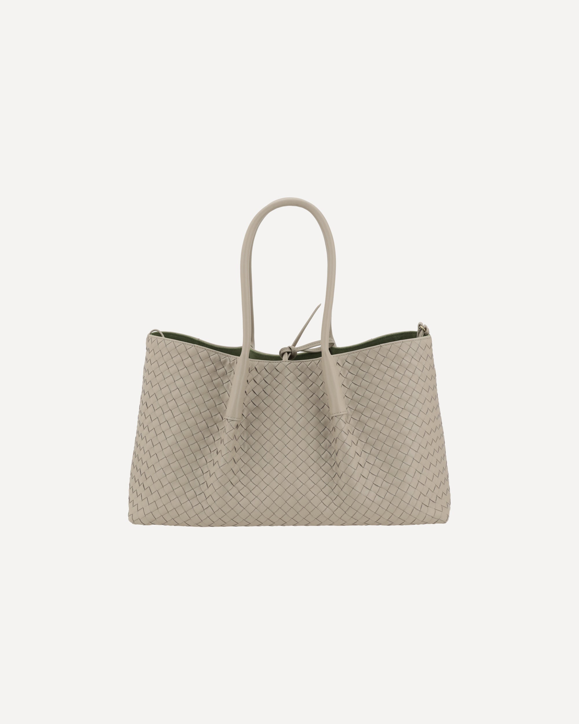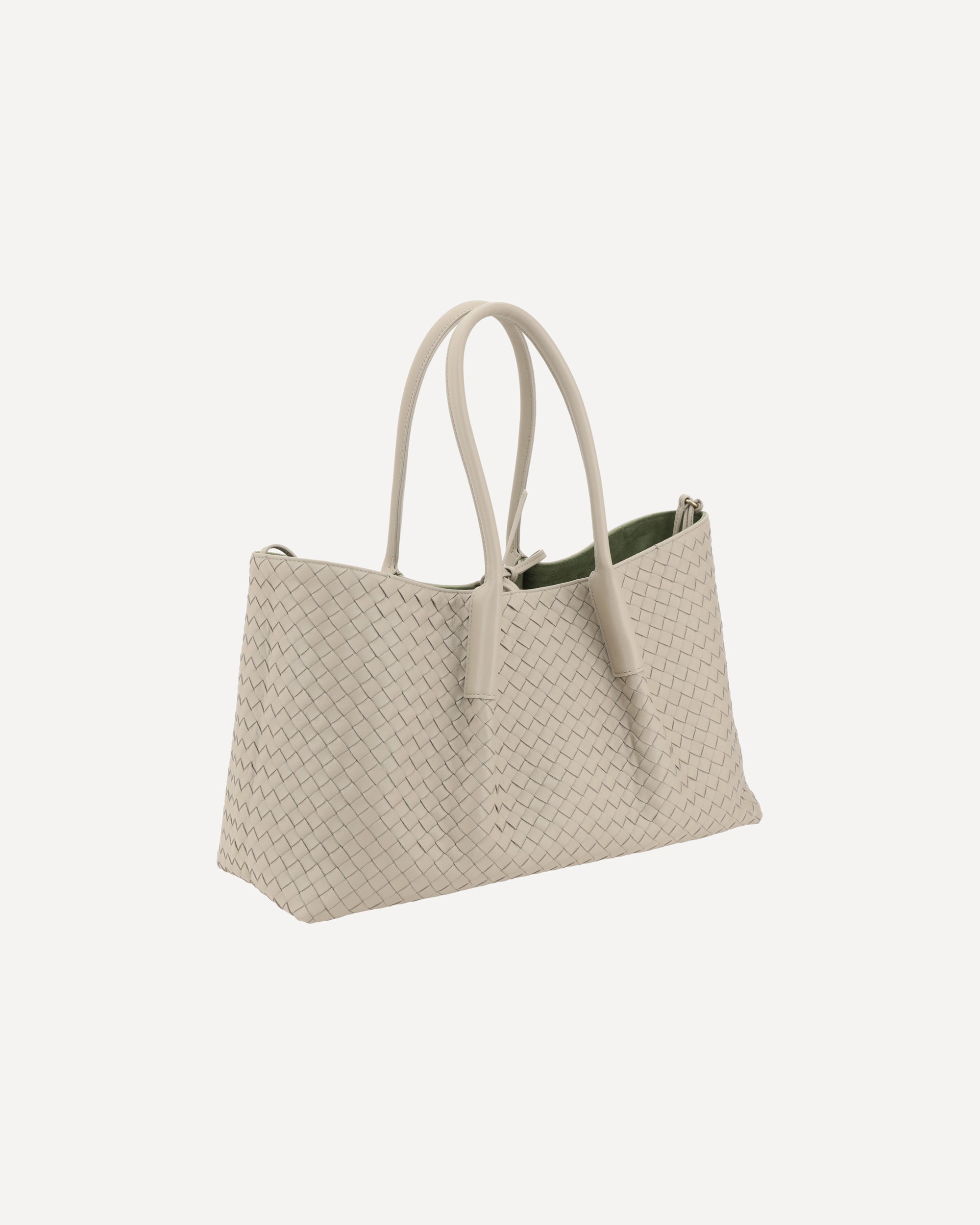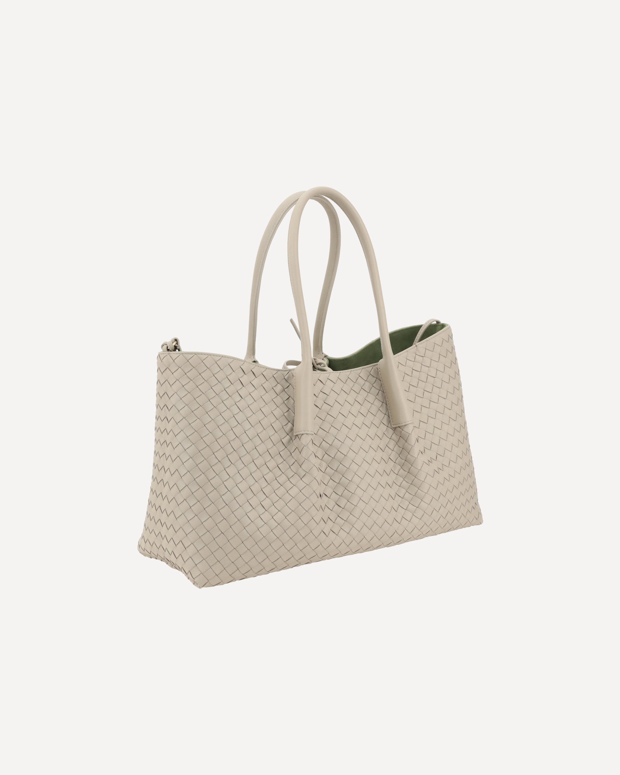 Bottega Veneta's Pinacoteca leather Tote Bag features two top handles for convenient carrying. The self-tie ribbon closure at the top lends an elegant and refined touch. The design is enhanced by the brand's iconic all-over weave. Inside, there is an internal zippered pouch to organize smaller items, while the bag offers single internal compartment for added convenience.
