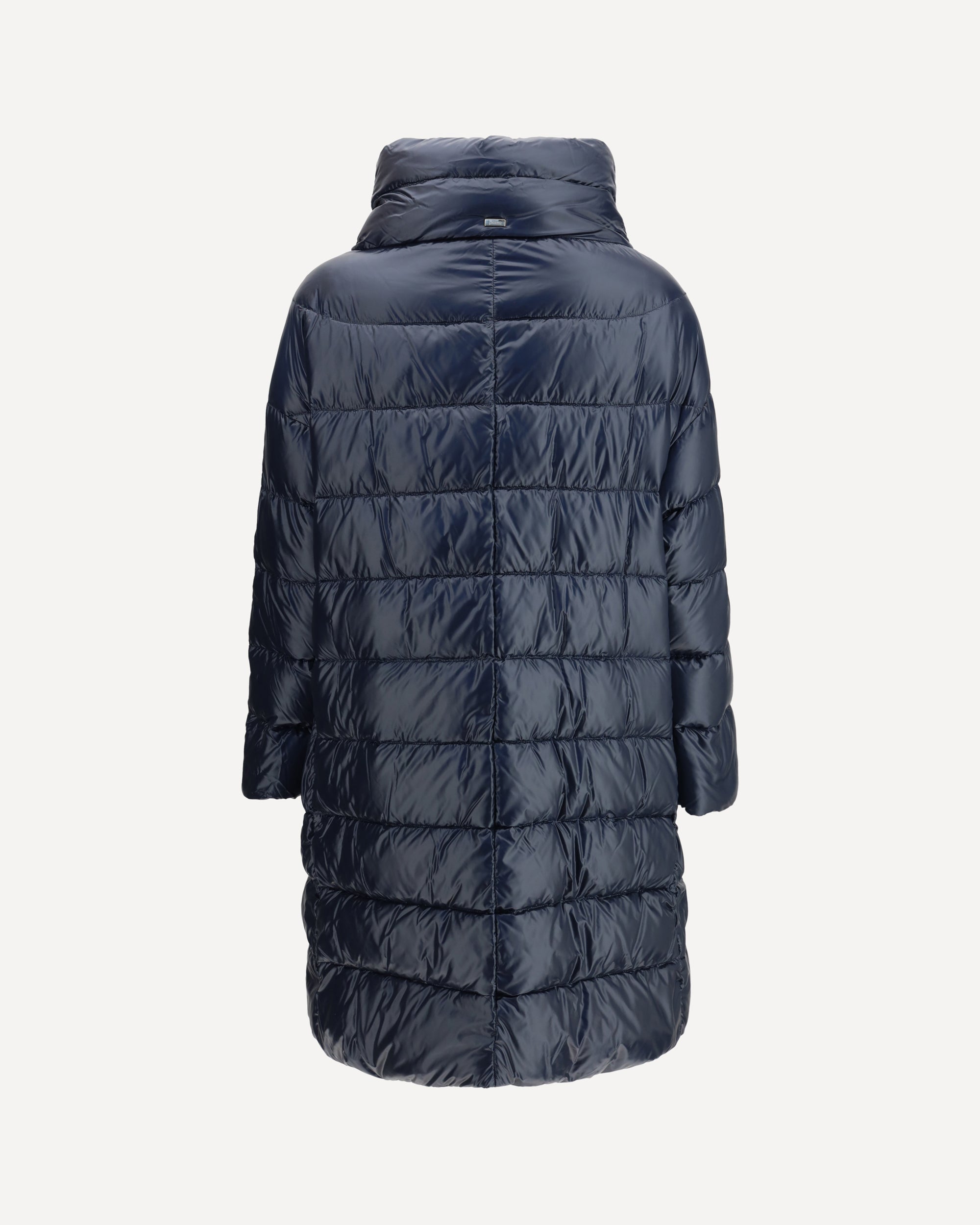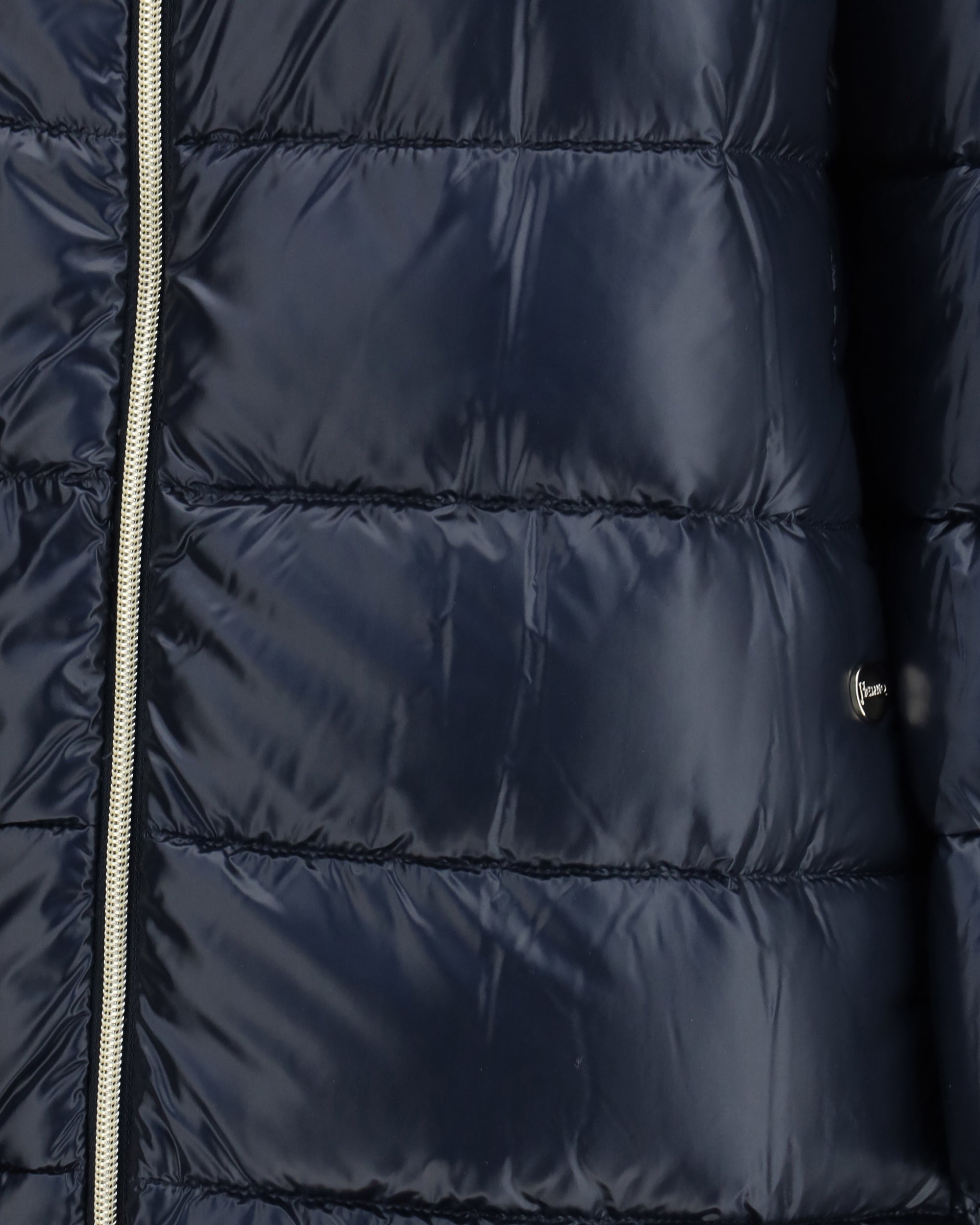 The Midi Down Jacket by Herno is a stylish and functional outerwear designed to face the cold months in style. Featuring a midi model with a high collar and front closure with a double-slider zipper, it provides protection and practicality. The all-over quilted and padded design, combined with the monochrome pattern, gives a clean and sophisticated aesthetic. Two side welt pockets and a loose fit complete the garment, ideal for snug comfort without sacrificing elegance.