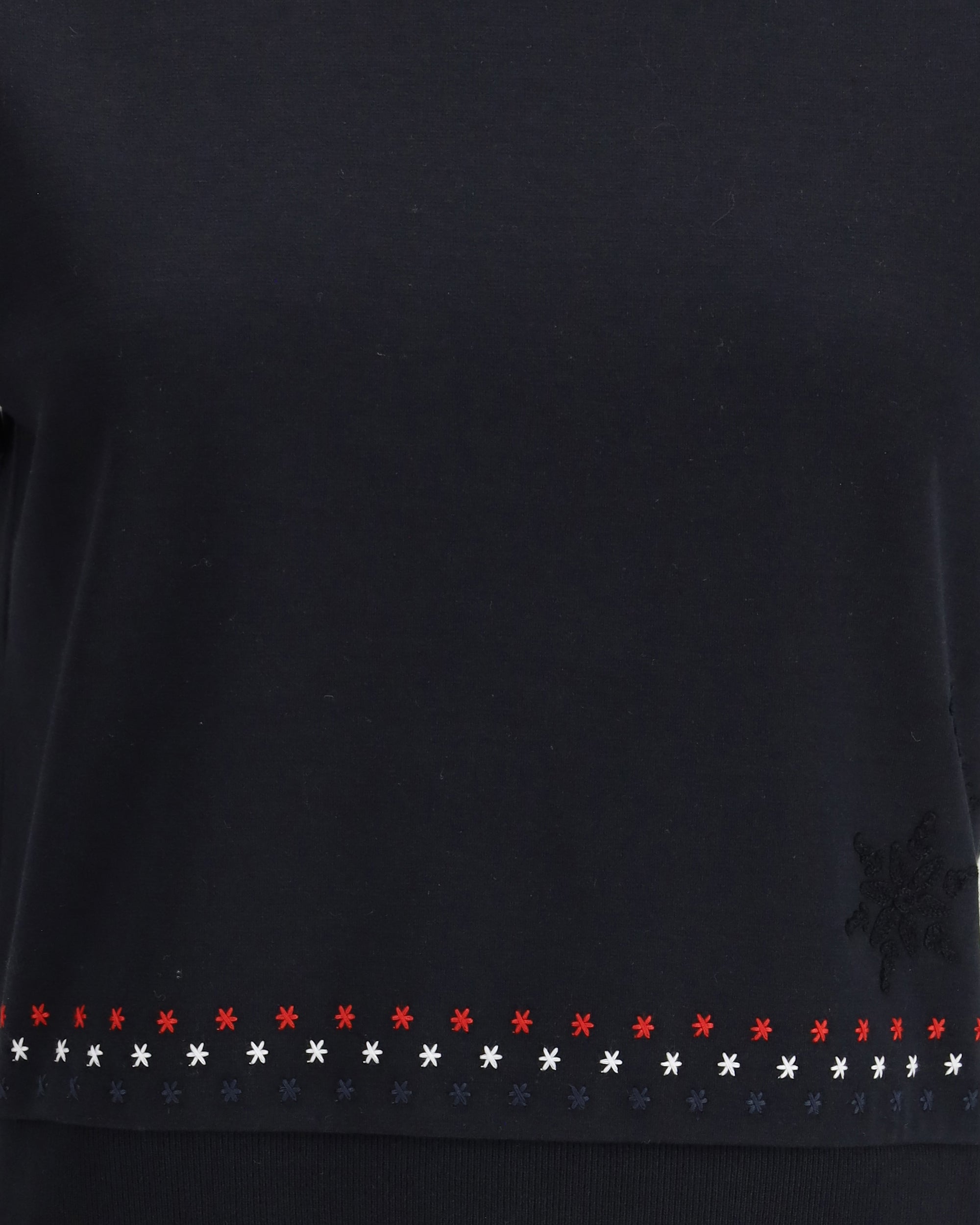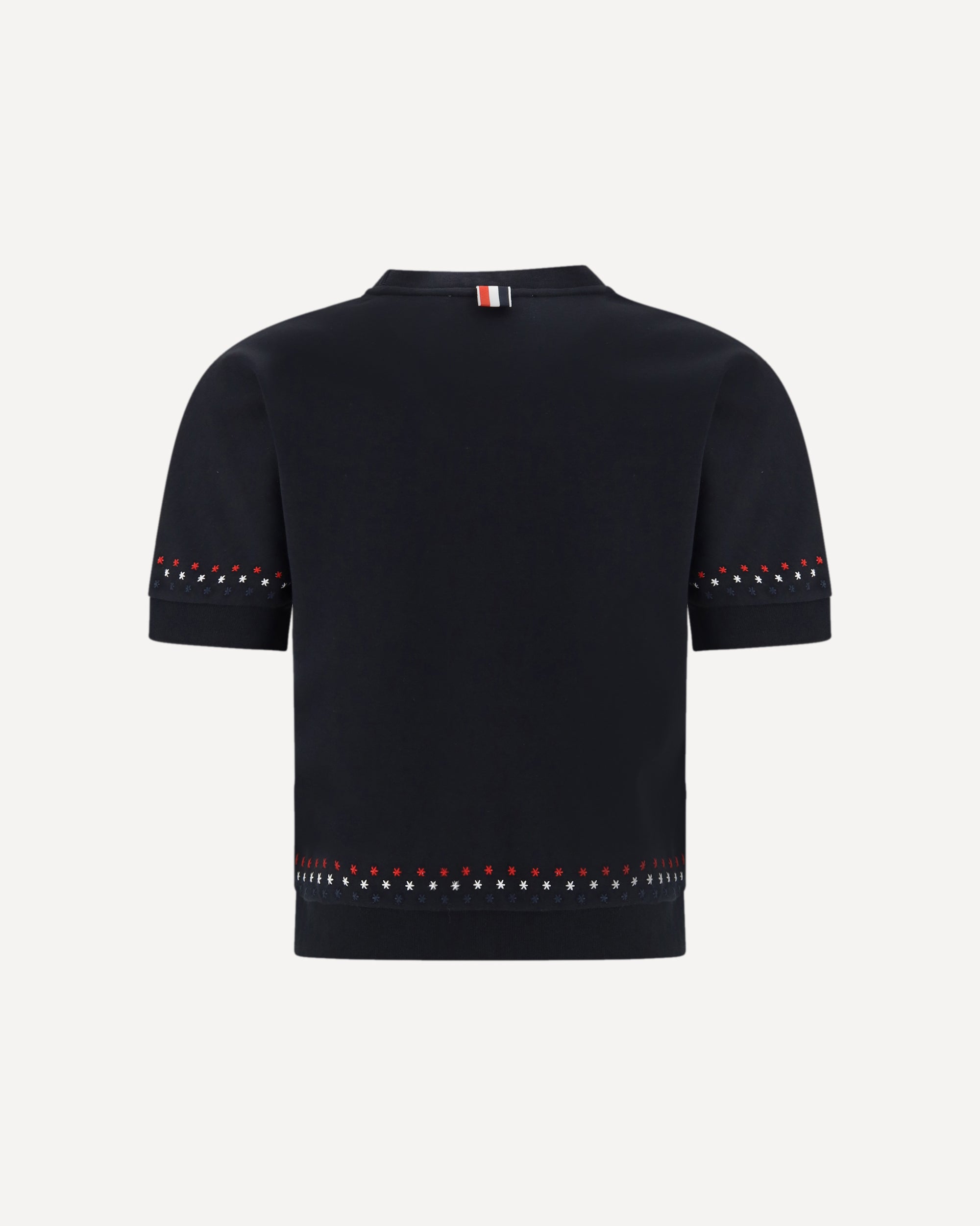 The Snowflakes T-Shirt by Thom Browne expresses the brand's distinctive style through refined and iconic details. Made with a ribbed crew neck and hems, it features sleeves and hem decorated with snowflake stitching in the house's three emblematic colors. On the front, at the bottom right, small tone-on-tone snowflakes add an elegant and discreet touch, making this garment a perfect balance between essentiality and sophistication.
