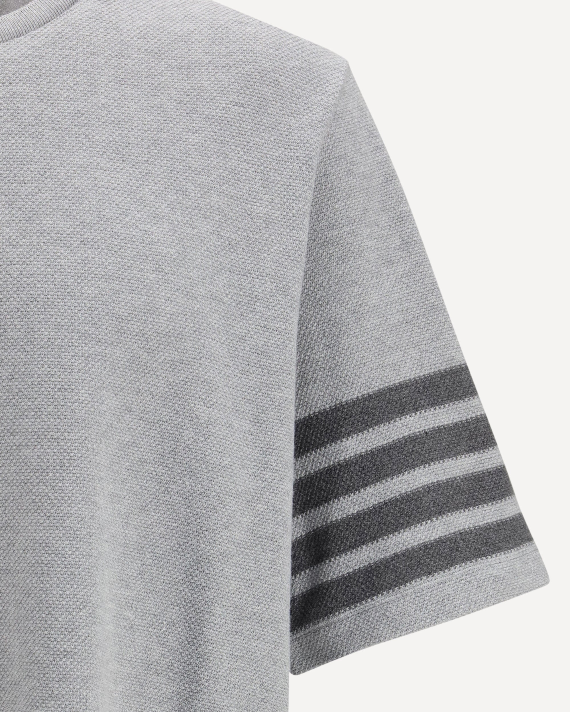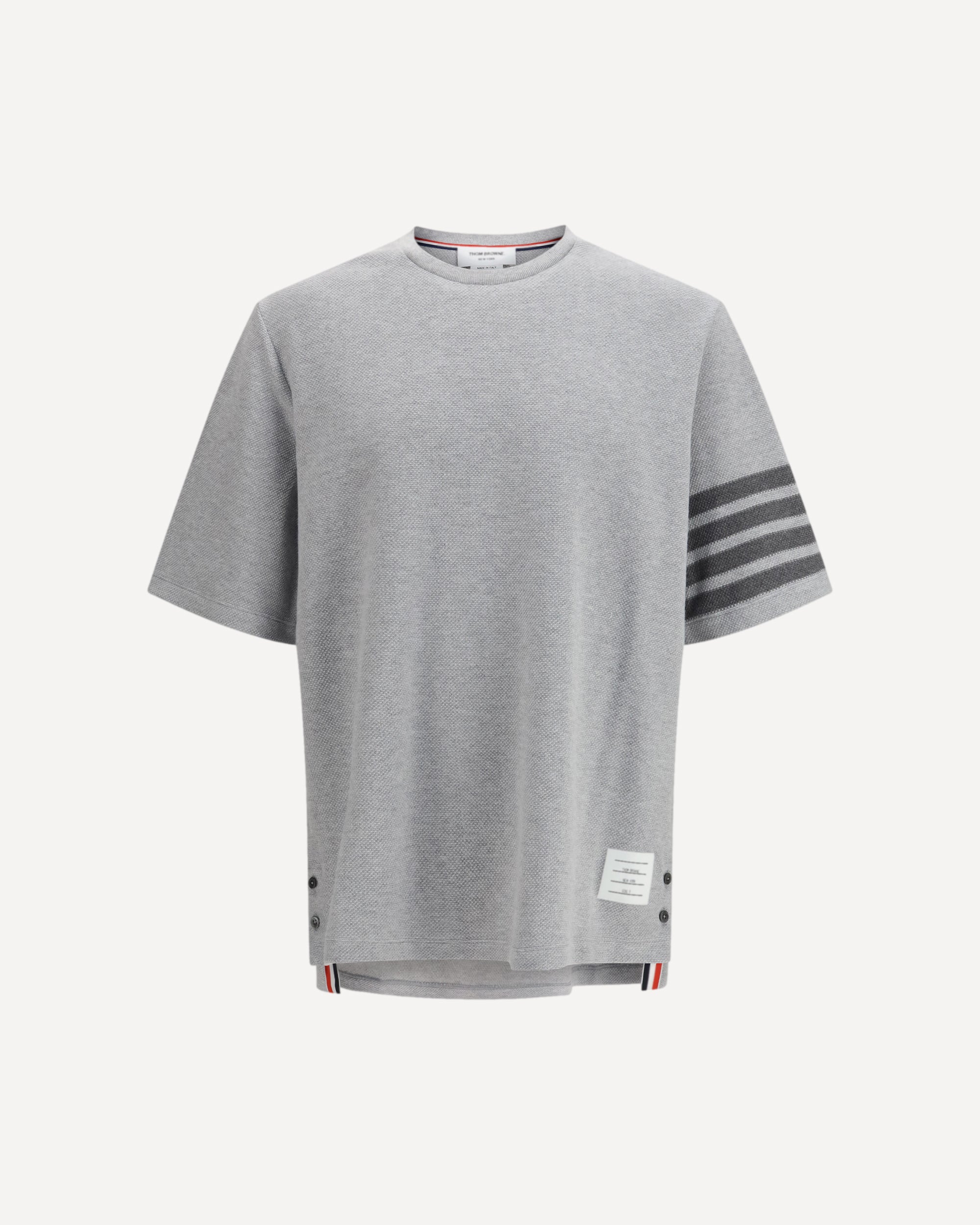The textured cotton piqué T-shirt by Thom Browne expresses a refined yet sporty aesthetic through its elevated surface and iconic details. The ribbed crew neck and tennis-tail hem shape a balanced silhouette, while the intarsia 4-Bar stripes on the sleeve and the logo patch at the front hem sign the piece. Buttoned side vents and the signature tricolor grosgrain flag at the back of the collar complete the design, embodying Thom Browne’s distinctive style.