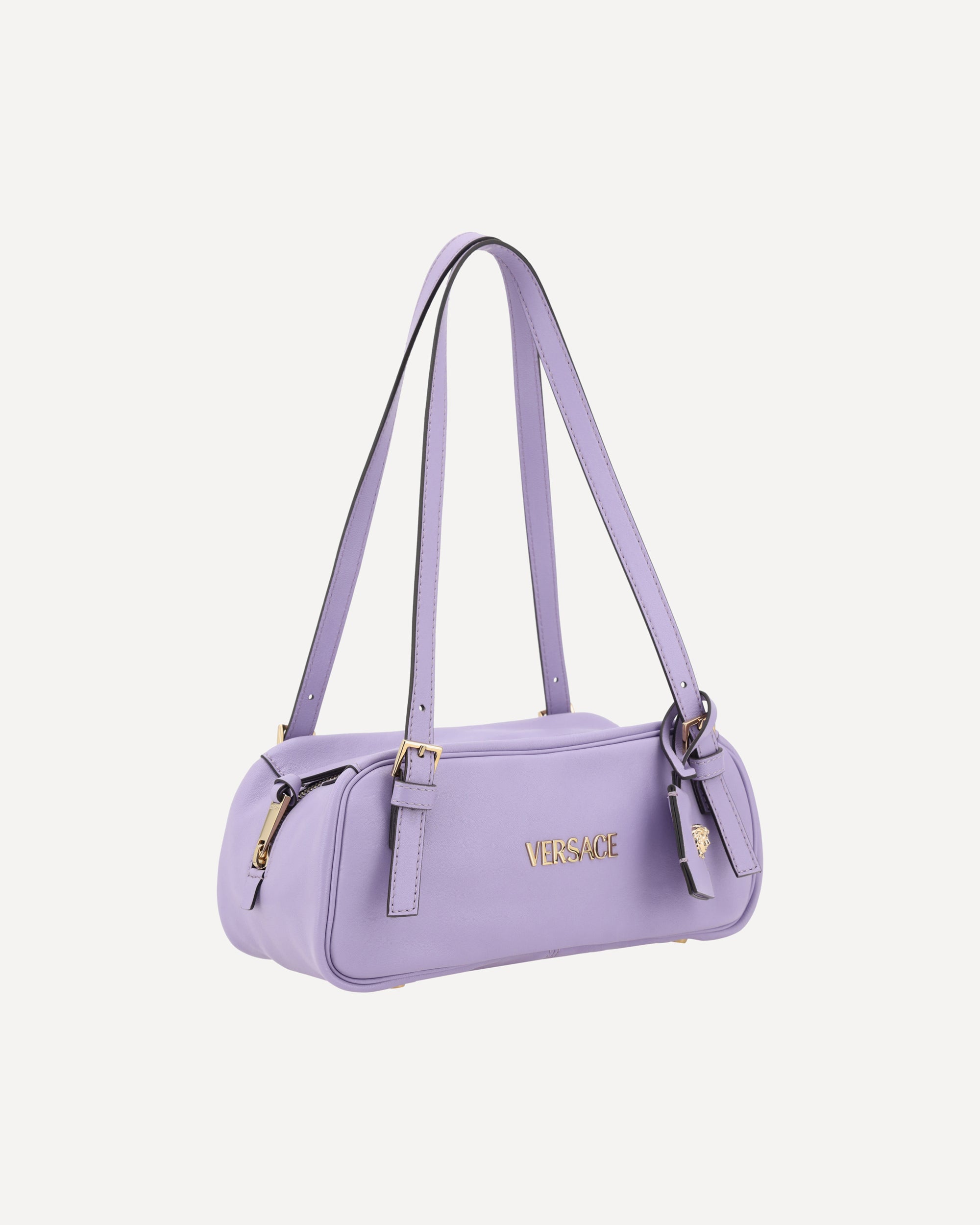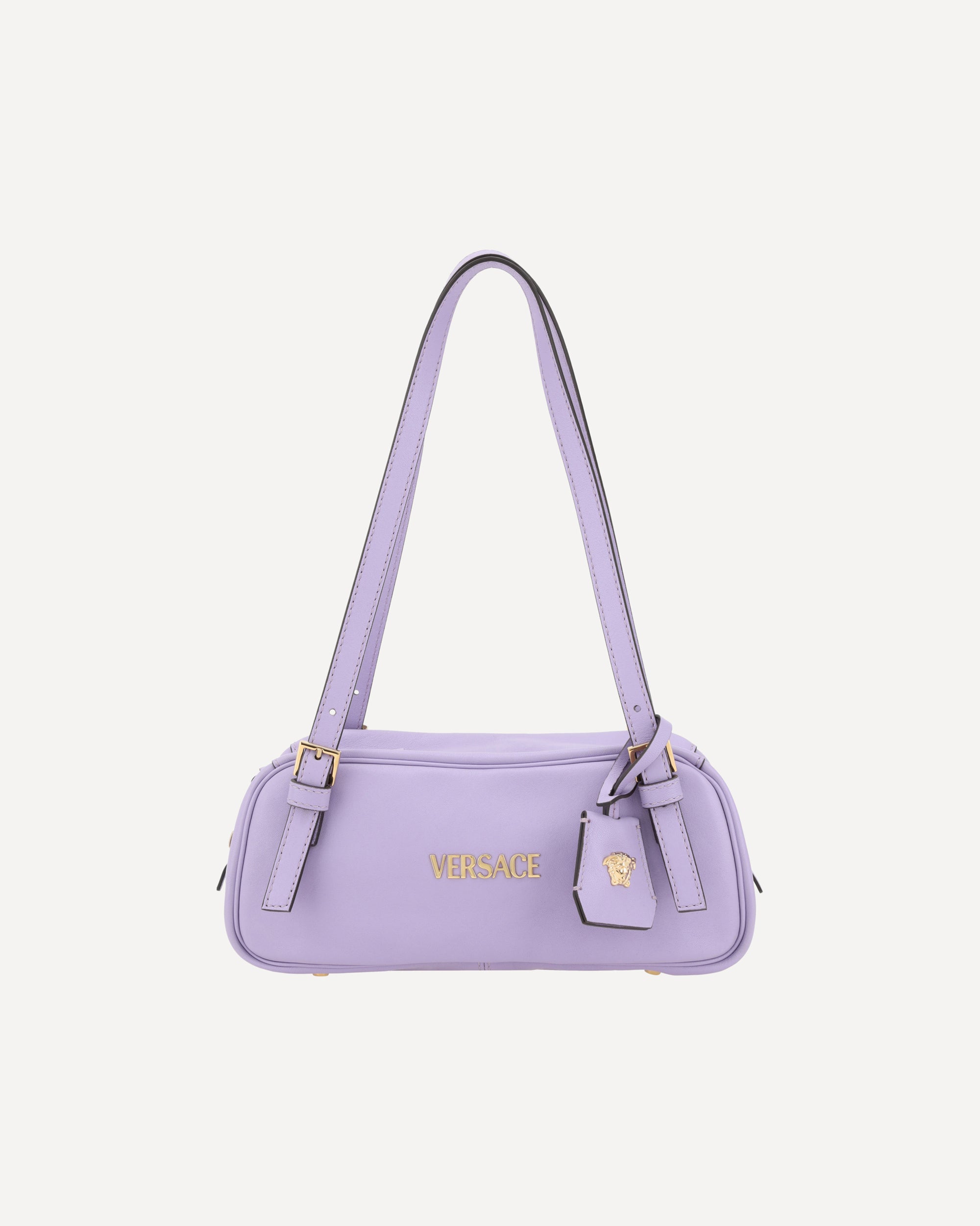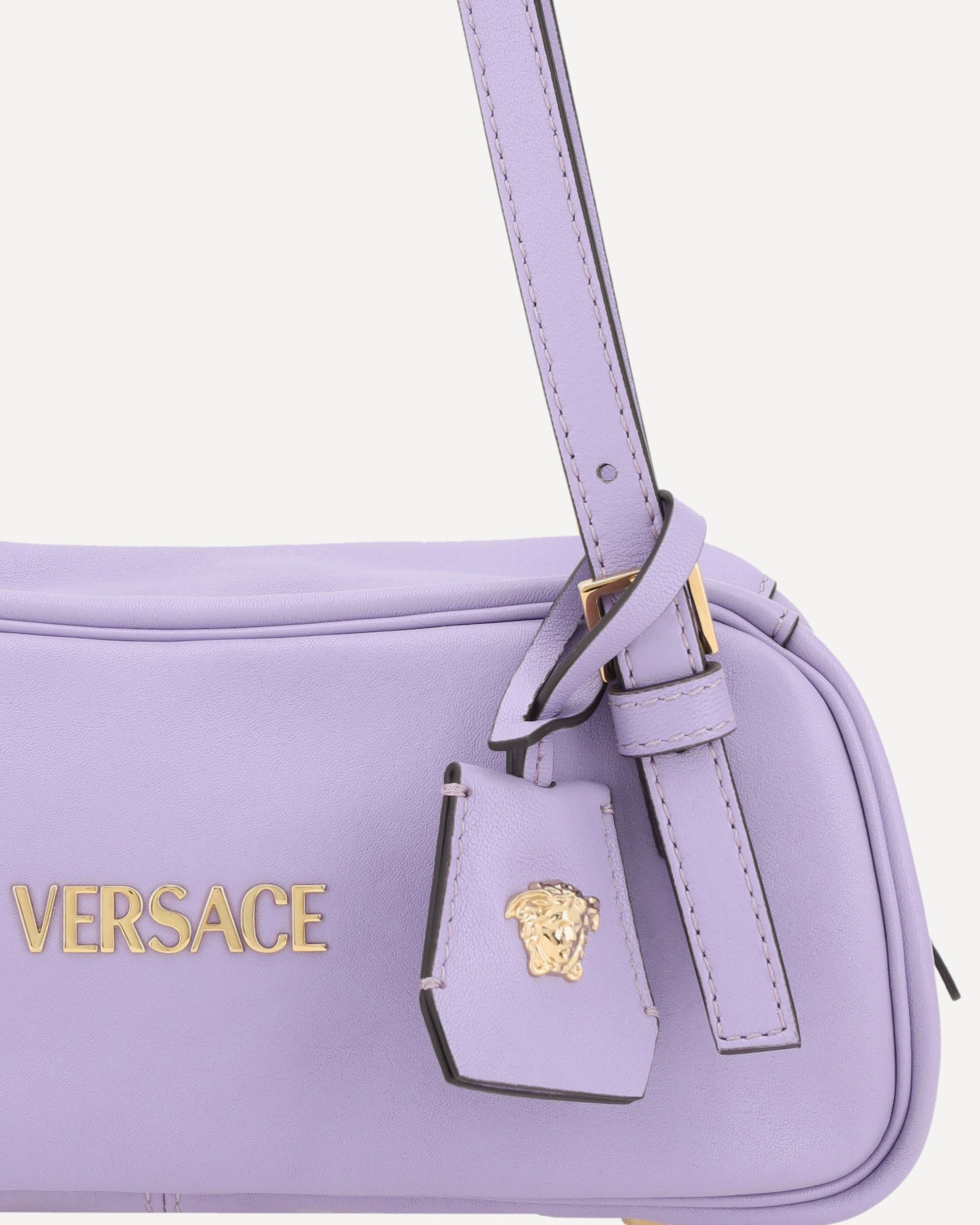 The lambskin Shoulder Bag by Versace is a sophisticated and luxurious accessory that captures the essence of the brand's bold style. Crafted from soft lambskin leather, the bag features two flat handles that ensure comfort and elegant wearability. The zippered top closure offers security and convenience, while the brand's iconic logo plaque affixed to the front adds a distinctive touch. A charm with the iconic Medusa logo, applied to the base of the handle, further embellishes the design, lending an accent of luxury and recognition. The interior, with a single compartment, is perfect for holding essentials, making this bag ideal for a refined and functional look.