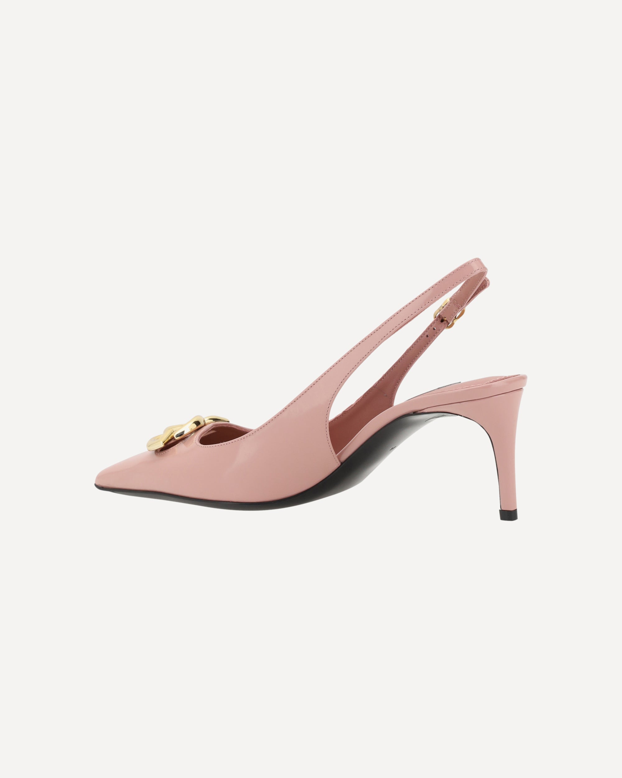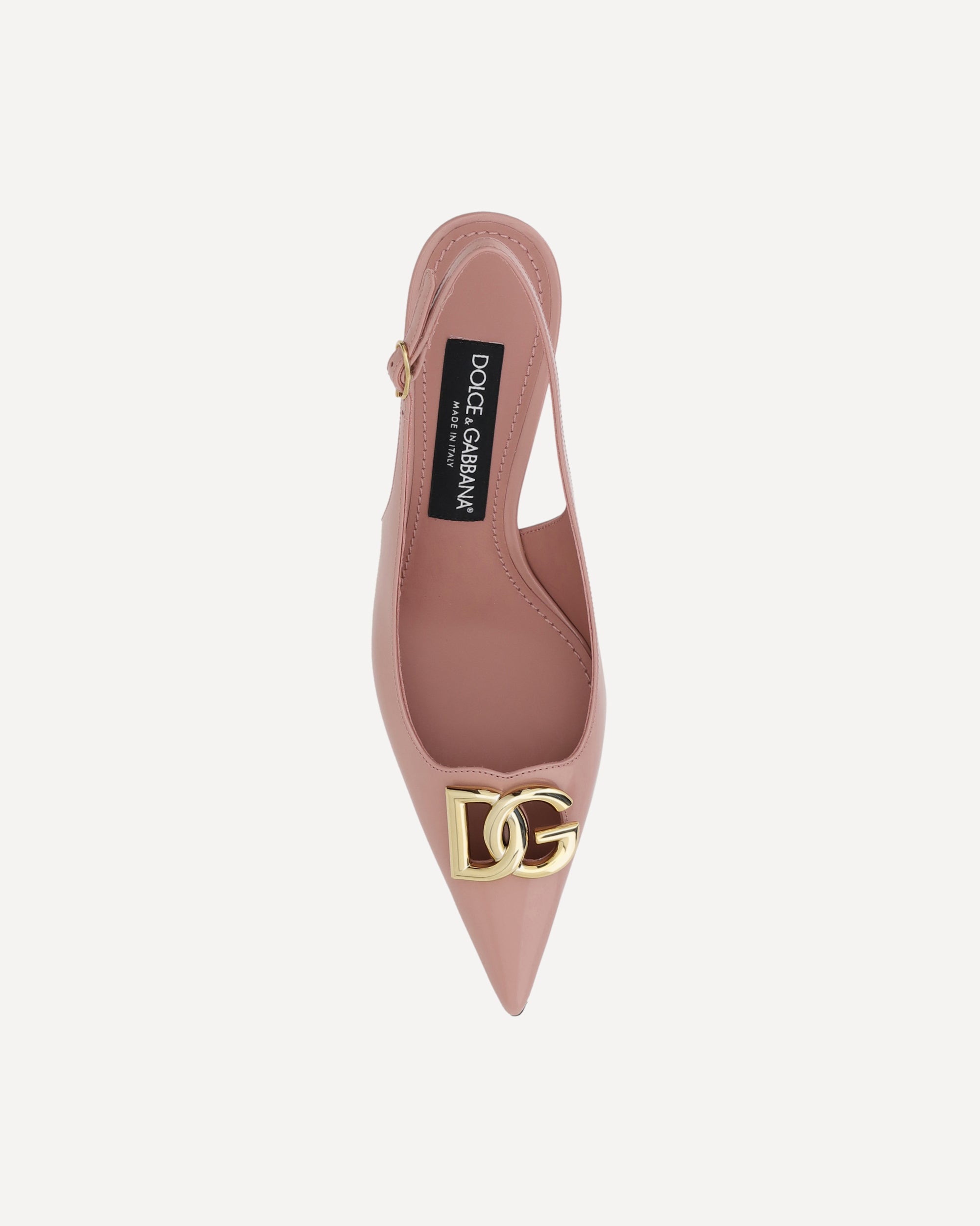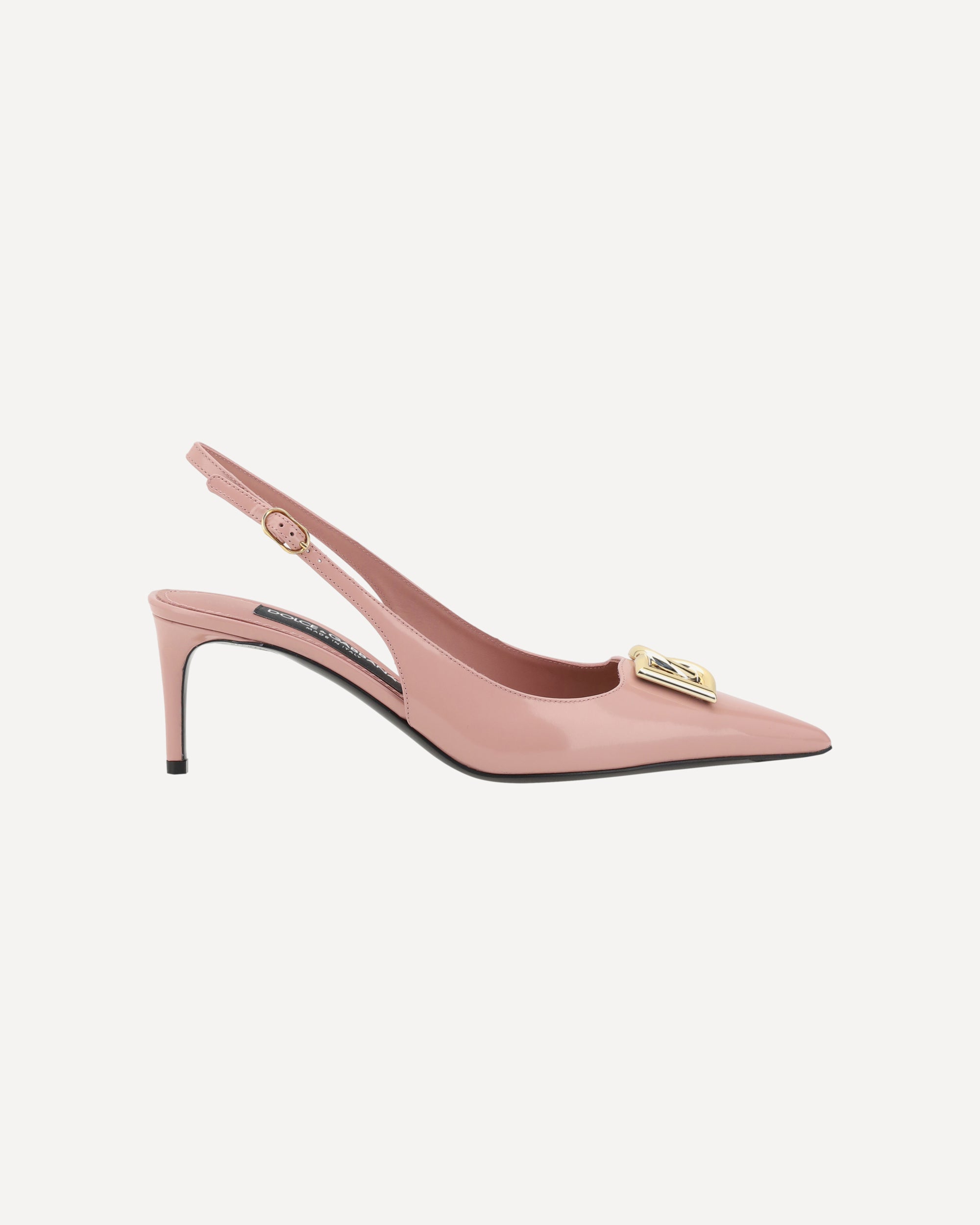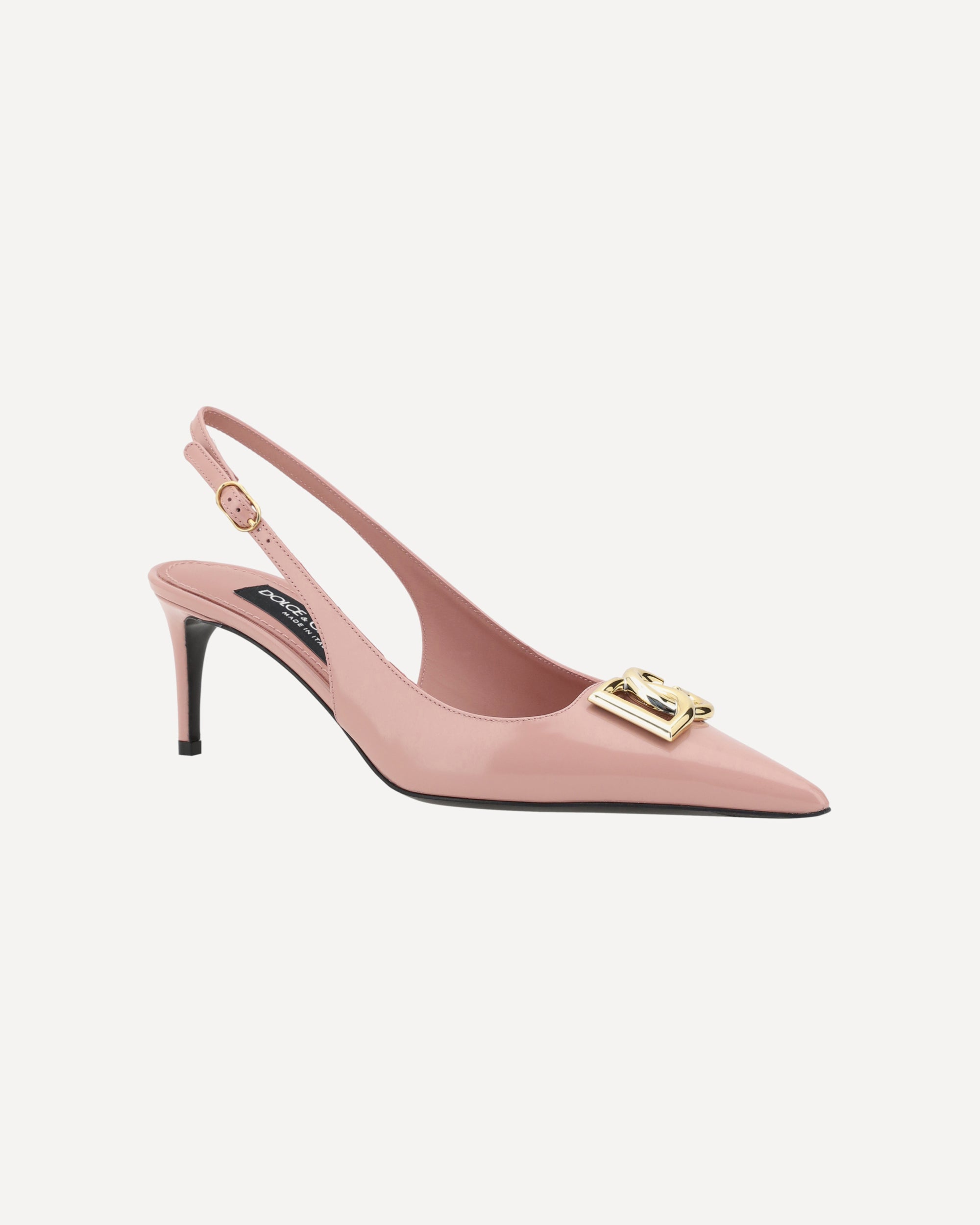 Dolce&Gabbana's patent leather Pumps feature an elongated toe that gives an elegant and feminine touch. On the front, the iconic three-dimensional DG plaque, the brand's distinctive symbol, stands out. The adjustable slingback with buckle at the ankle ensures a comfortable and secure fit. The leather stiletto heel adds height and sophistication, while the branded insole completes the design with an exclusive detail.