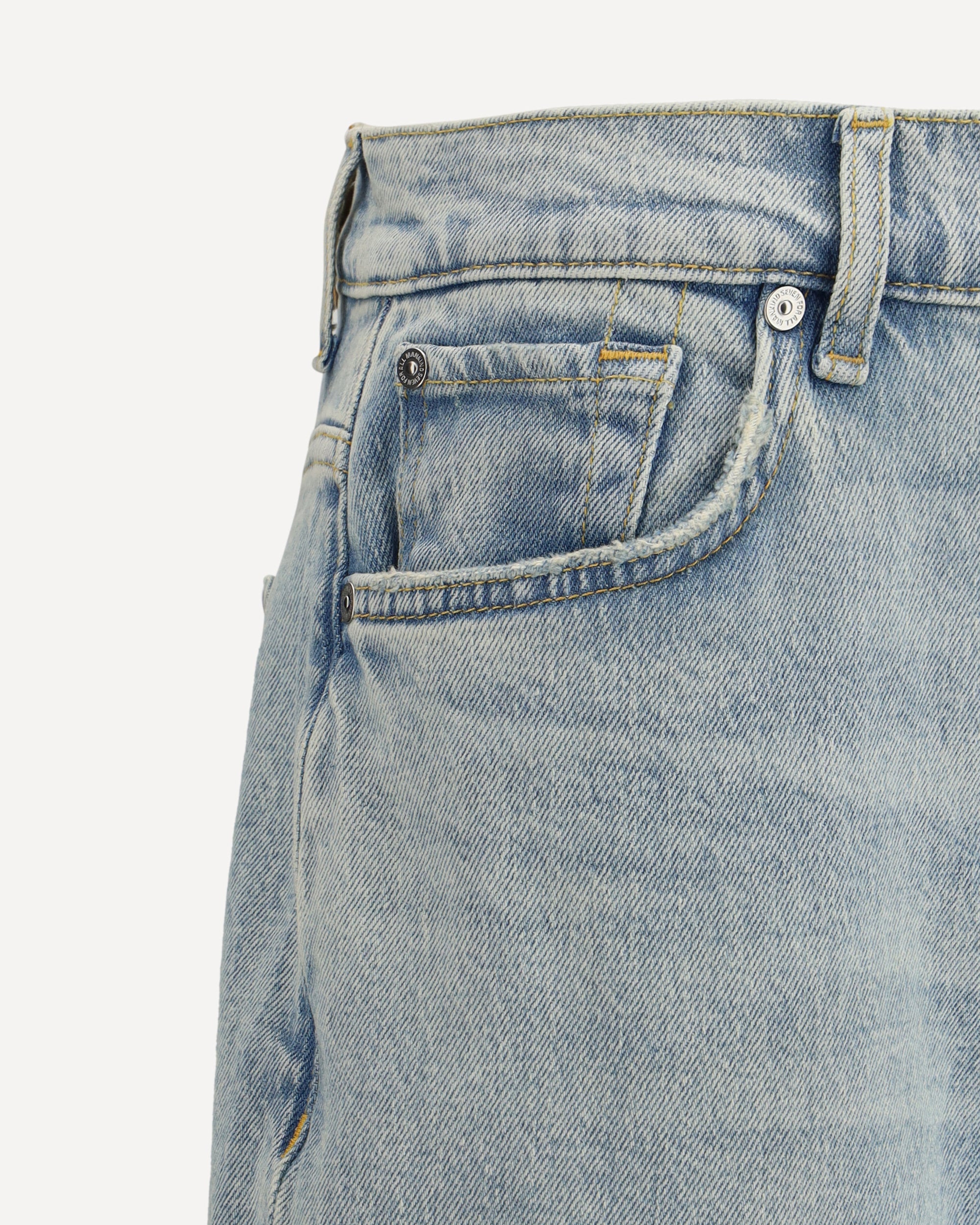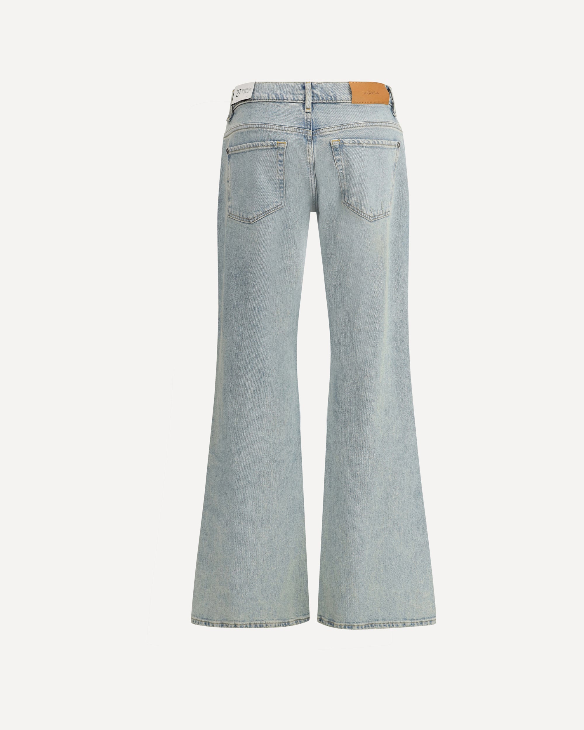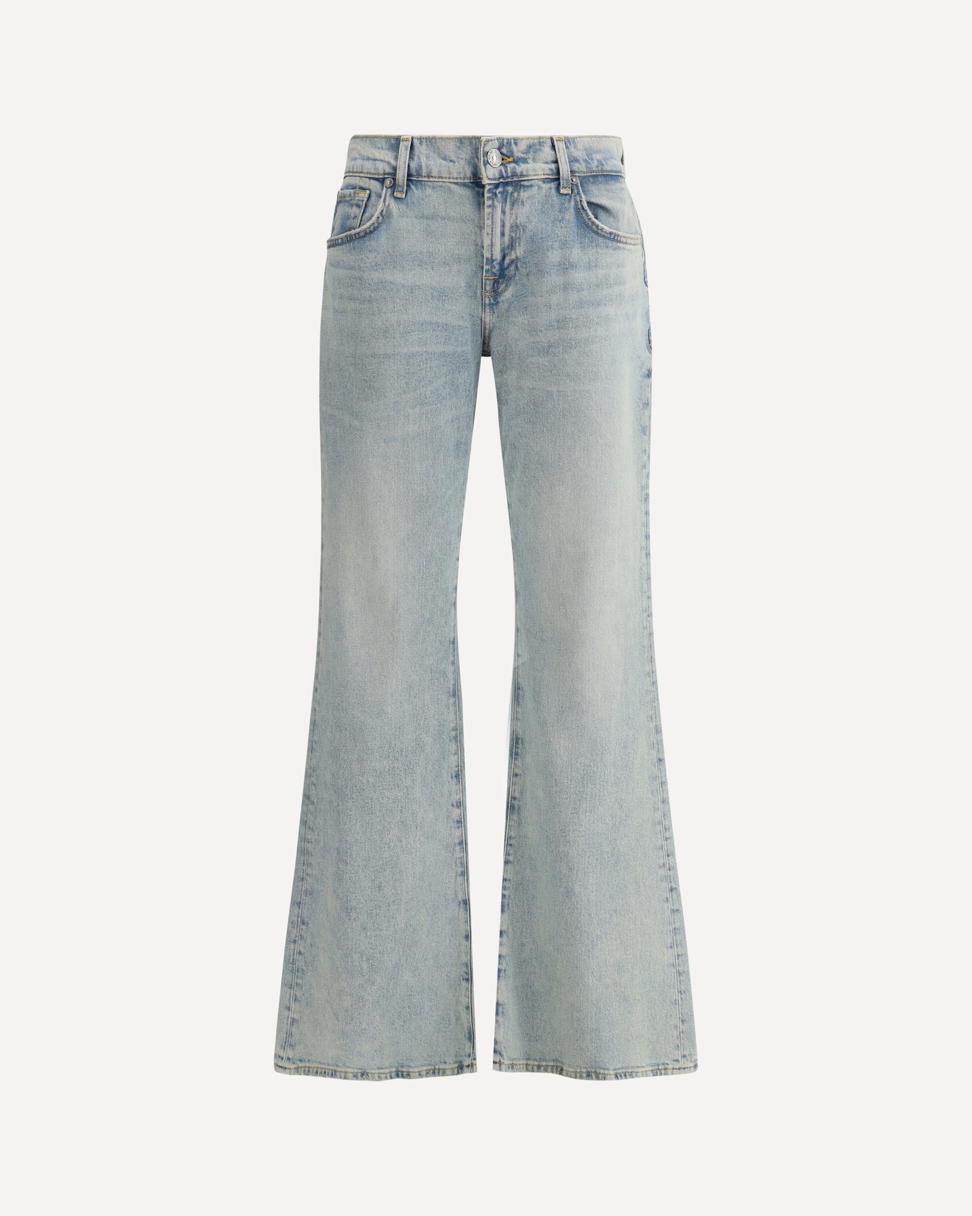 The Spencer Flare Sahara Cotton Jeans by 7For have a mid-rise waist and a five-pocket flare design. The front closure is button and zipper, while the waistband features belt loops. The garment is embellished with the brand's iconic pressure-printed signature leather patch applied to the back.