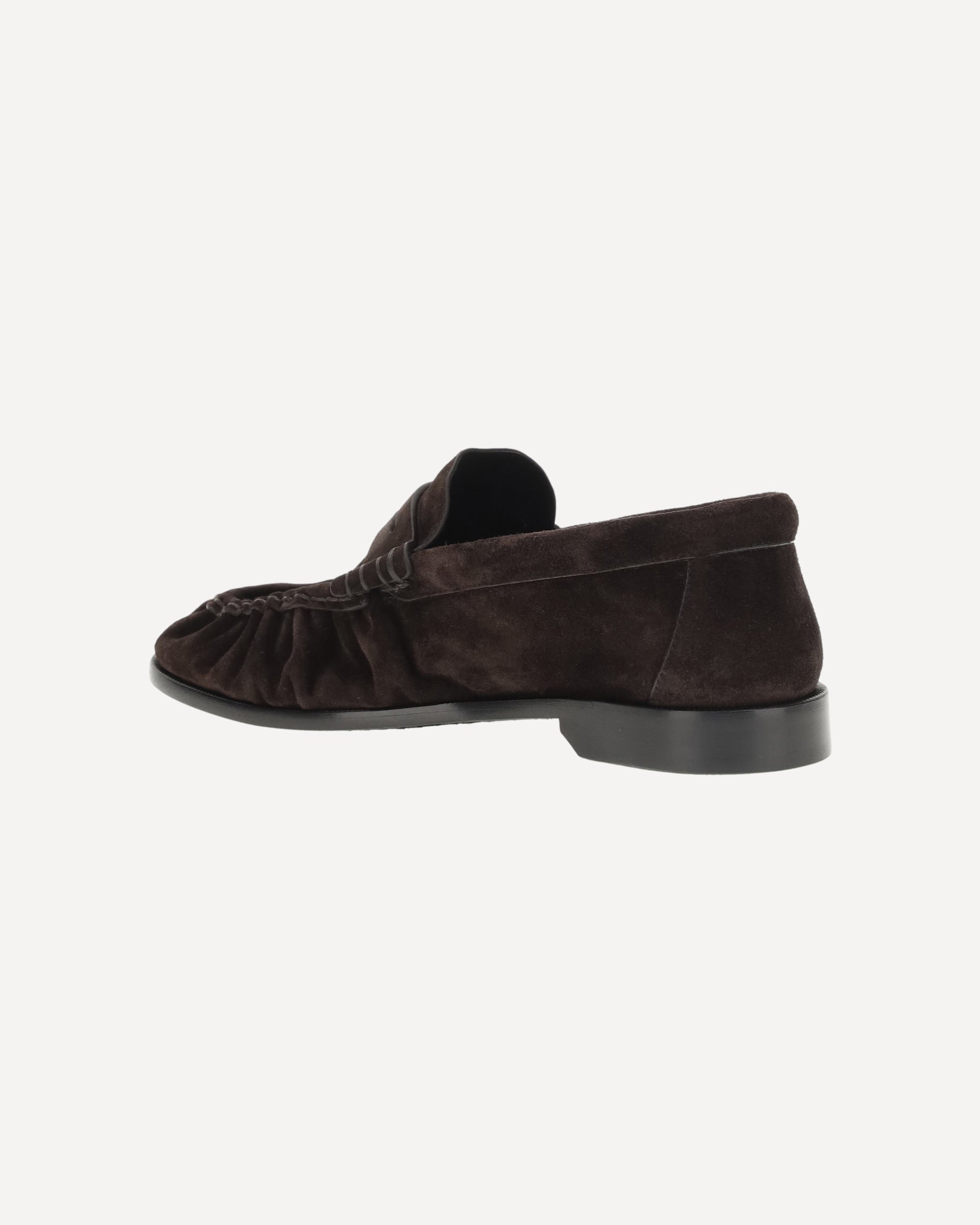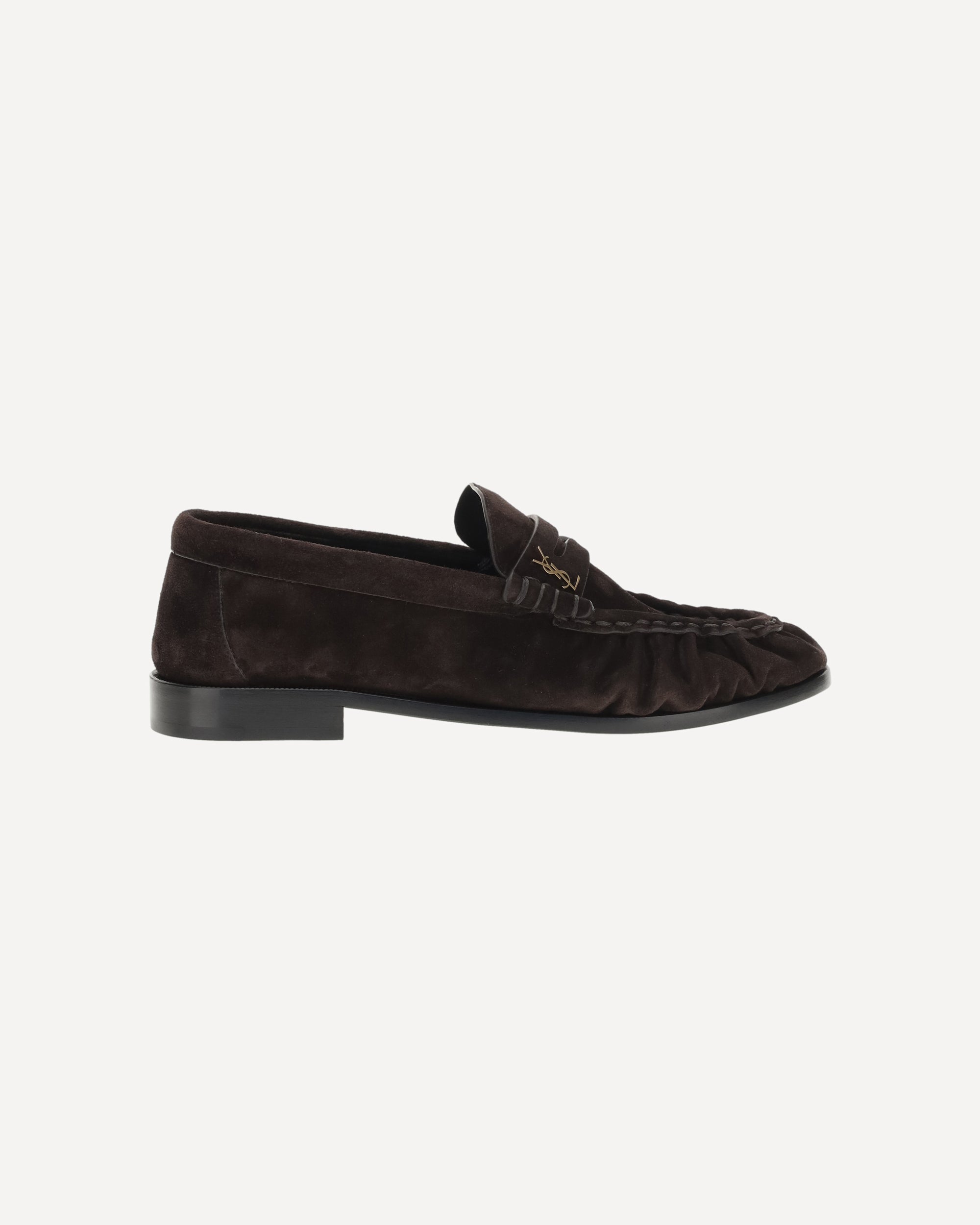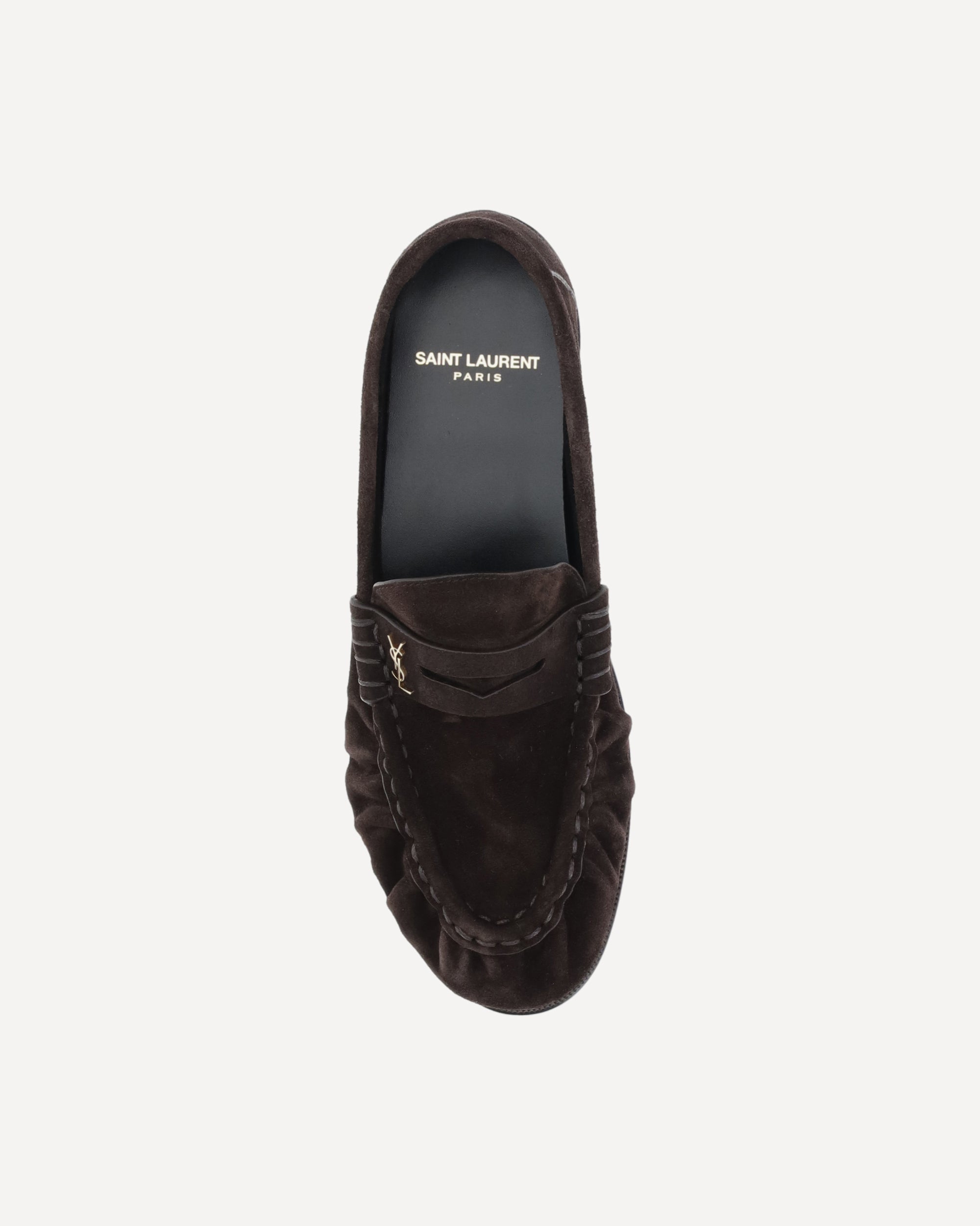 The Saint Laurent suede Loafers combine timeless elegance with iconic details. Crafted from soft suede, they feature a round toe and a metallic YSL logo plaque applied to the front. The leather block heel lends stability and style, while the branded insole completes the design with a distinctive Maison touch.