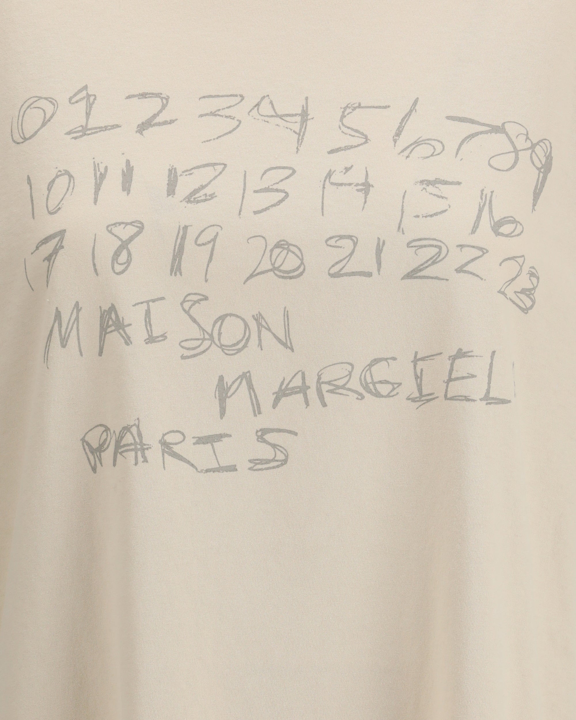 The cotton T-shirt by Maison Margiela offers a fresh take on the Maison’s numeric logo through a graphic inspired by spontaneous, hand-drawn lettering, reflecting the brand’s rebellious attitude. The front features printed numbers and scribbled text, while the iconic Four Stitches at the back stand in place of a traditional label. Crafted from ring-spun jersey, it is finished with a classic crew neckline and short sleeves.