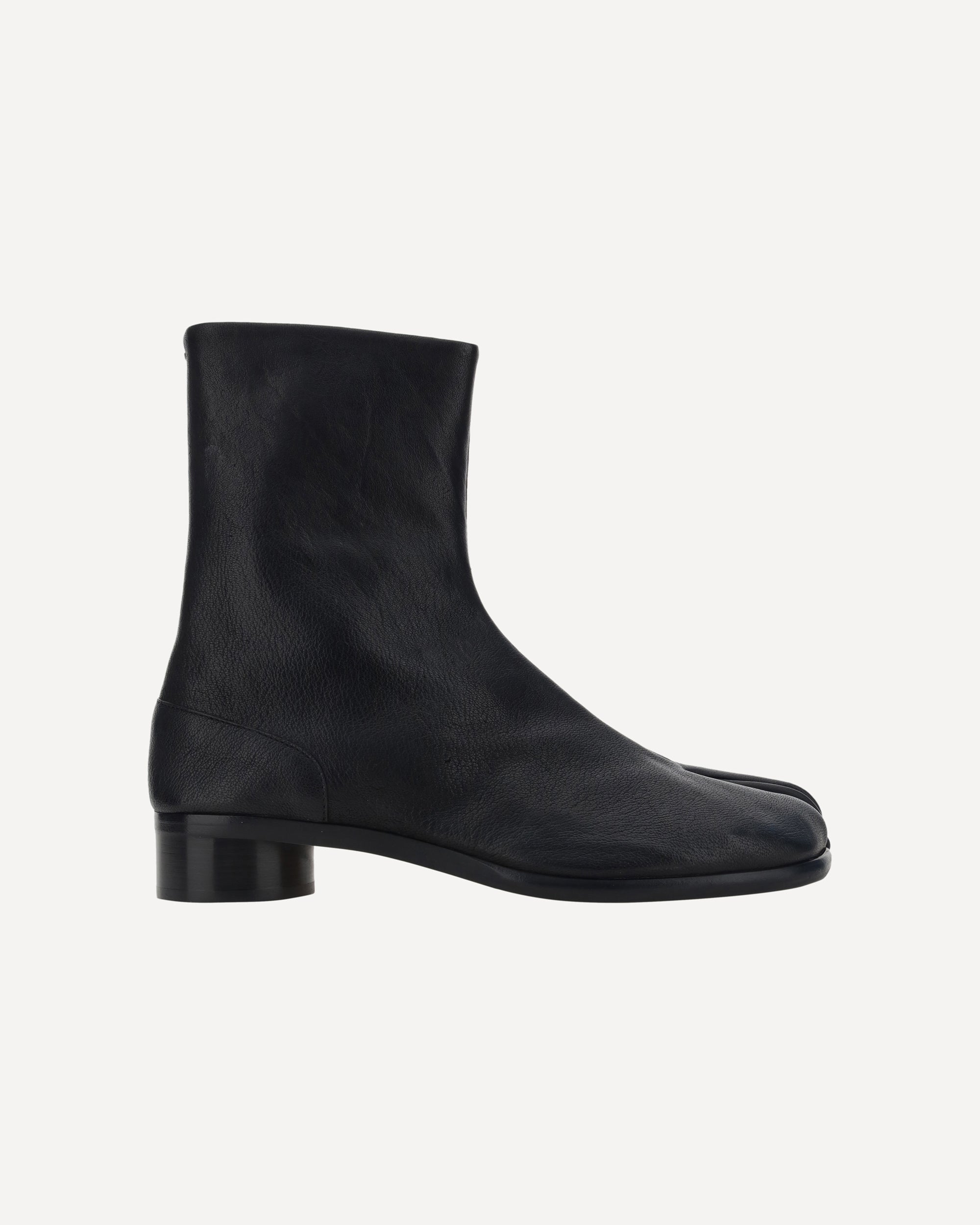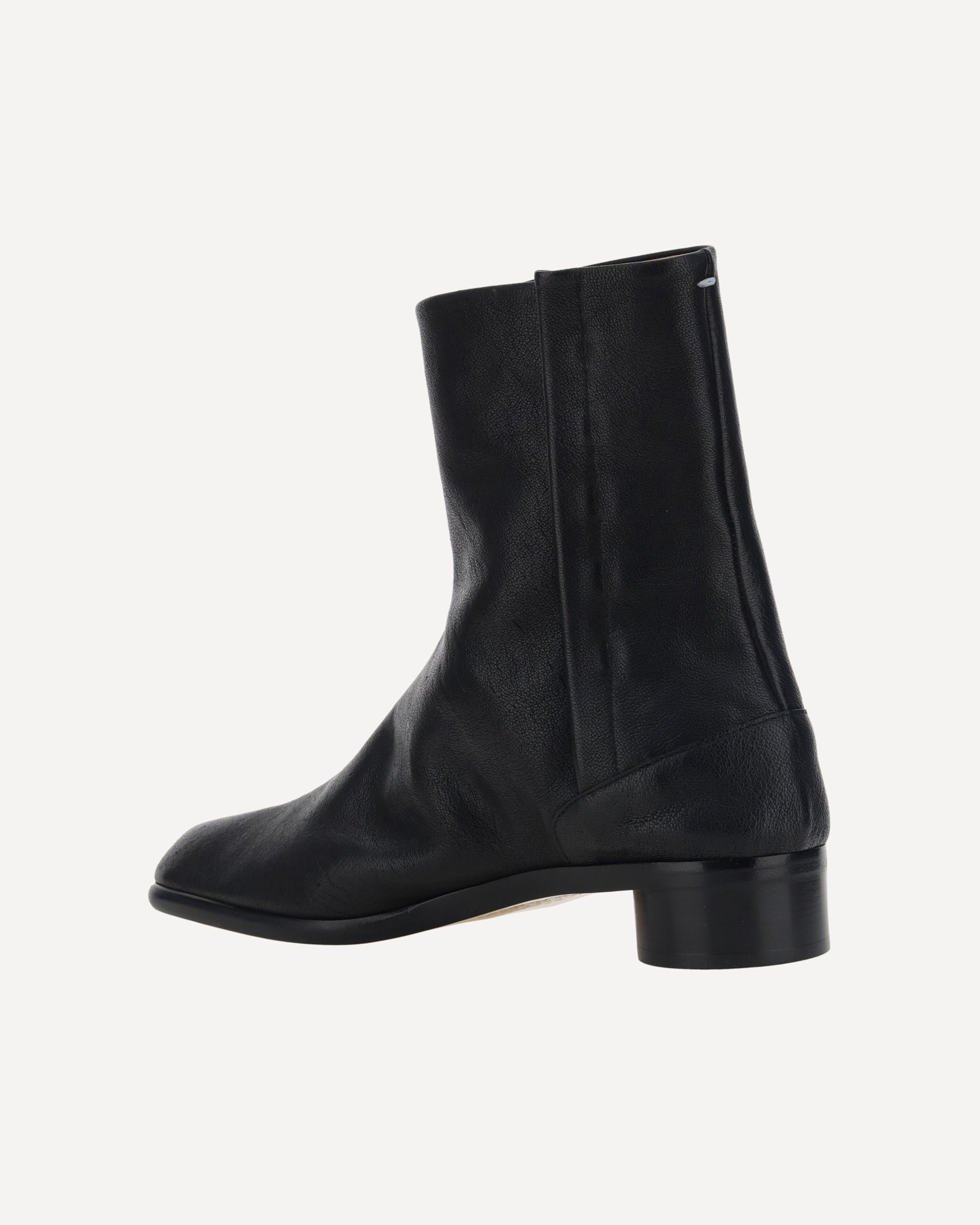 Calfskin Tabi Boots by Margiela, slit closure on inner side panel, leather block heel, brand's iconic Tabi toe on front, iconic contrast stitching on back.