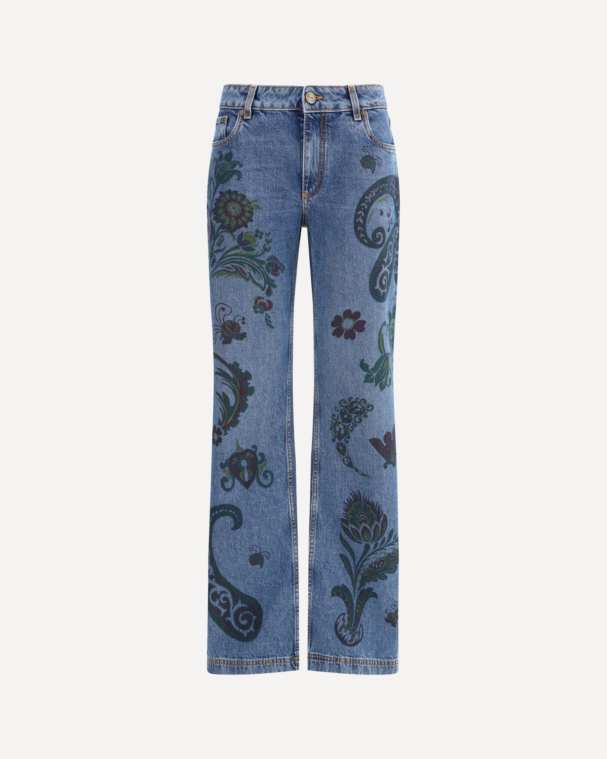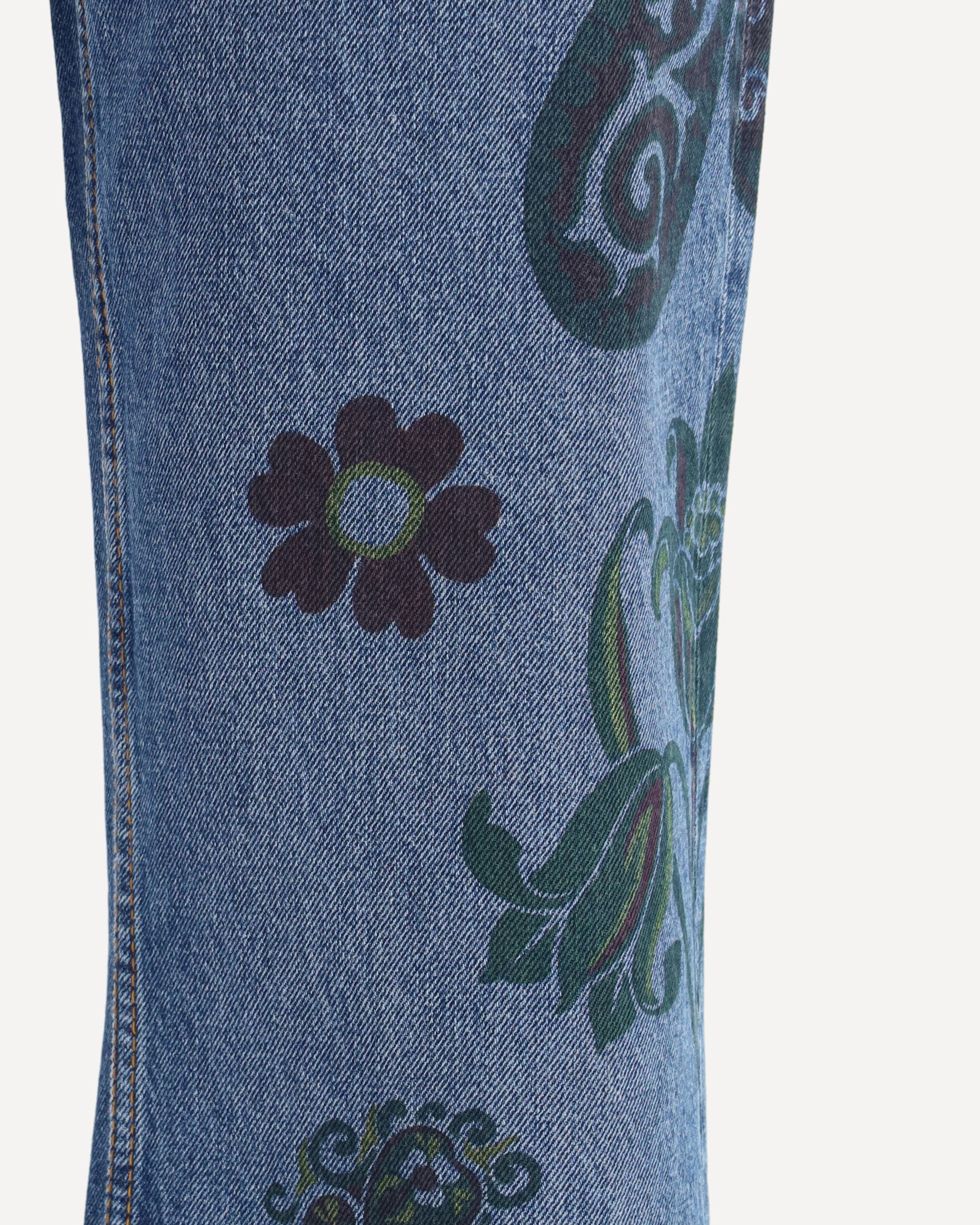 Etro's flower and bee print flare Jeans are a feminine, natural-spirited garment made from cotton denim. They feature a fitted line at the hips that opens into a flared bottom, enhanced by a print inspired by the natural world, with Paisley motifs, flowers and bees. The five-pocket style is complemented by distinctive details such as a metal button with embossed Pegasus logo and a back salpa with ETRO and Pegasus logos. The regular waist, Pegaso button closure and hidden zipper ensure comfort and style, making these jeans an iconic and original garment.