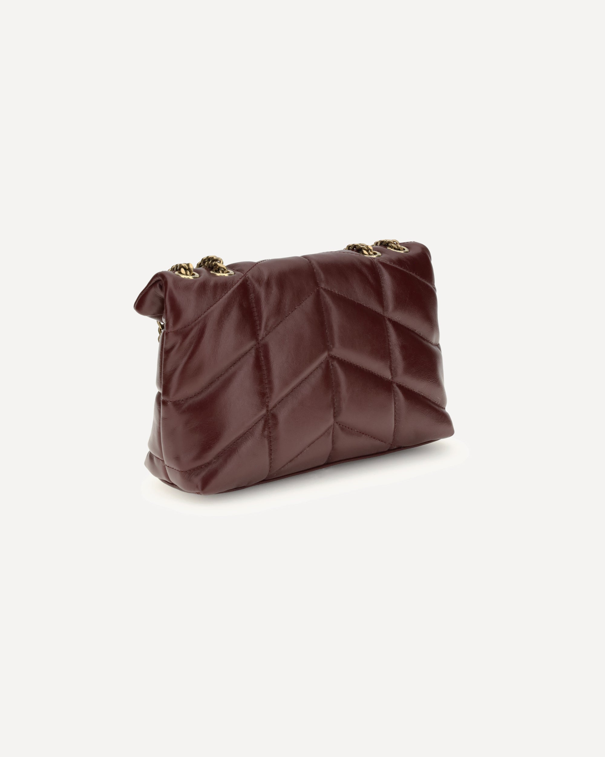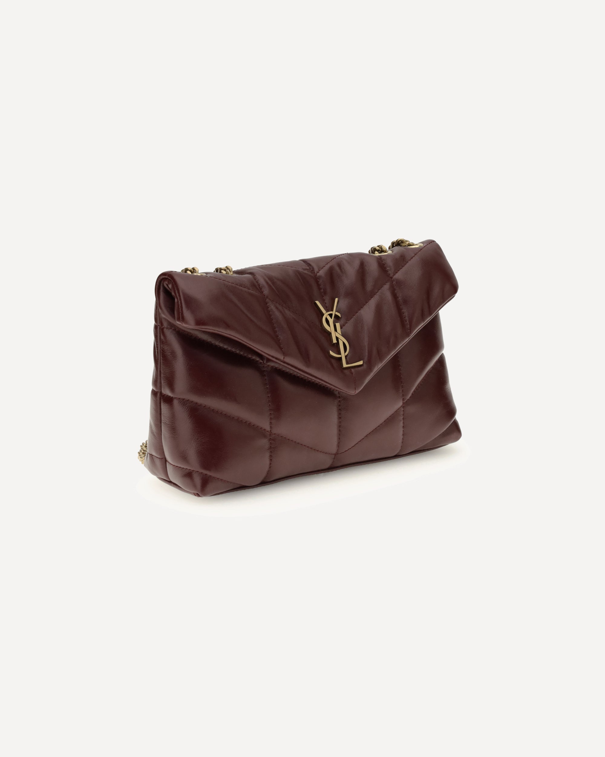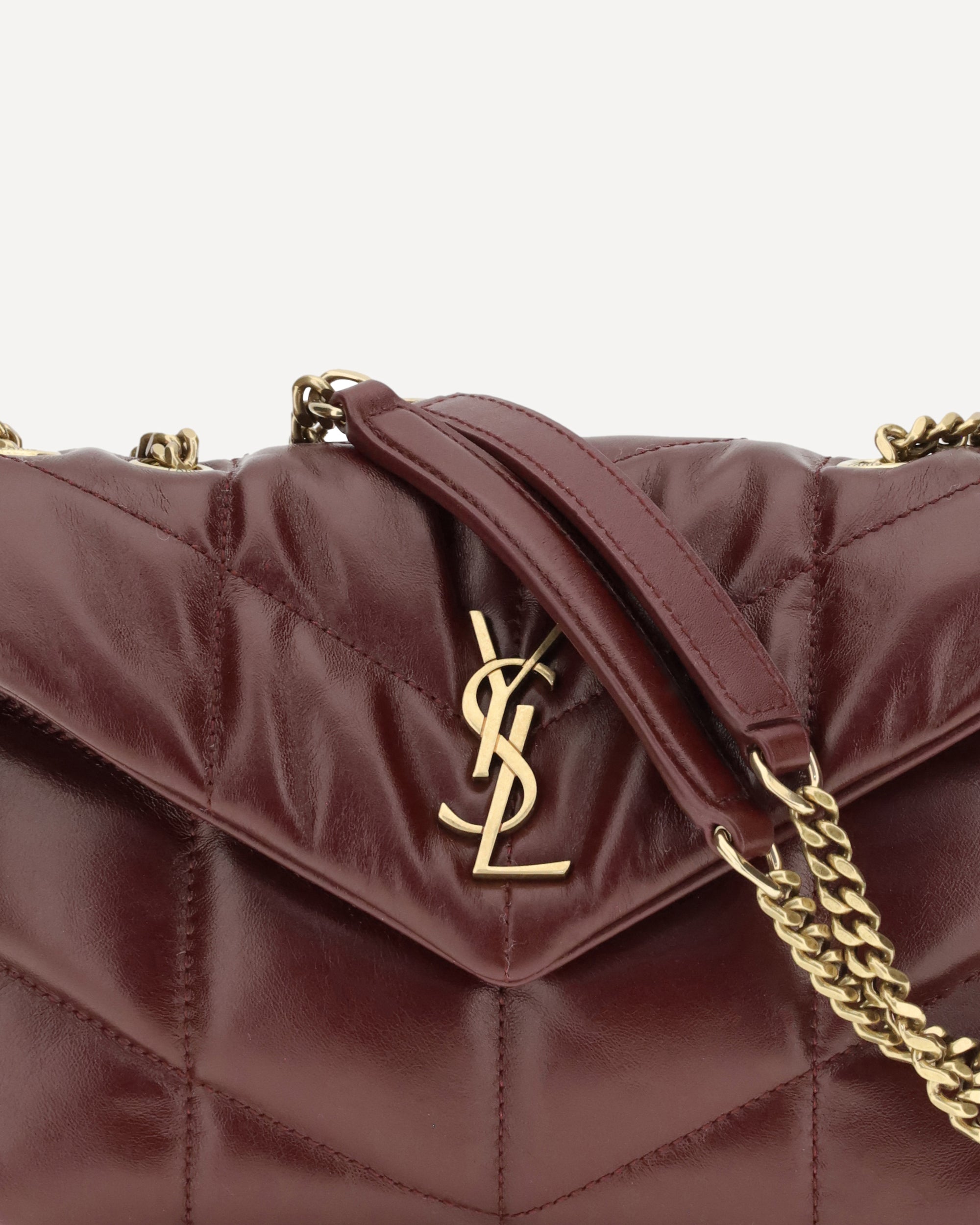Saint Laurent's Puffer Toy Shoulder Bag is the mini version of the iconic LouLou Puffer, made of glossy calfskin with chevron-quilted stitching. Equipped with a sliding chain strap, it can be worn on the shoulder or cross-body. It features a grosgrain lining, bronze-colored metal parts, automatic magnetic closure, an interior zipper pocket and two card slots, combining elegance and functionality in a compact size.