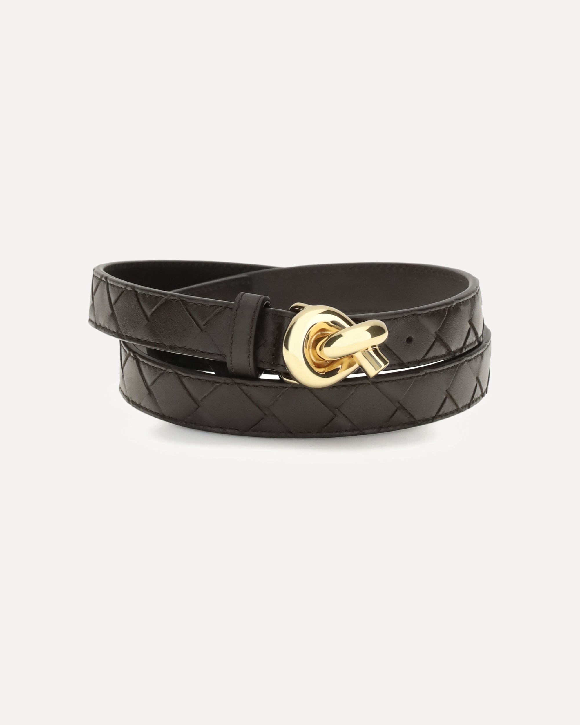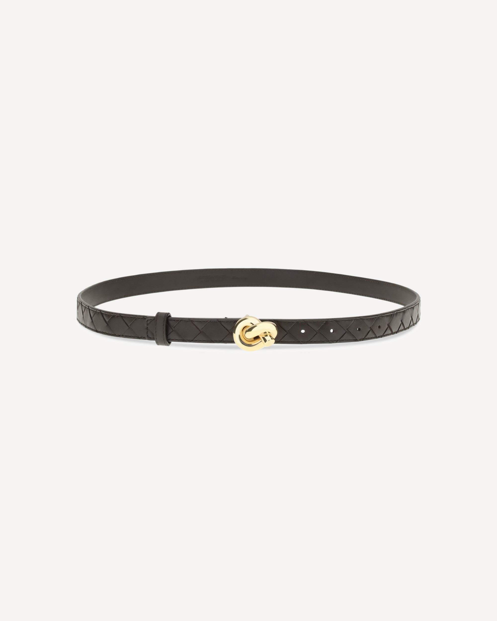 Bottega Veneta's Knot Belt is an iconic accessory that combines elegance and craftsmanship. Made of soft silky calfskin with Intrecciato workmanship, the distinctive symbol of the maison, it is distinguished by a metal knot buckle, a sculptural and sophisticated element that echoes the model's name. The pin closure ensures a secure and adjustable fit. A refined detail to complete both formal and casual looks with an unmistakable touch of style.