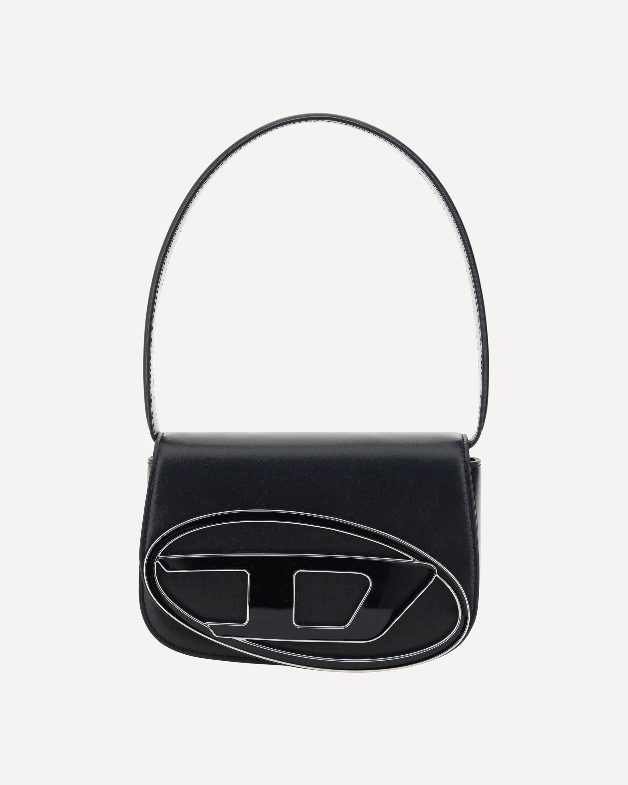 The 1DR Shoulder Bag by Diesel is made of mirrored leather with a flat shoulder strap. It has a front magnetic closure and the brand's embossed Oval-D logo. Inside is a welt pocket to keep items in order. A modern and practical design.