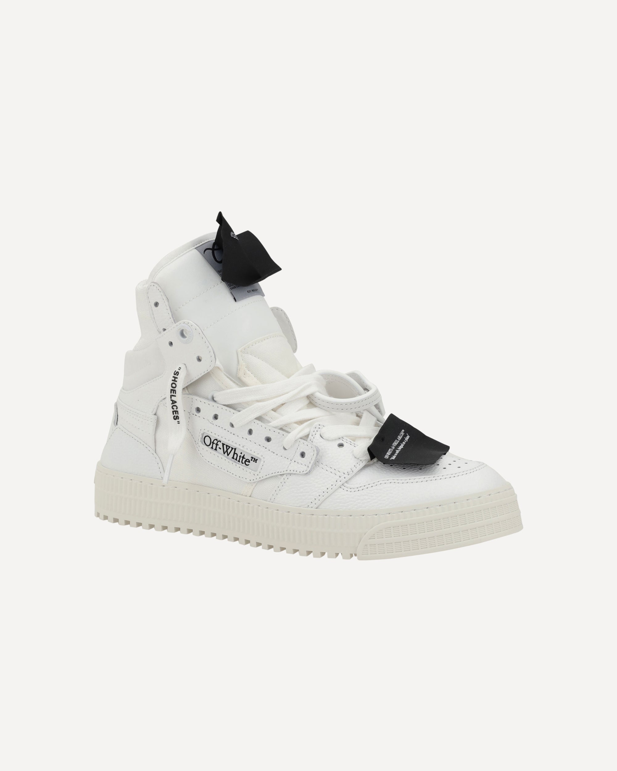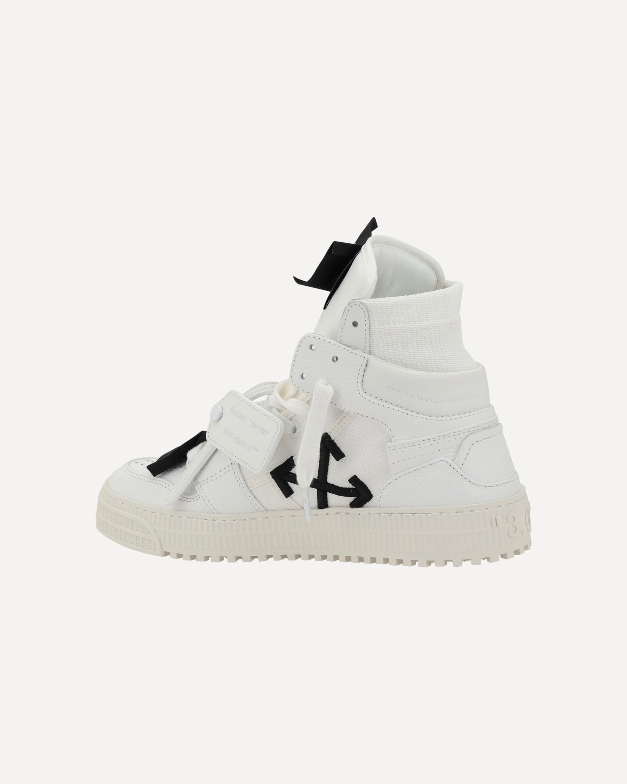 Off-White's 3.0 Off Court leather Sneakers combine a bold and contemporary design. Featuring a lace-up front closure and a perforated round toe, they offer optimal comfort. The ankle-high style, enhanced with a ribbed detail, lends a rugged, modern look. The paneled design adds dynamism, with the inner panels emblazoned with the brand's iconic Arrow logo. The flat sole provides comfort and stability, while the zipper tie tag applied on the front and the contrasting logo on the heel emphasize the urban, streetwear aesthetic, making these shoes a true symbol of contemporary style.