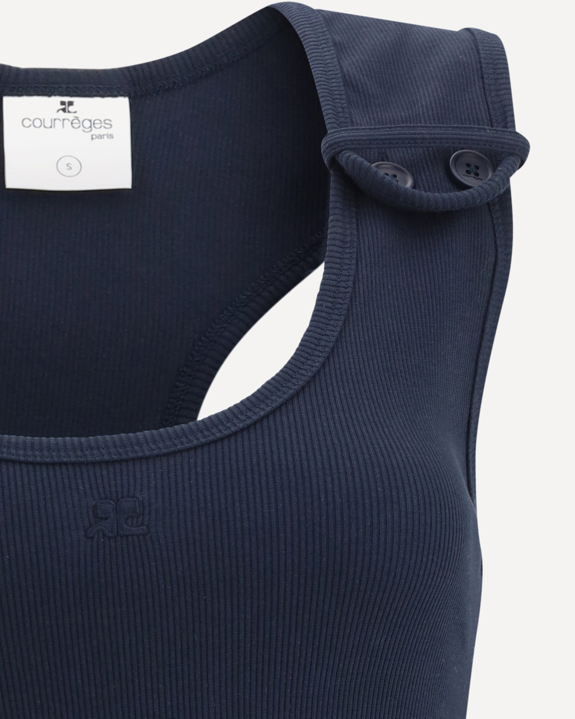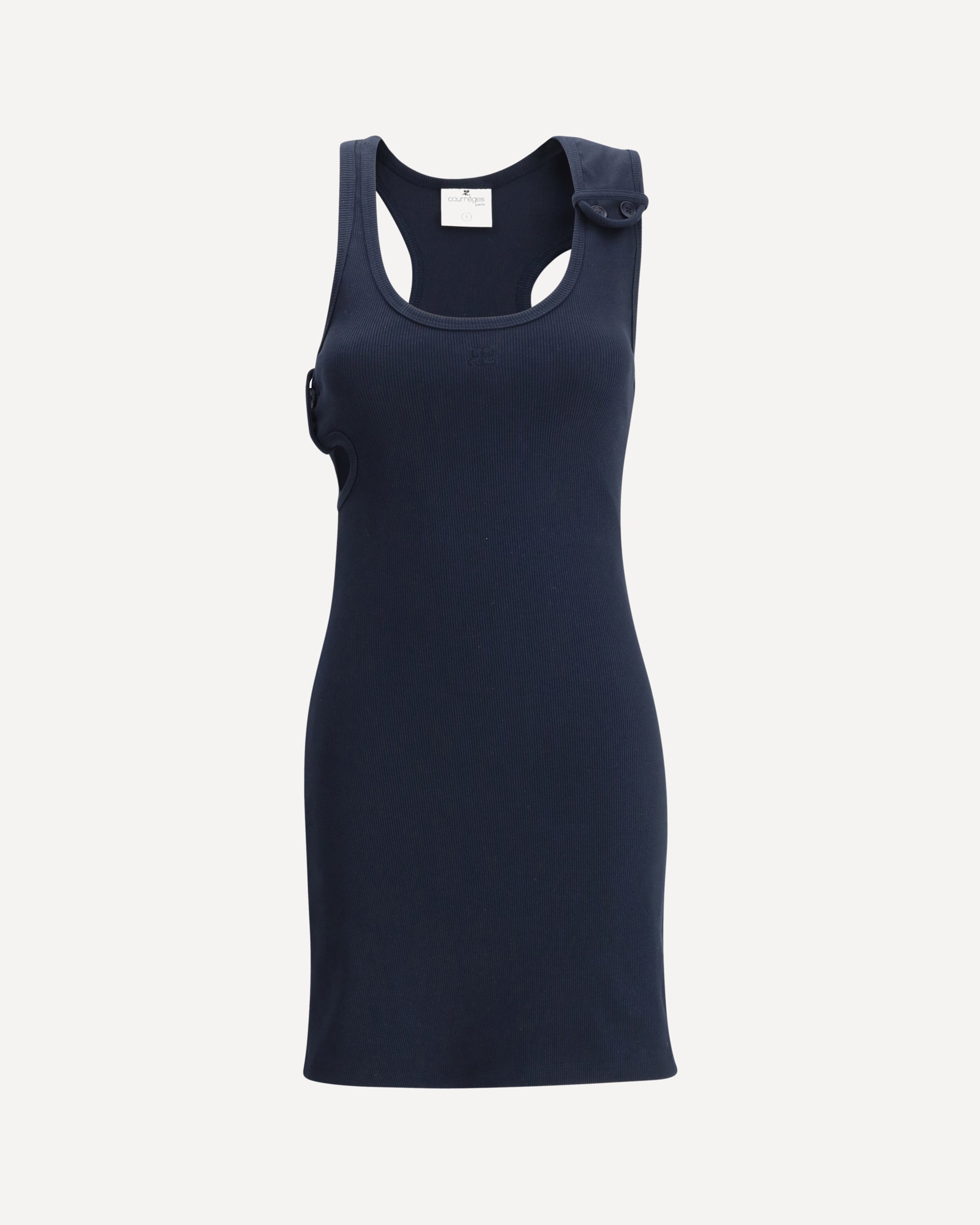 The Courrèges 90s midi Dress is a bold, contemporary piece that recalls the iconic style of the 1990s. The sleeveless, fitted style accentuates the silhouette, while cut-out details on the side add a sensual, modern touch. Button detail on one shoulder strap and the brand's iconic logo sewn on the front accentuate the authenticity of the design. The ribbed construction lends texture and a sense of dynamism to the garment.