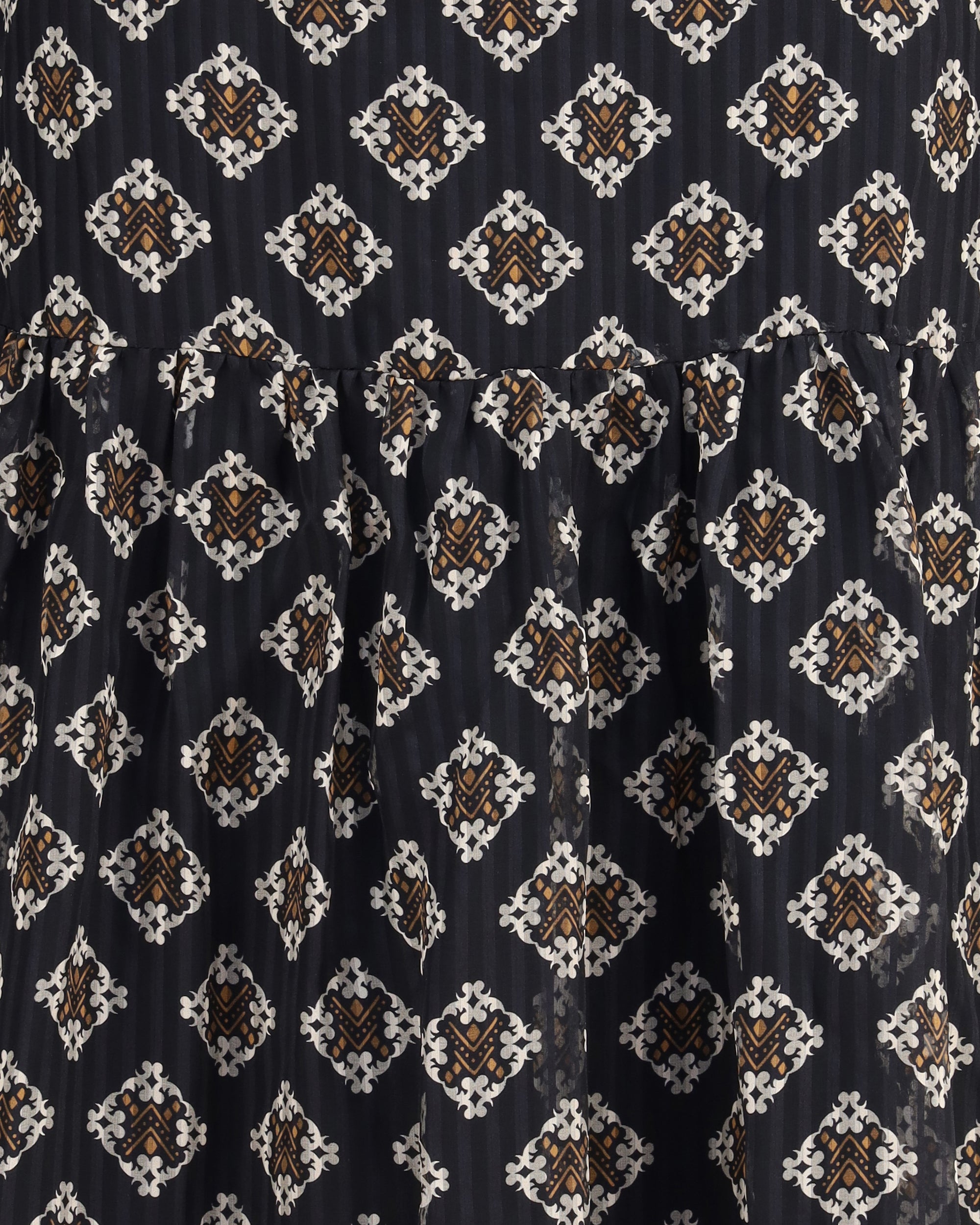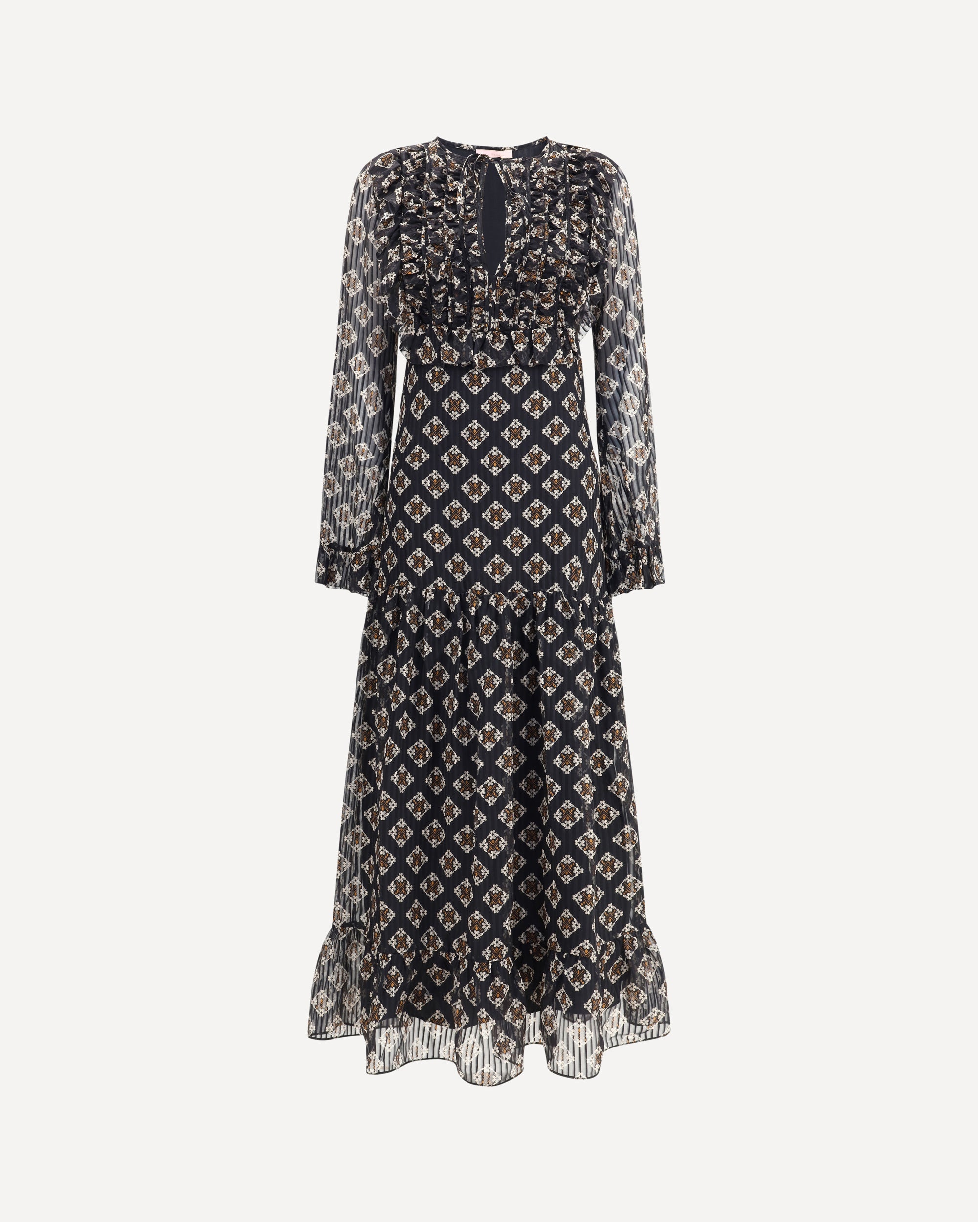Kristina Ti's silk long Dress enchants with its ethereal, retro-spirited design. Featuring a vintage striped pattern on semi-sheer fabric, it has ruffles on the front, a drawstring closure and a small flounce at the hem. Lightly puffed cuffs complete the look with a romantic and refined touch.