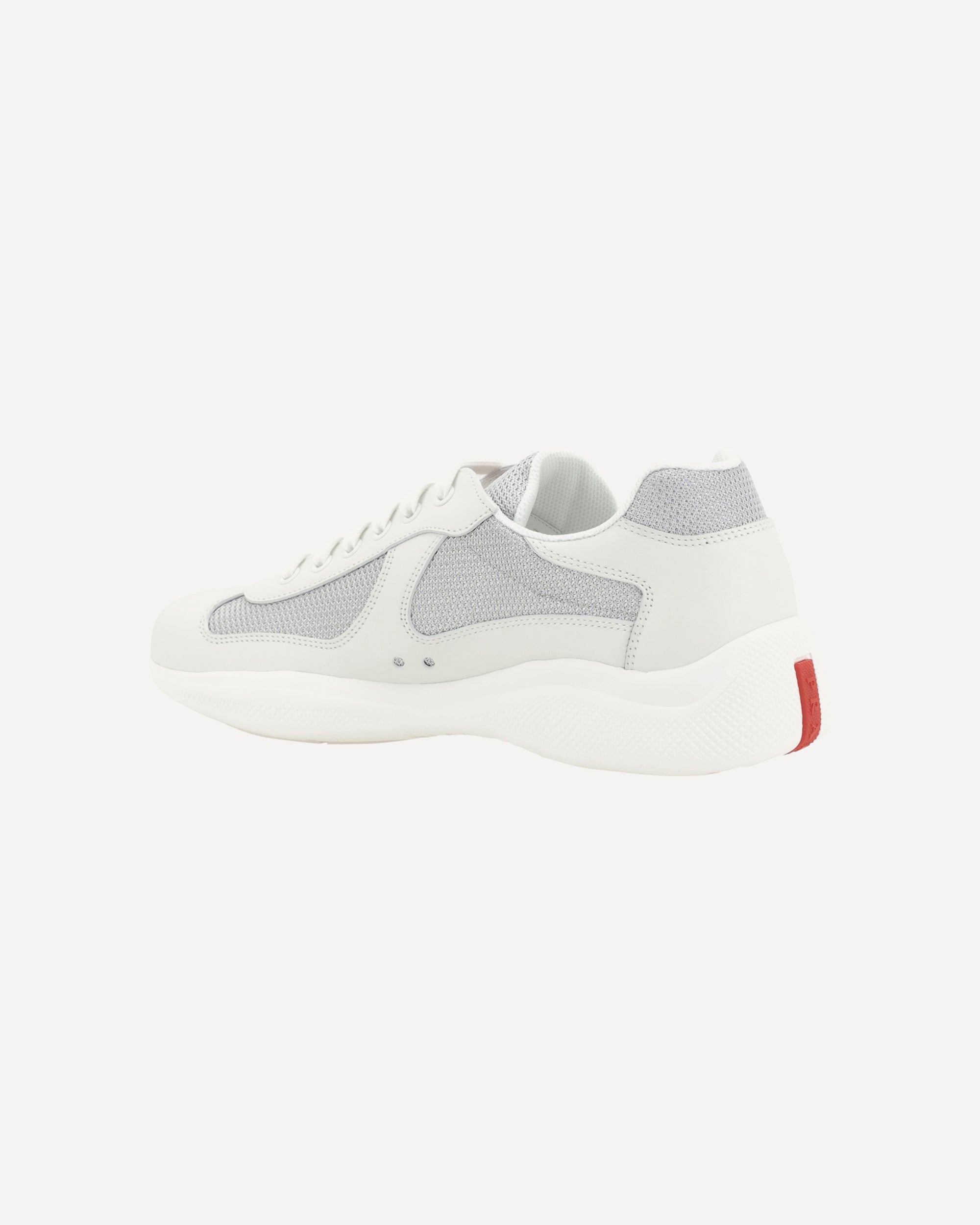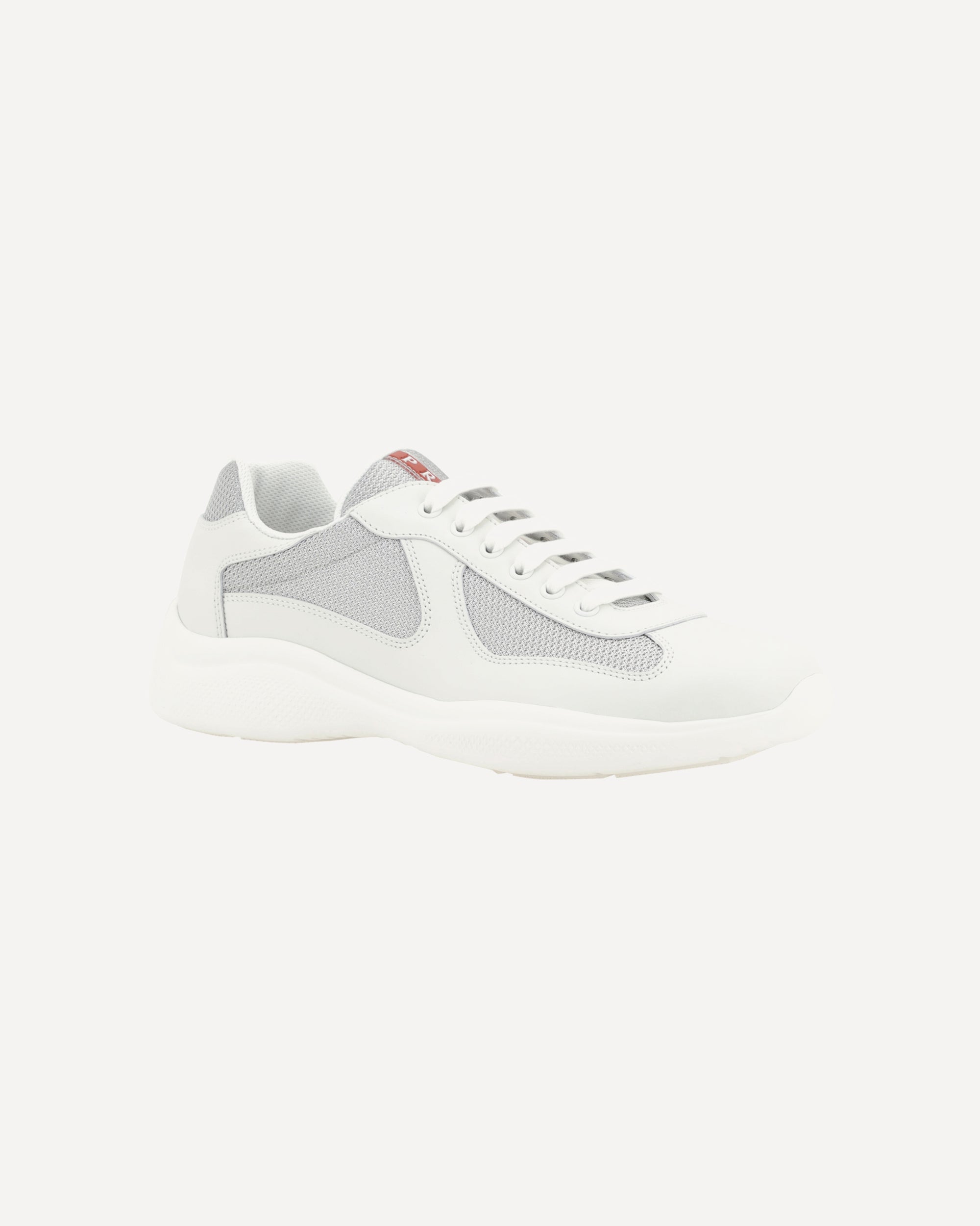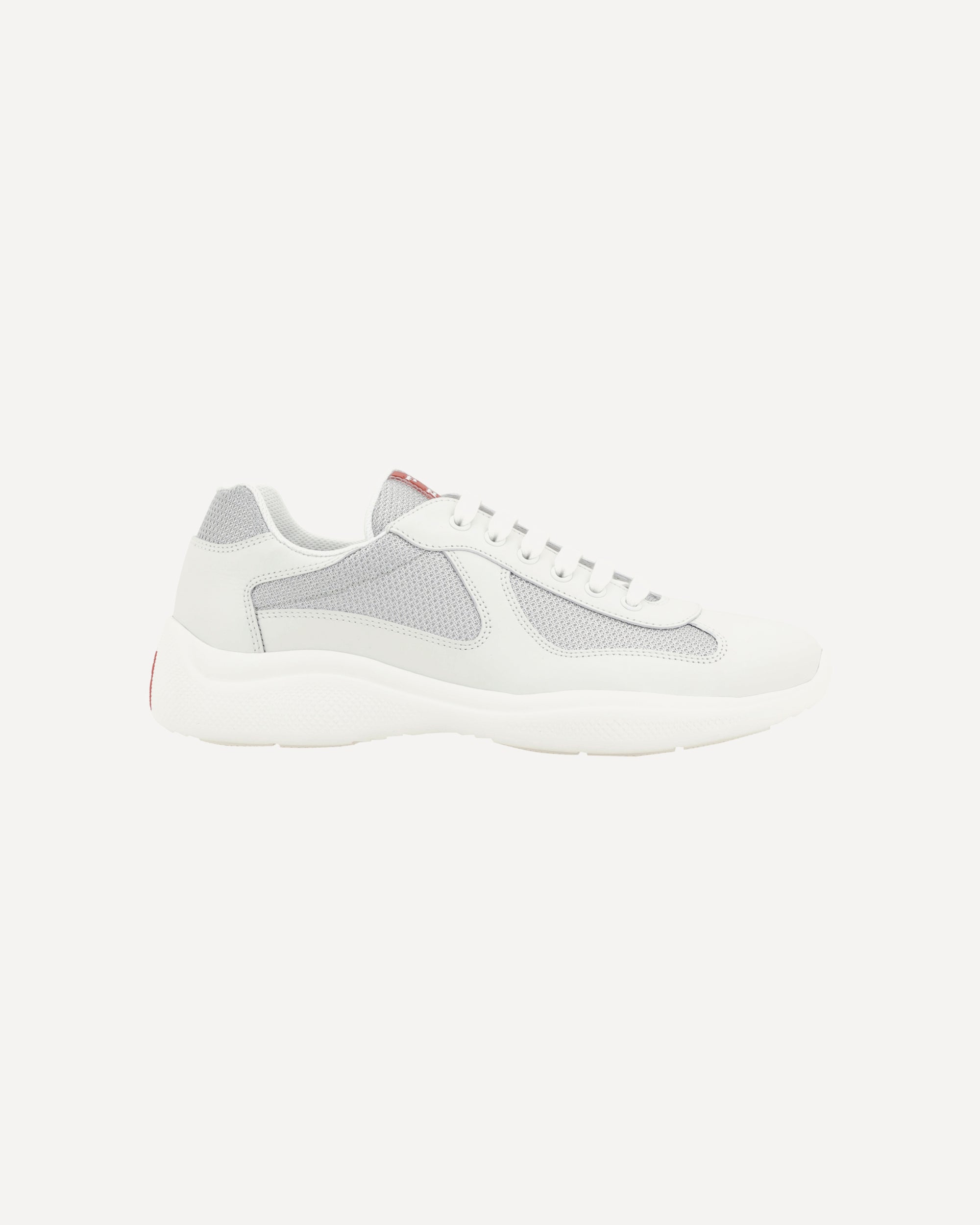 Prada's America's Sneakers are a modern and stylish interpretation of the classic sneaker, ideal for those seeking comfort without sacrificing style. Featuring a lace-up closure, they offer an adjustable and secure fit. The slightly elongated toe adds a distinctive touch, while the textured sole ensures a stable and comfortable walk. The leather and fabric panel design creates a dynamic and contemporary visual effect, while the brand's iconic applique logo on the tongue adds an understated luxury detail.