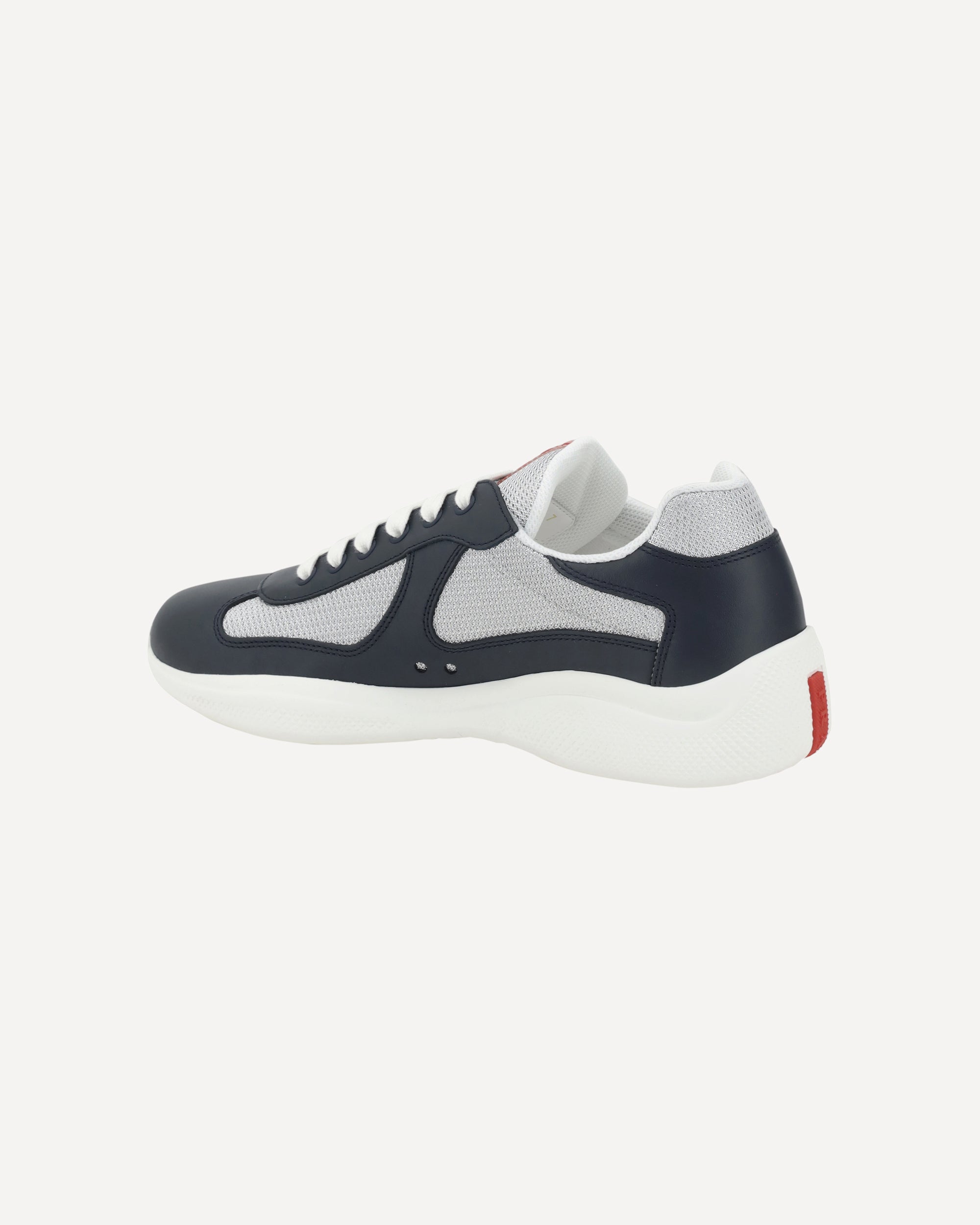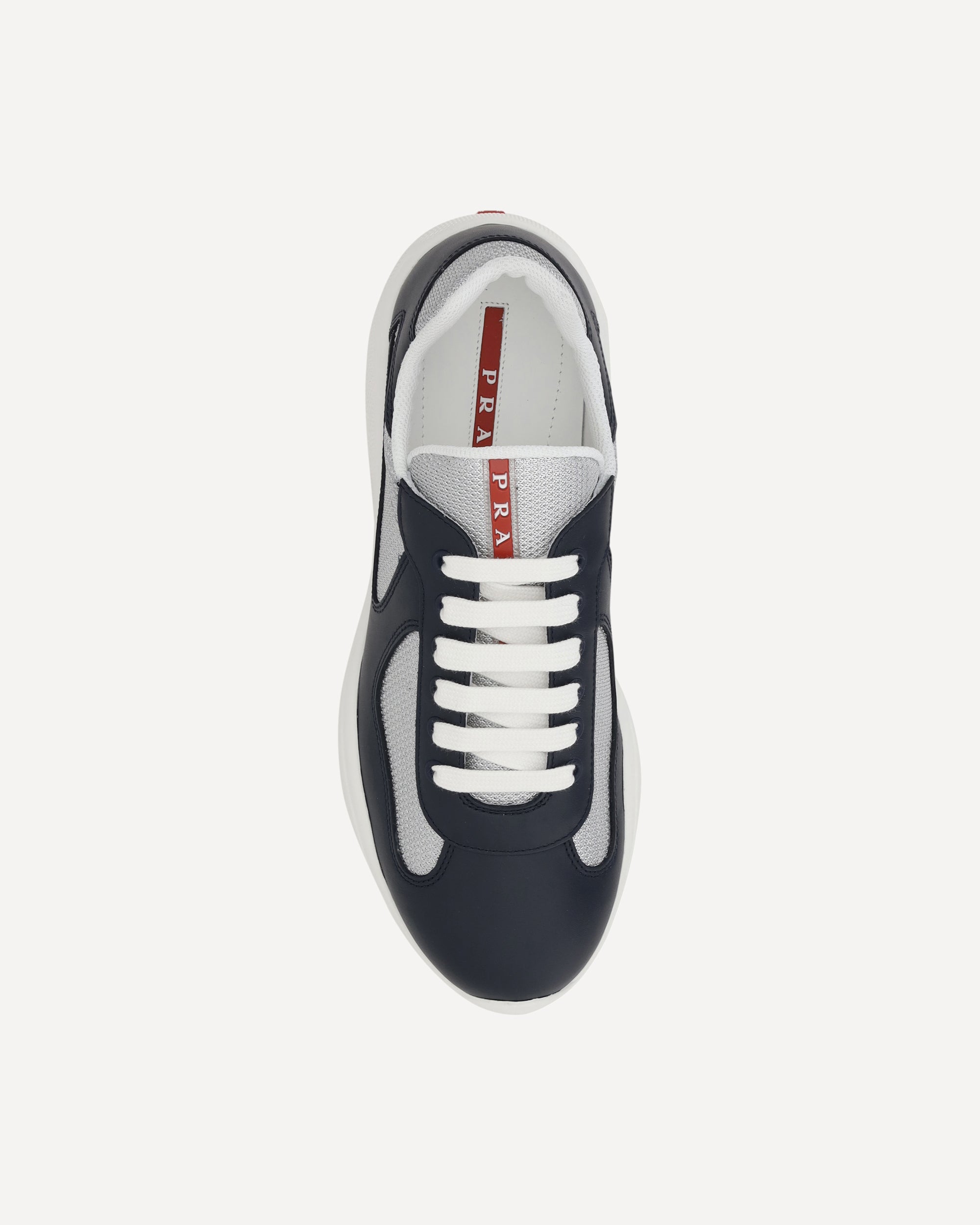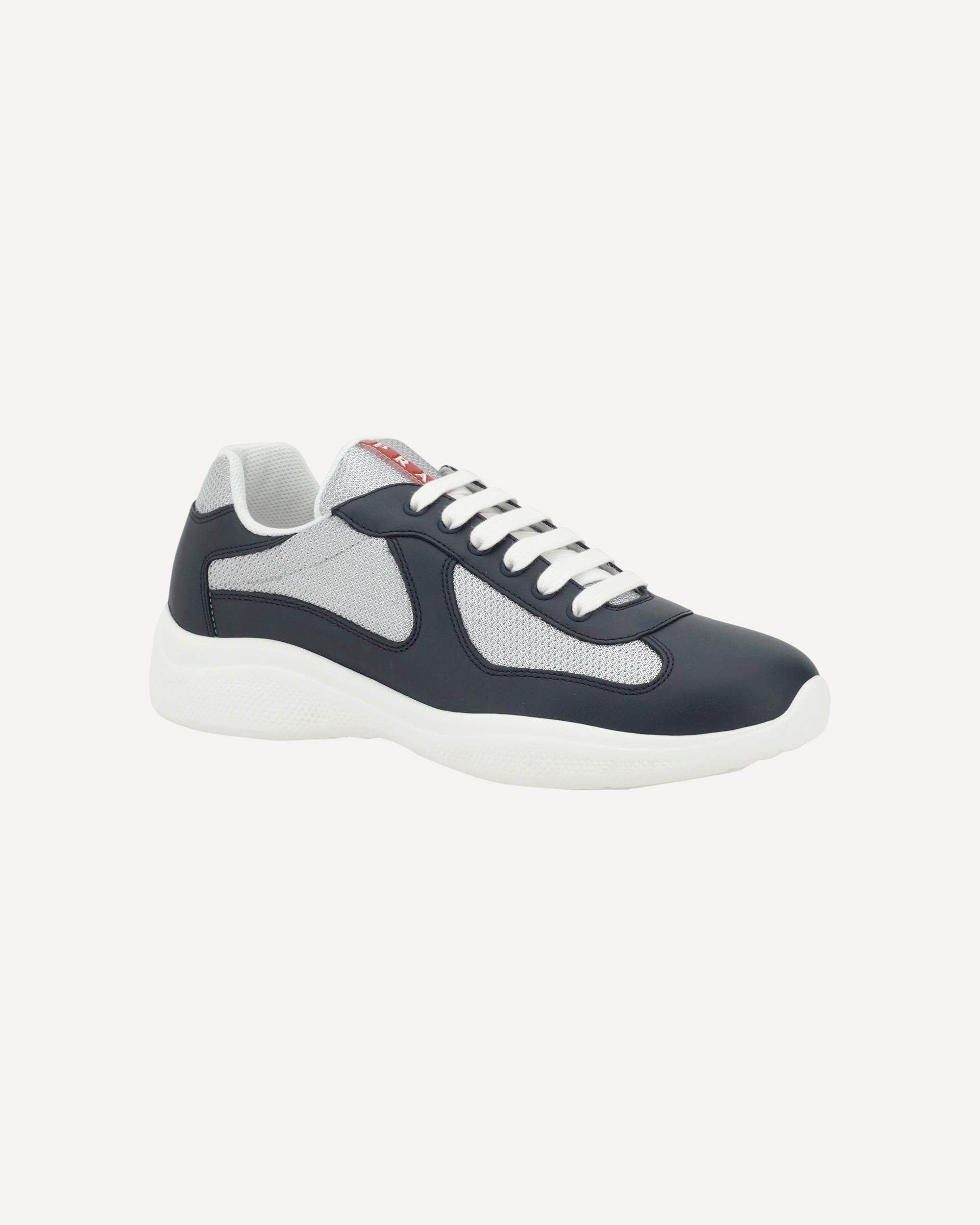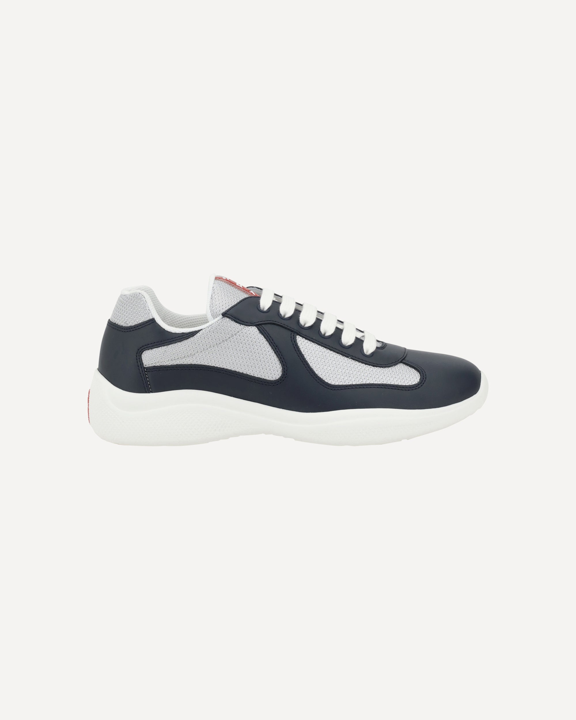 Prada's America's Sneakers are a modern and stylish interpretation of the classic sneaker, ideal for those seeking comfort without sacrificing style. Featuring a lace-up closure, they offer an adjustable and secure fit. The slightly elongated toe adds a distinctive touch, while the textured sole ensures a stable and comfortable walk. The leather and fabric panel design creates a dynamic and contemporary visual effect, while the brand's iconic applique logo on the tongue adds an understated luxury detail.