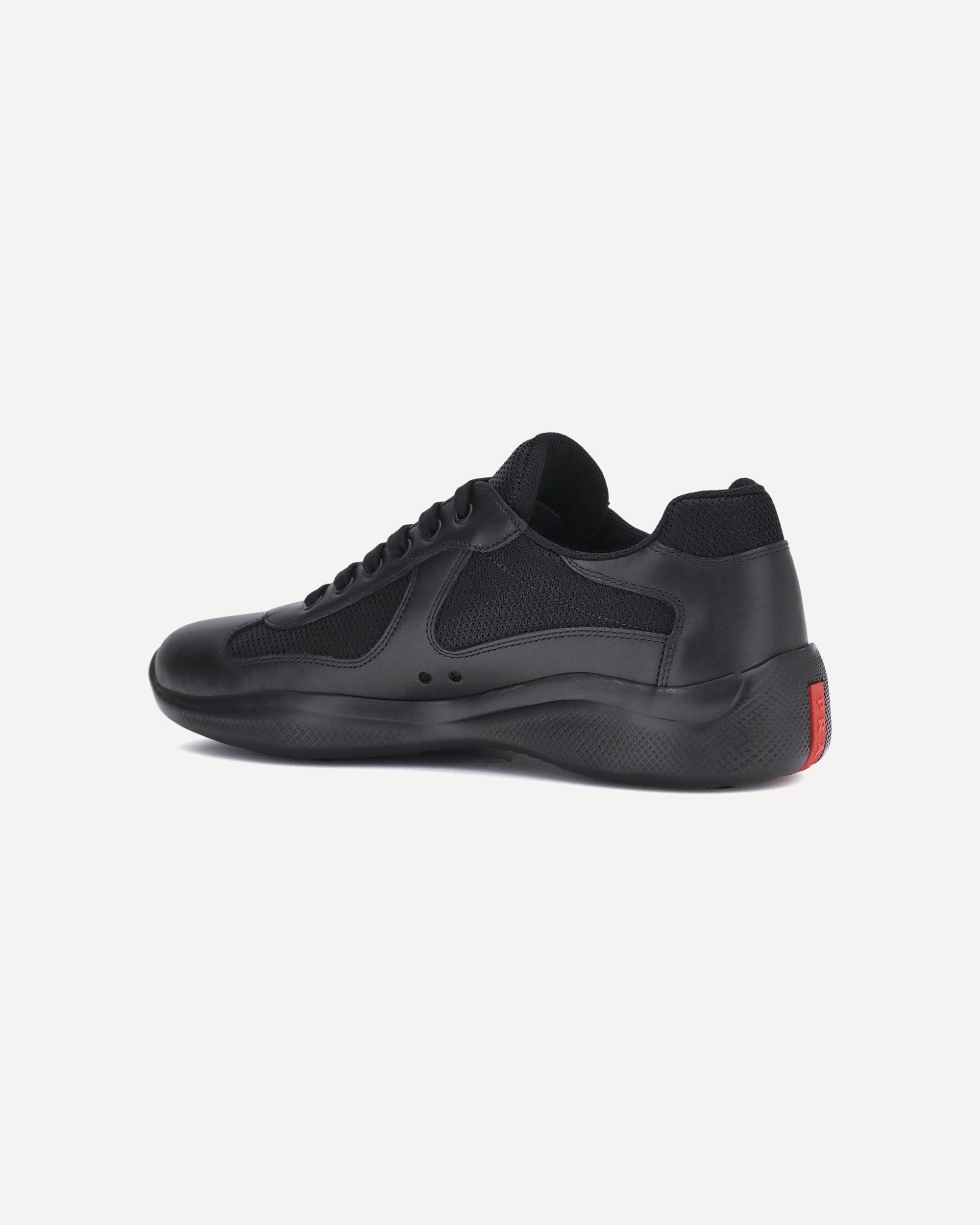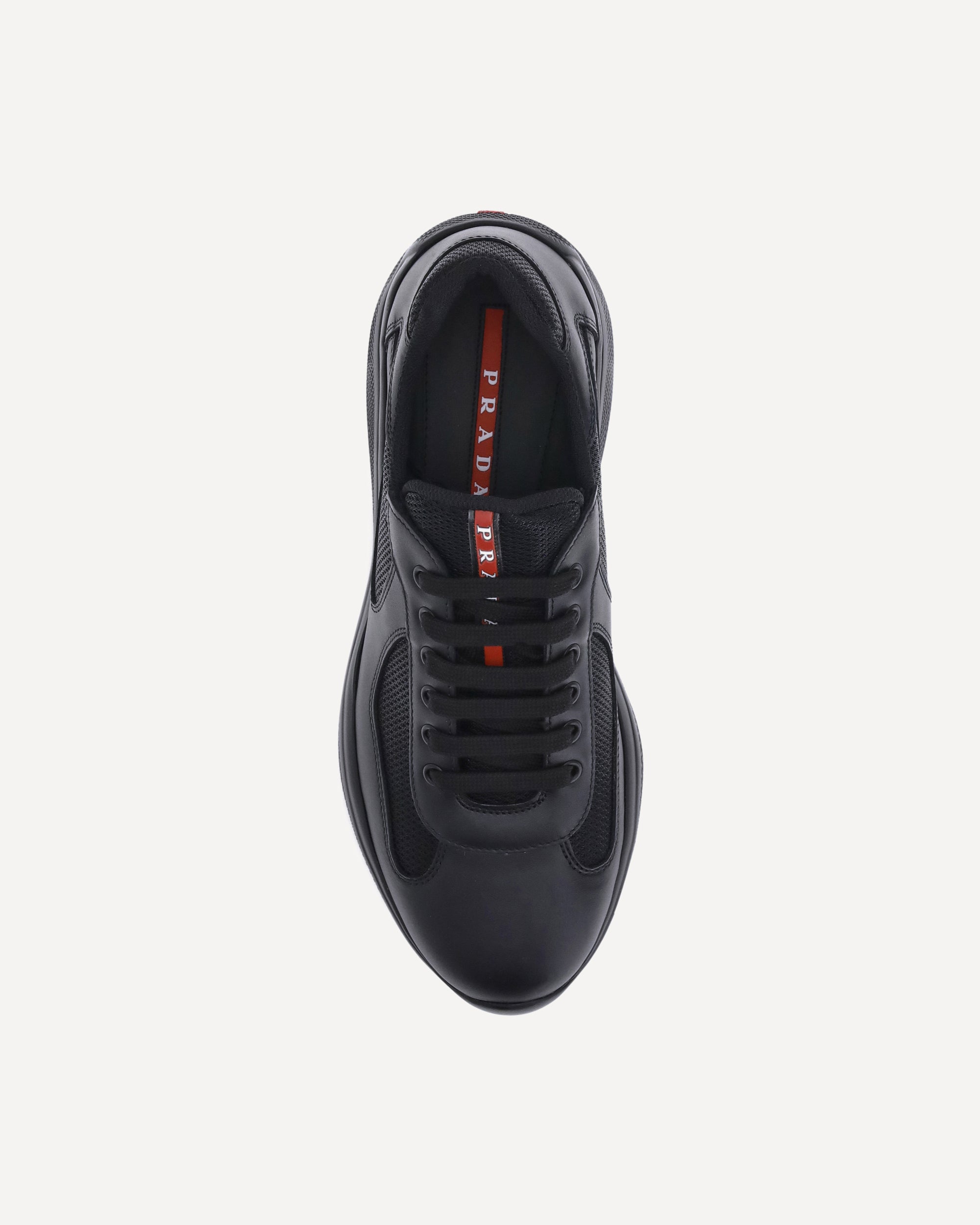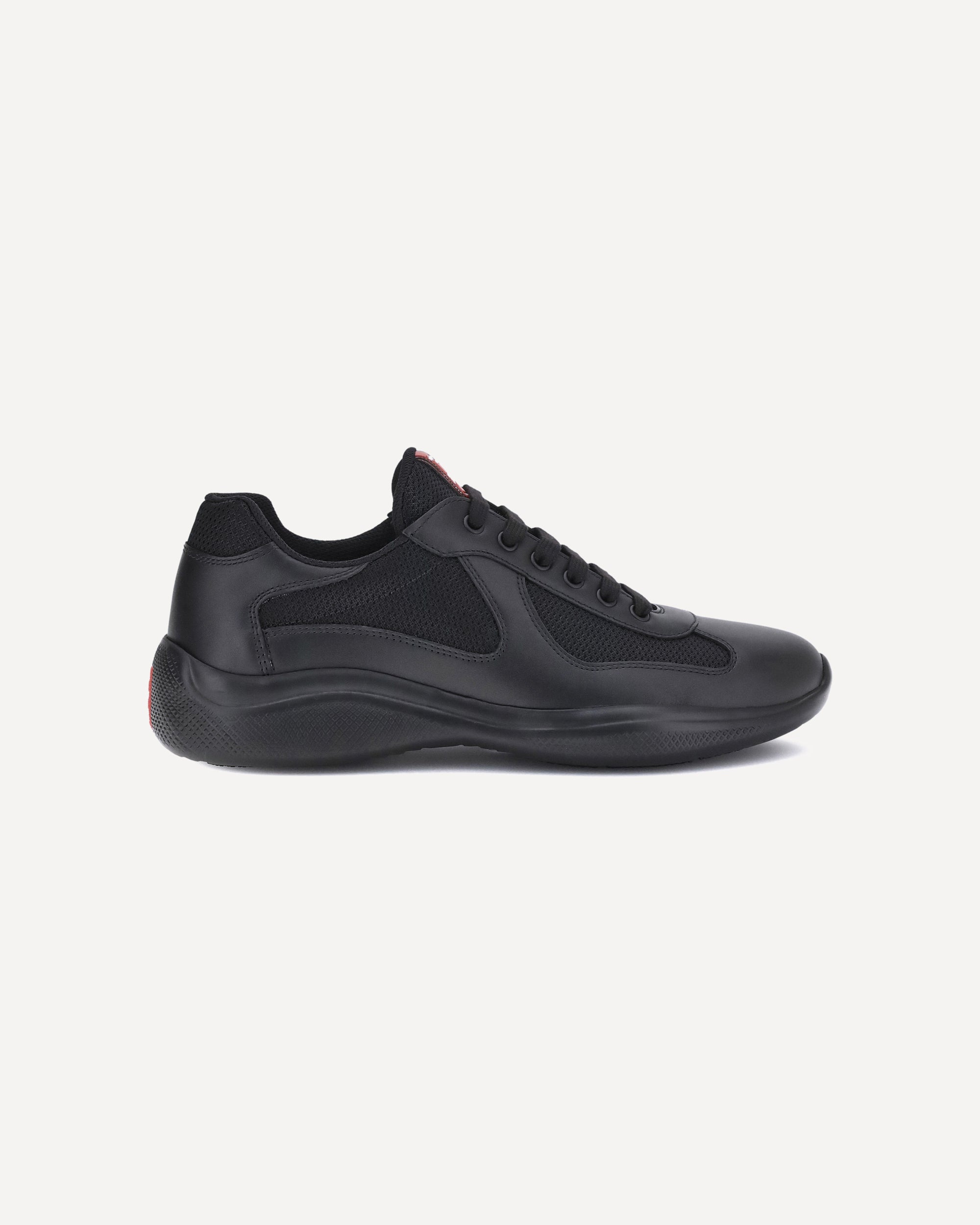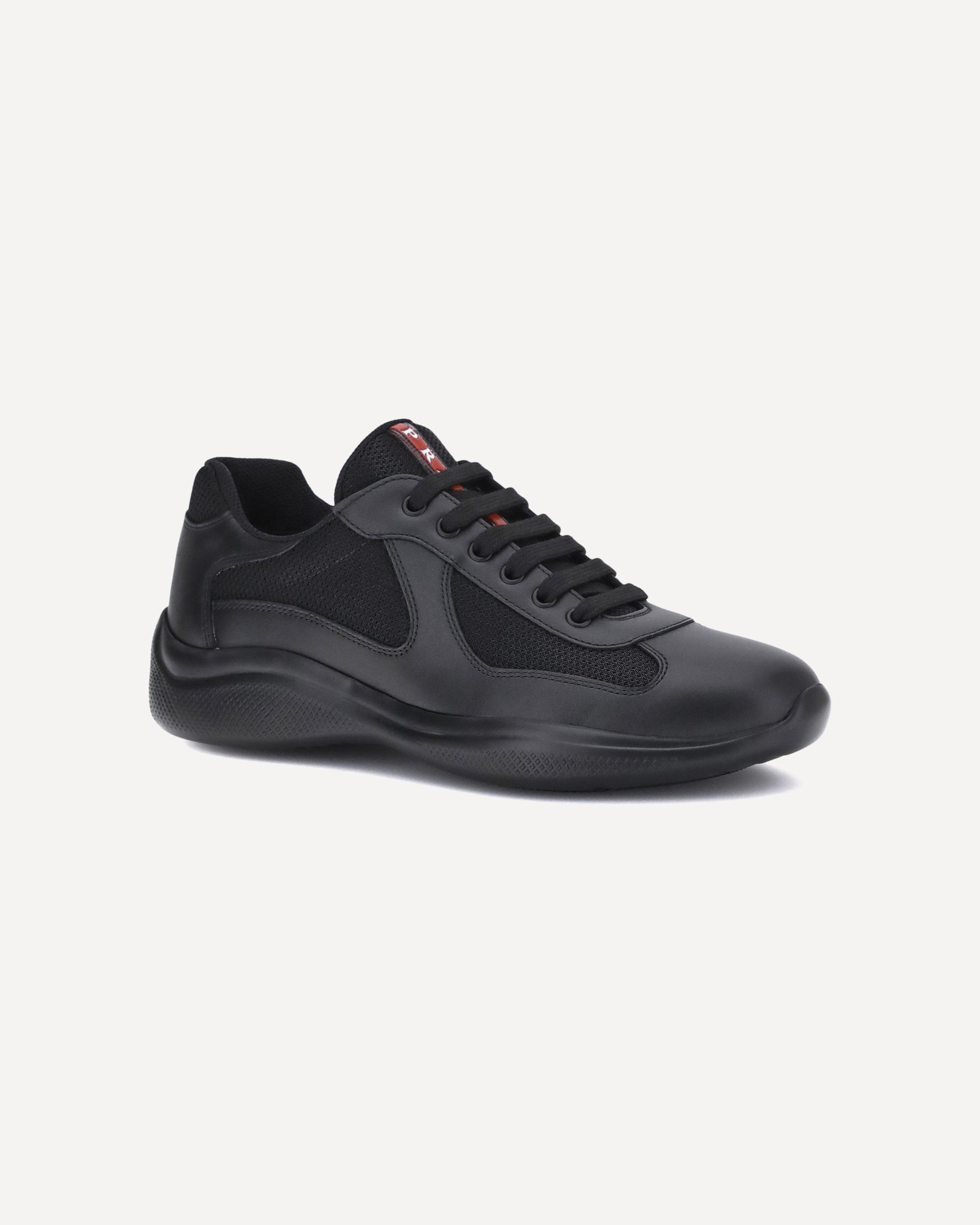 Prada's America's Sneakers are a modern and stylish interpretation of the classic sneaker, ideal for those seeking comfort without sacrificing style. Featuring a lace-up closure, they offer an adjustable and secure fit. The slightly elongated toe adds a distinctive touch, while the textured sole ensures a stable and comfortable walk. The leather and fabric panel design creates a dynamic and contemporary visual effect, while the brand's iconic applique logo on the tongue adds an understated luxury detail.