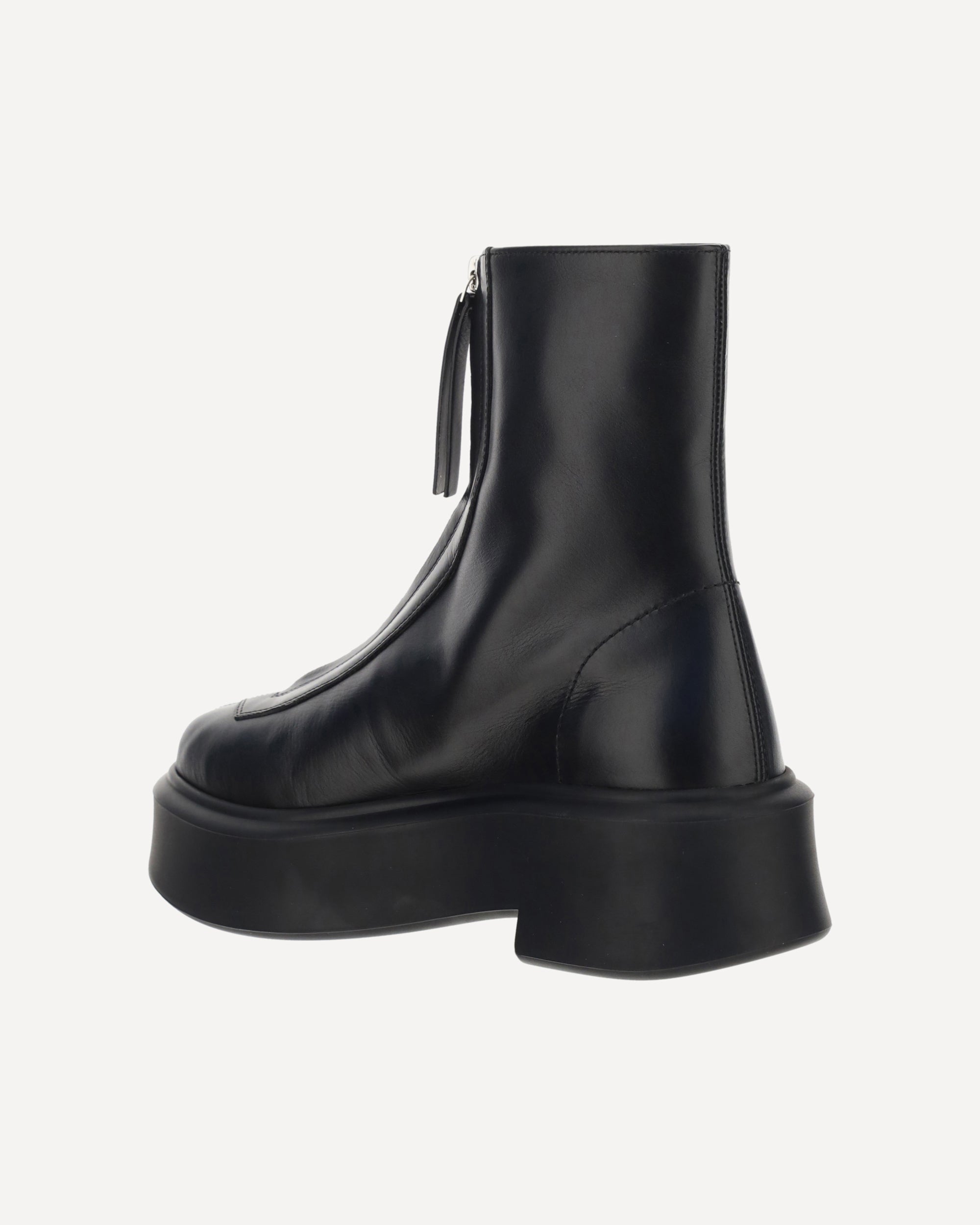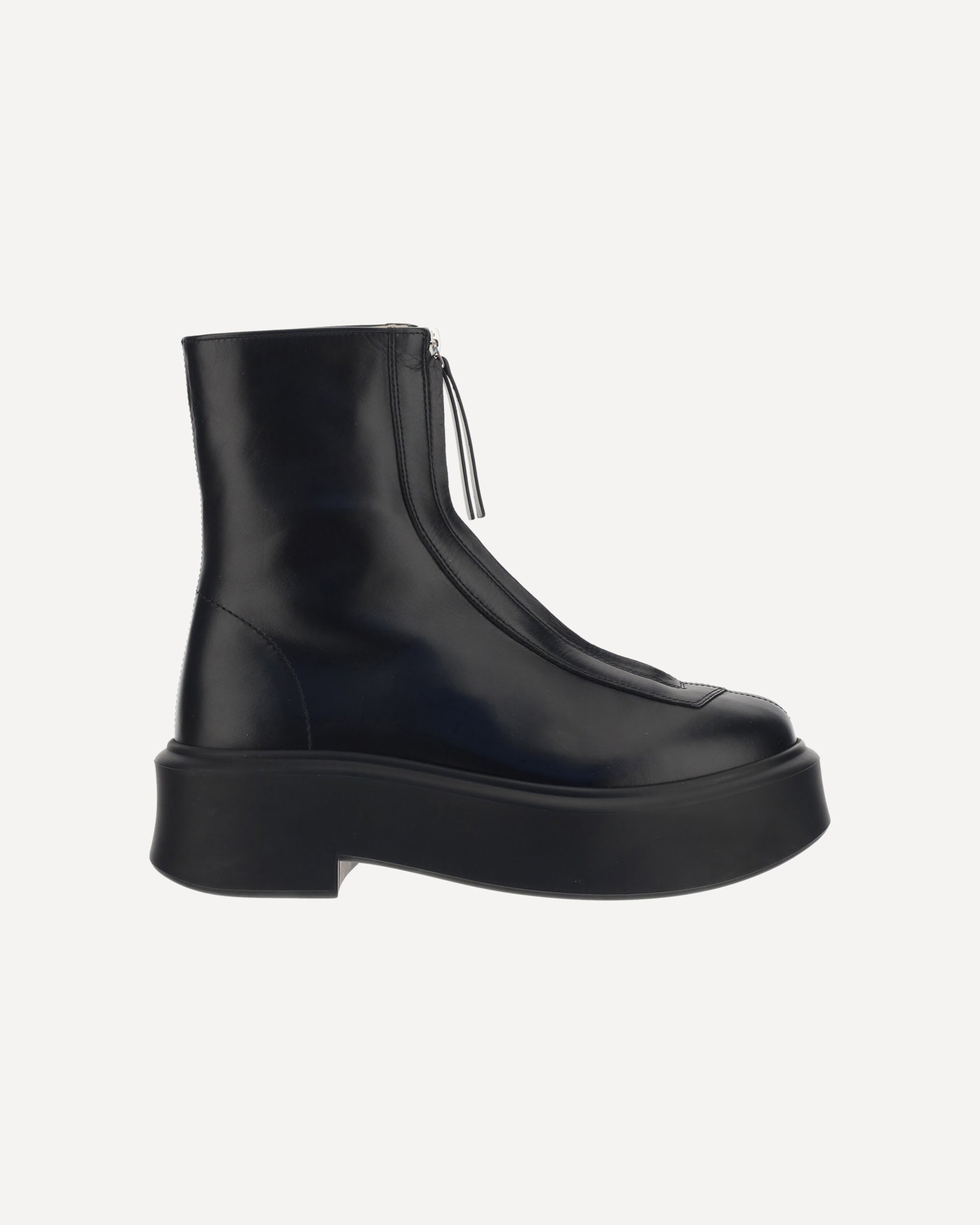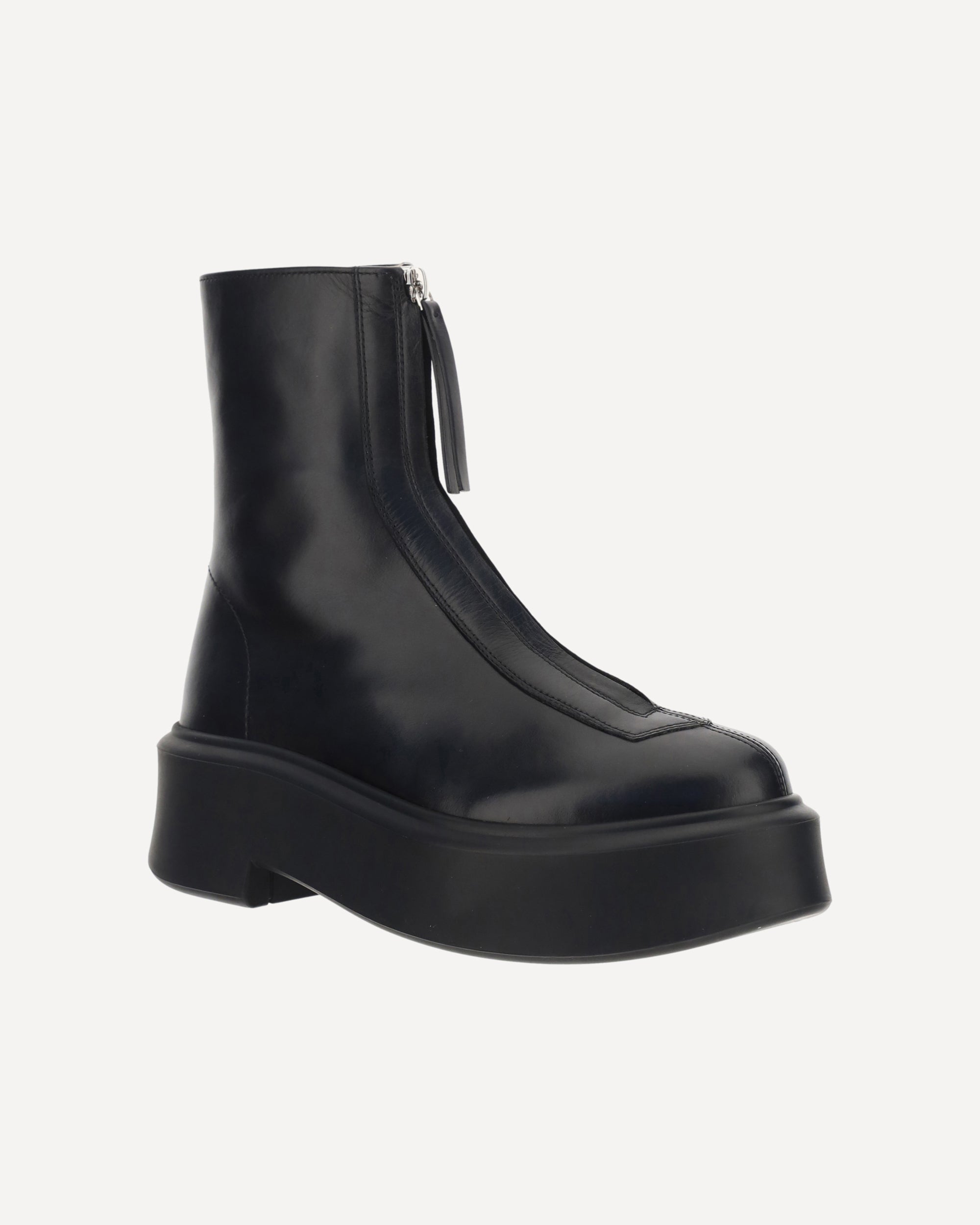 Calfskin Ankle Boots by The Row, front zip closure, platform sole, block heel, reinforced round toe, smooth leather design.