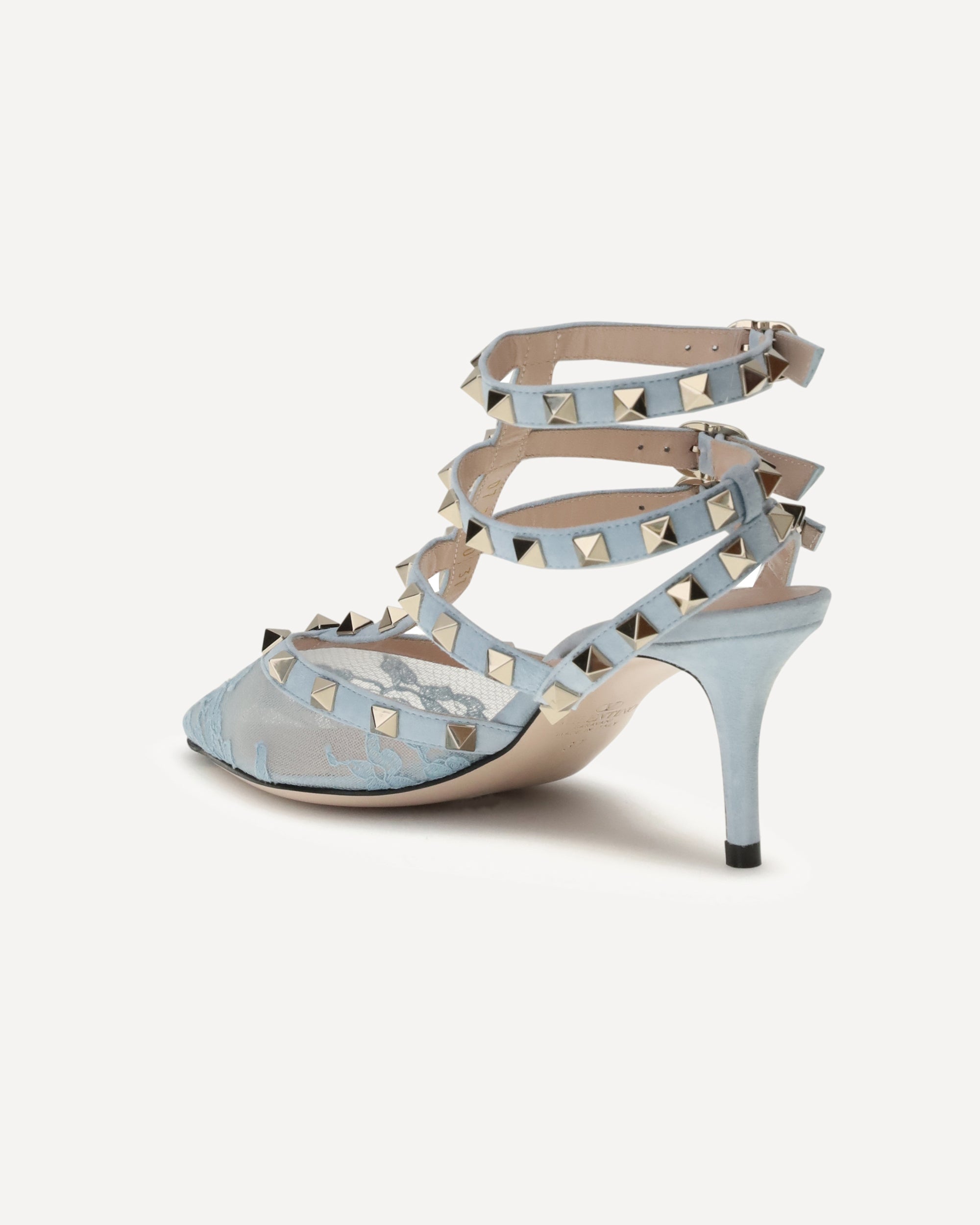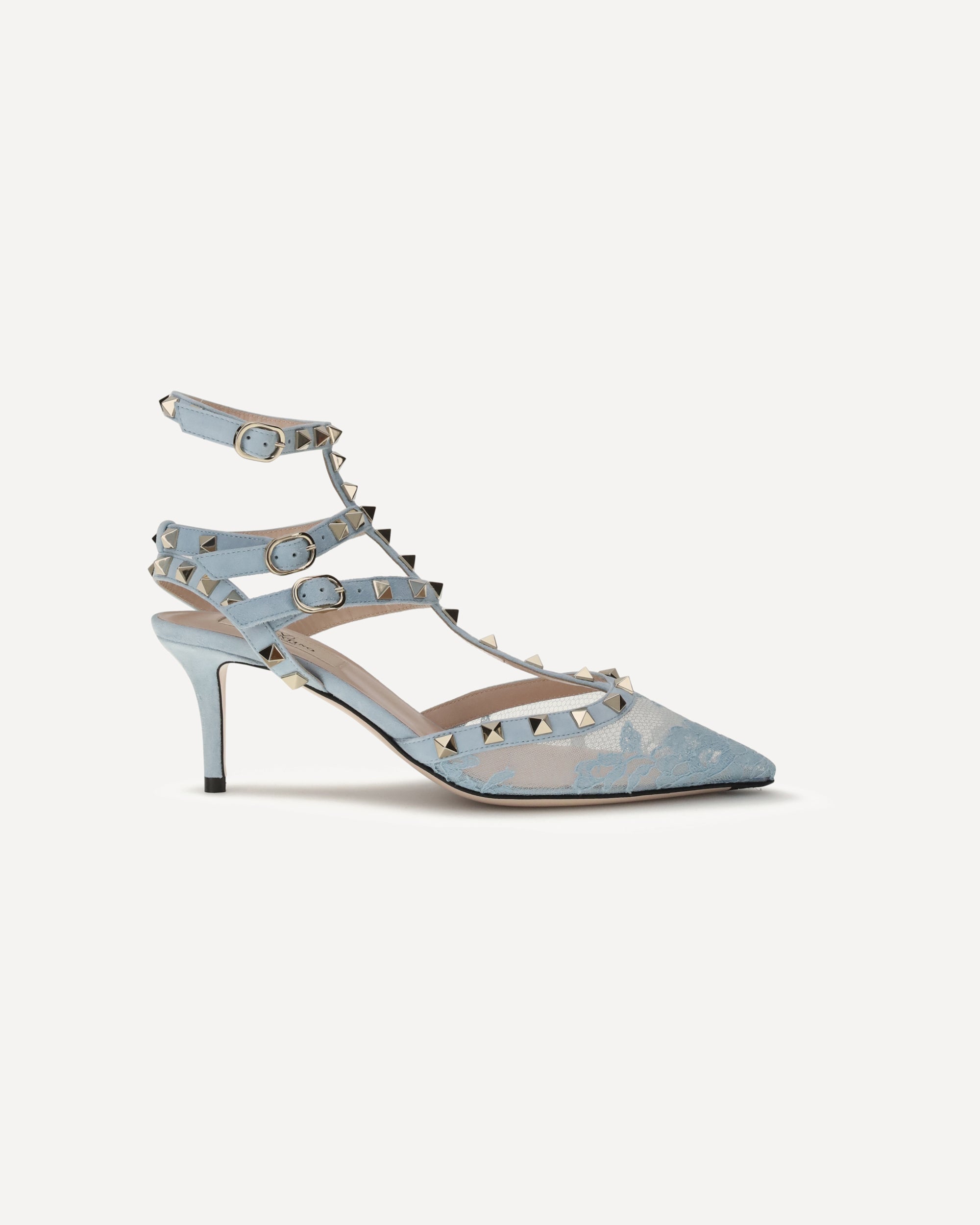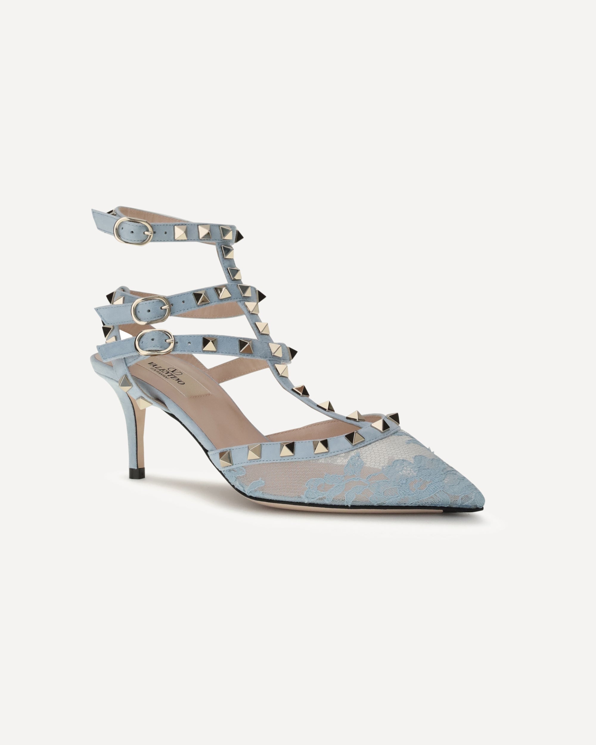 The Rockstud Pumps by Valentino Garavani are crafted from refined lace and embellished with suede straps and trims. Iconic platinum-finish studs and adjustable straps complete the design, offering an elegant style with a bold edge.