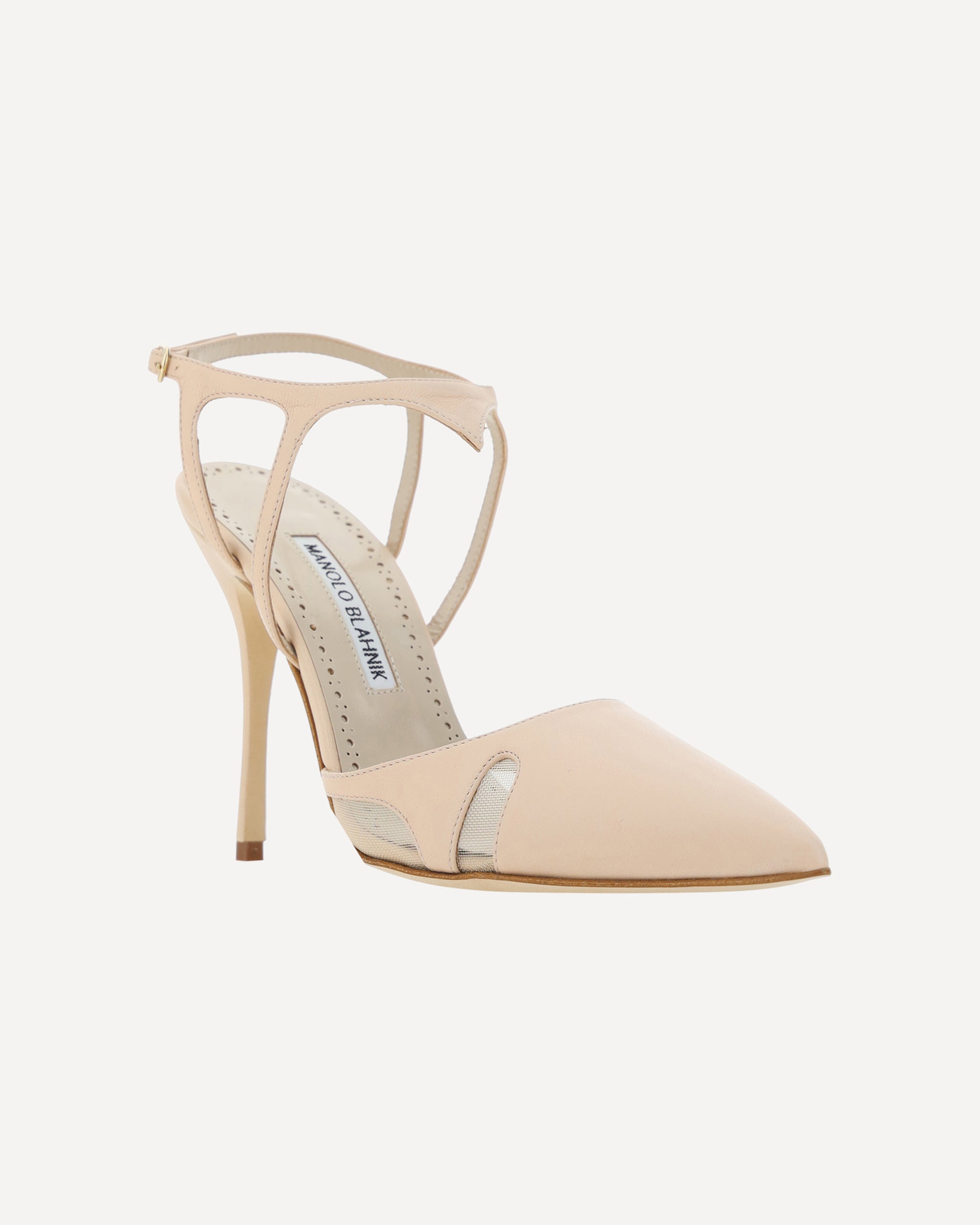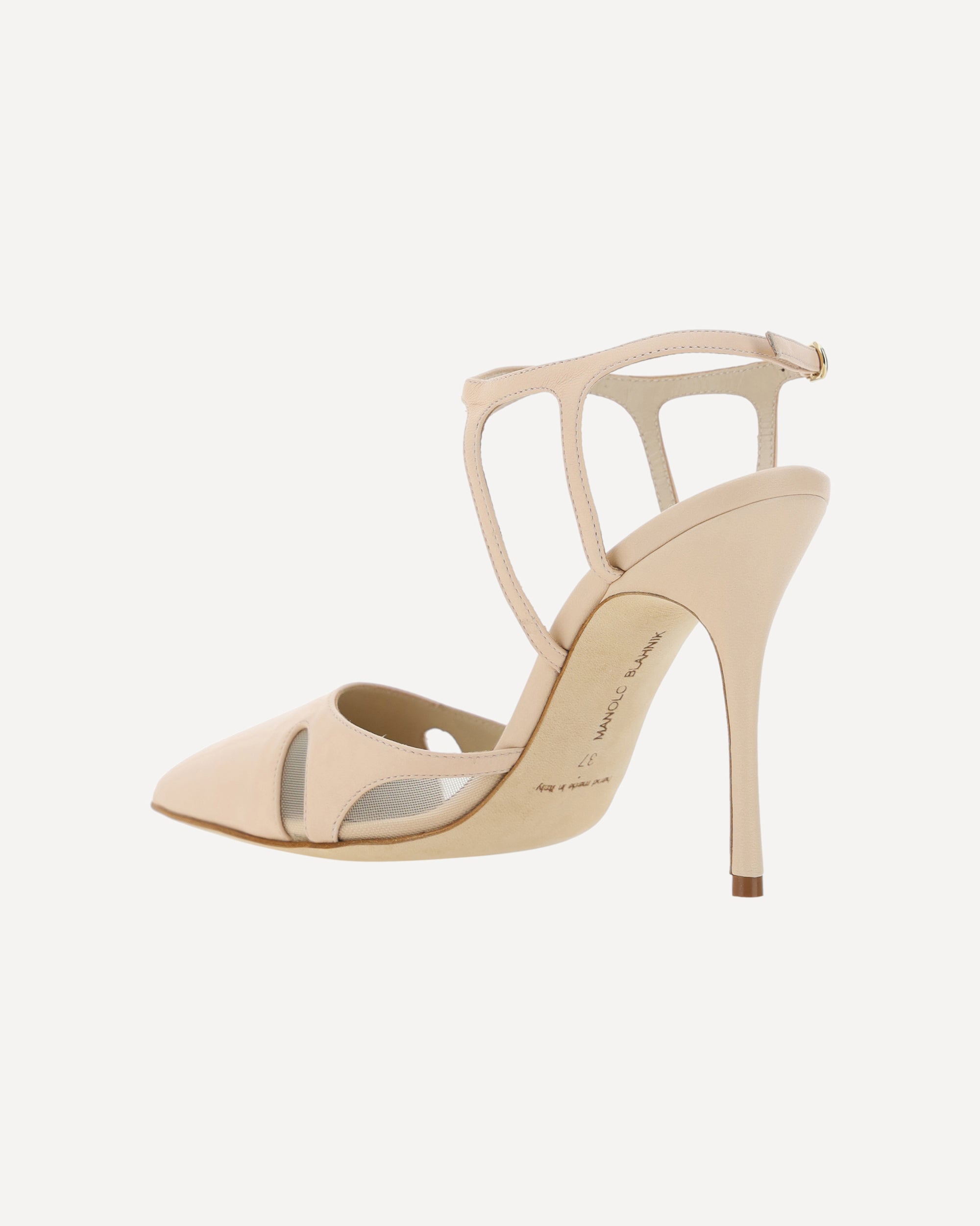Calfskin Arcadia Fabio Pumps by Manolo Blahnik featuring an almond toe at front, a leather stiletto heel, a closure by means of an adjustable strap around the ankle, cut-out details on the upper, and a contrasting logo insole.