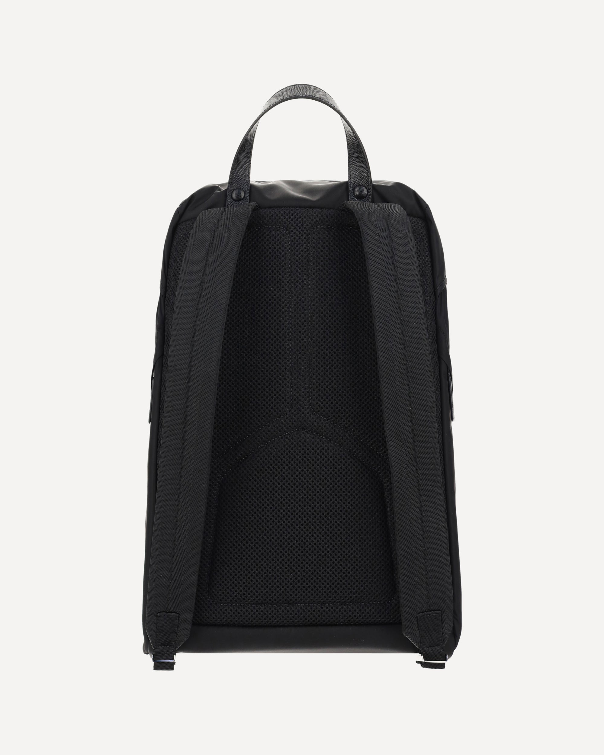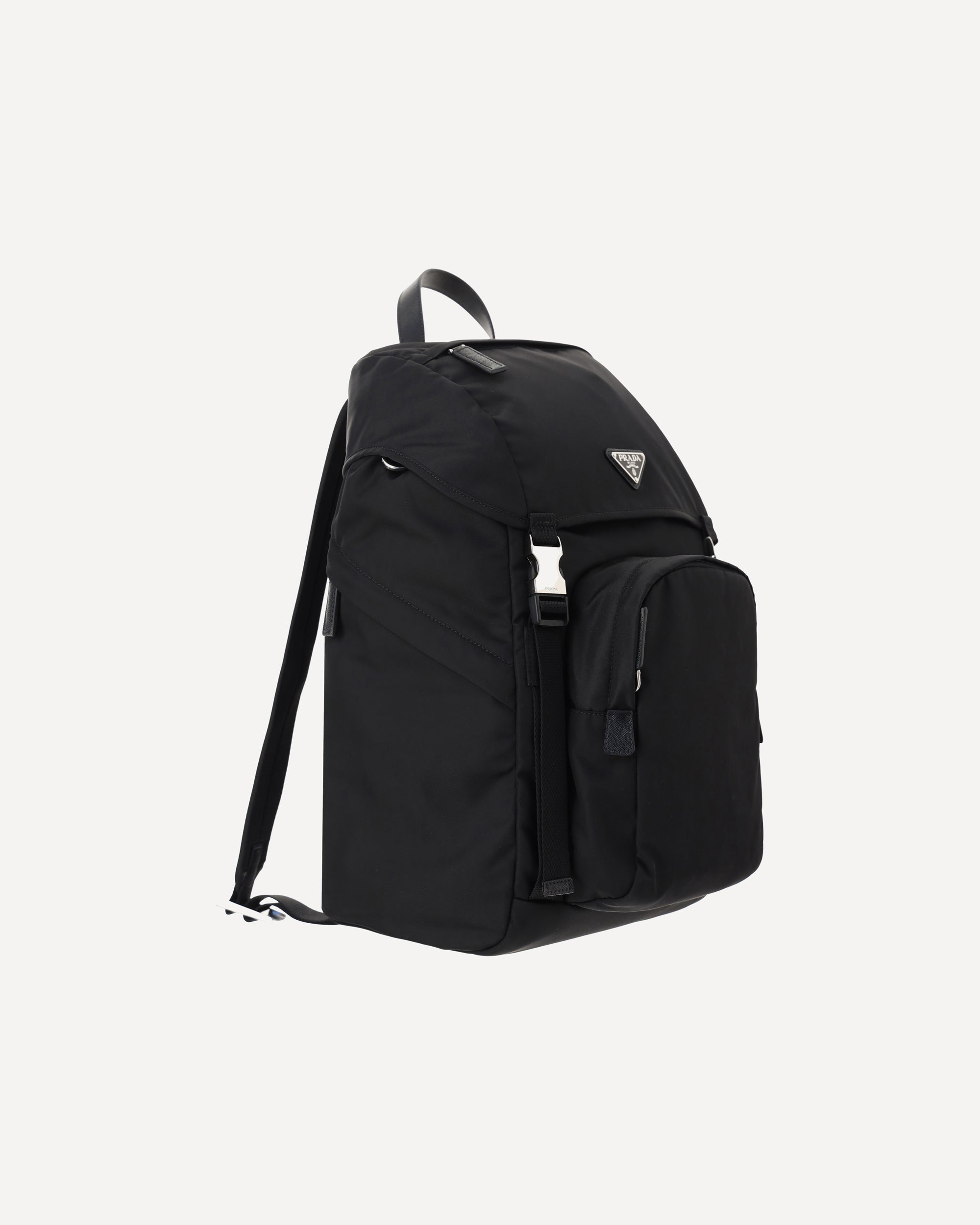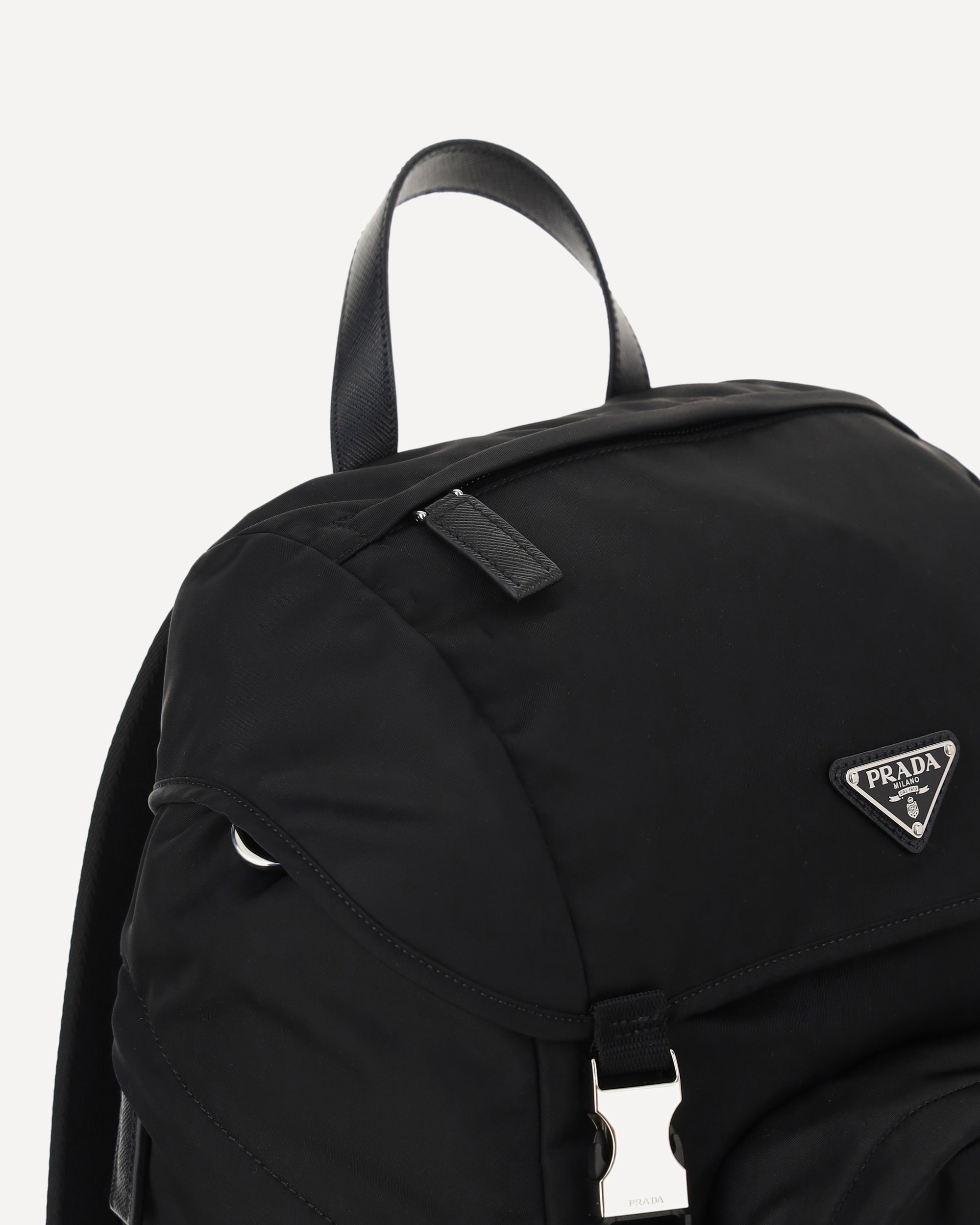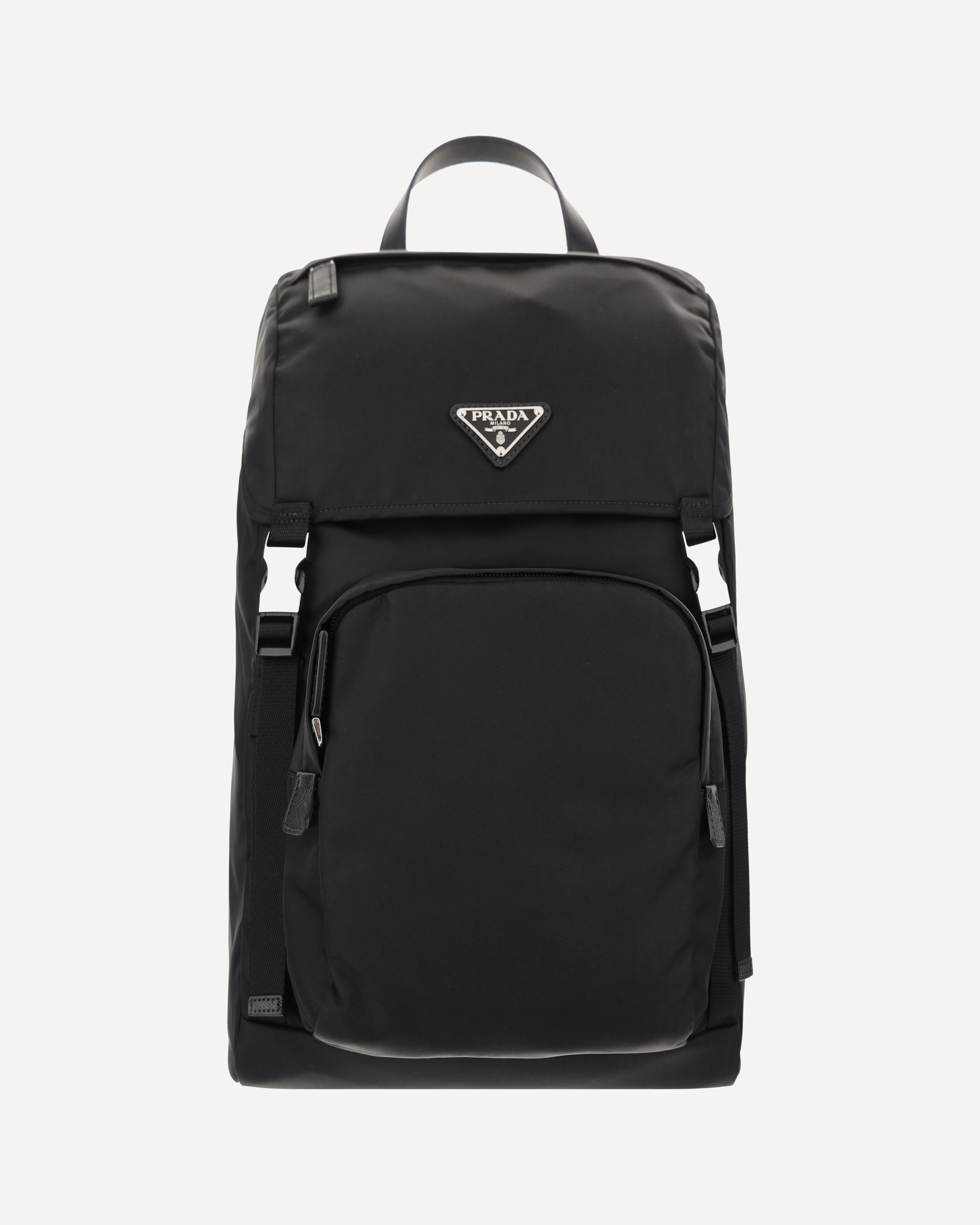 Re-Nylon Backpack by Prada, enamel triangle with brand logo appliqué on front, round handle, double adjustable shoulder straps, front flap closure, drawstring closure, zippered pockets, mesh panels, single compartment, and interior zippered pocket.