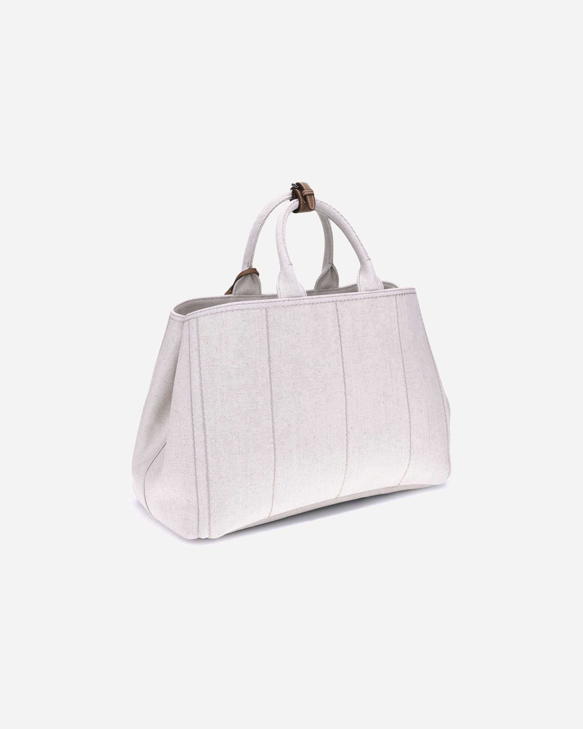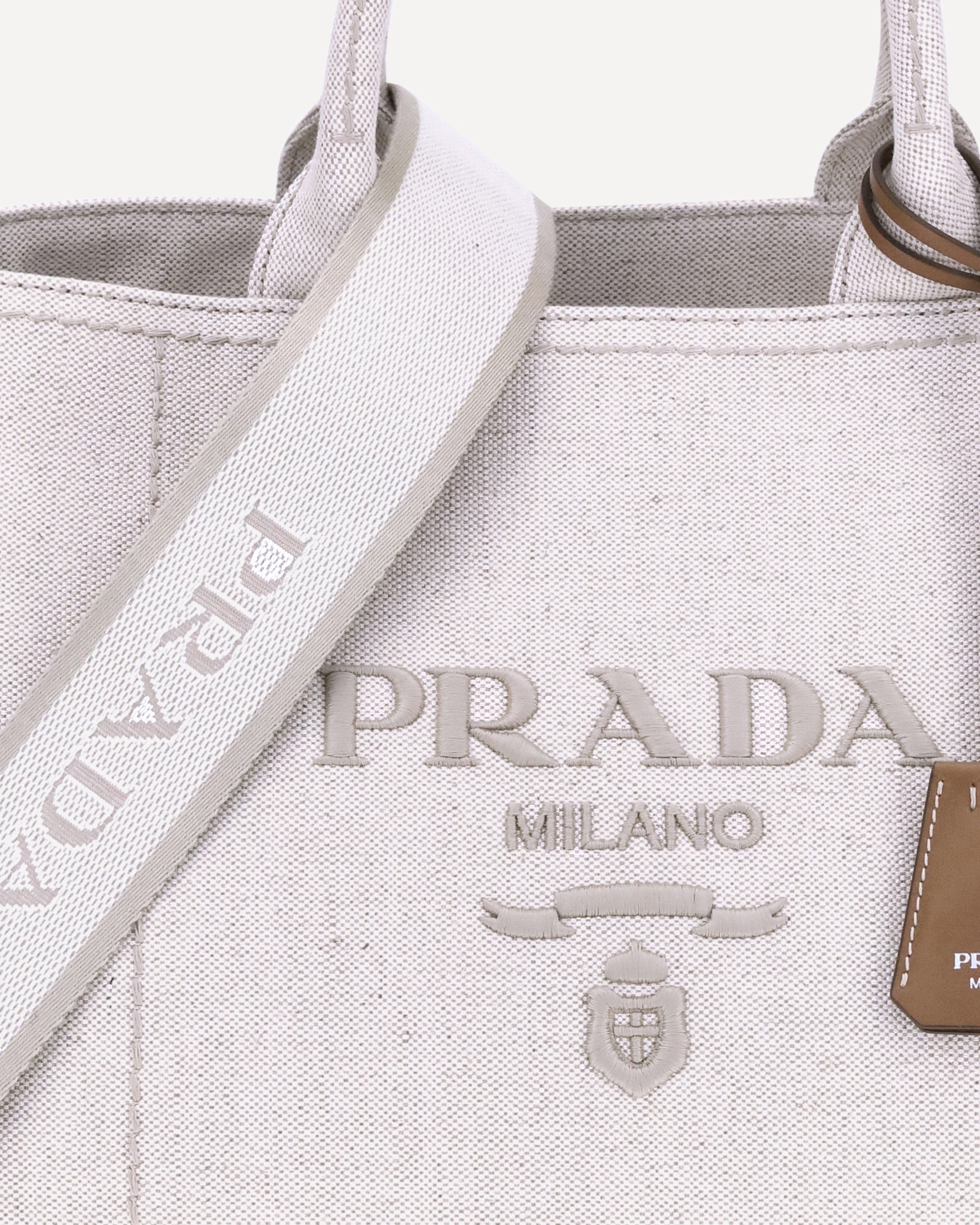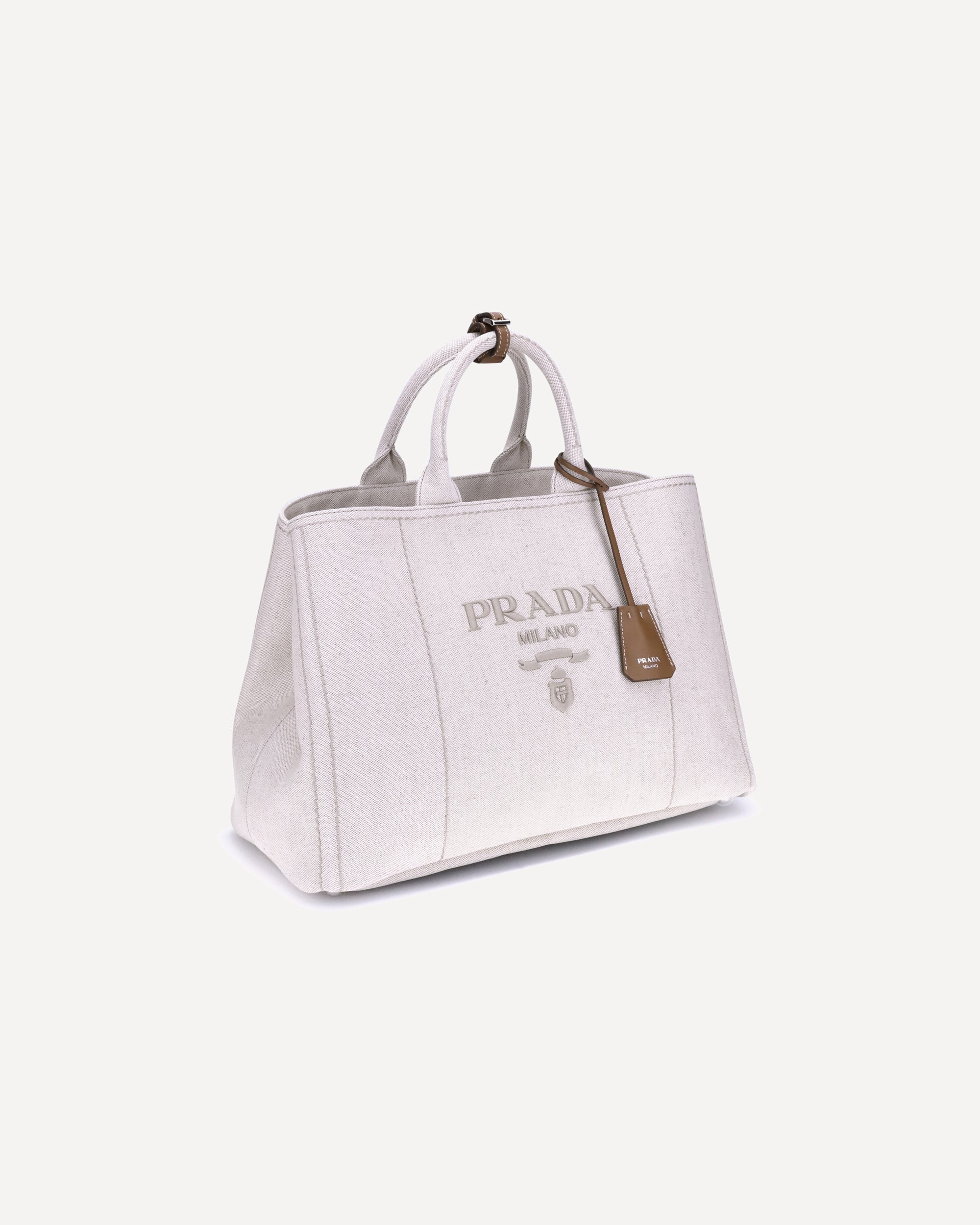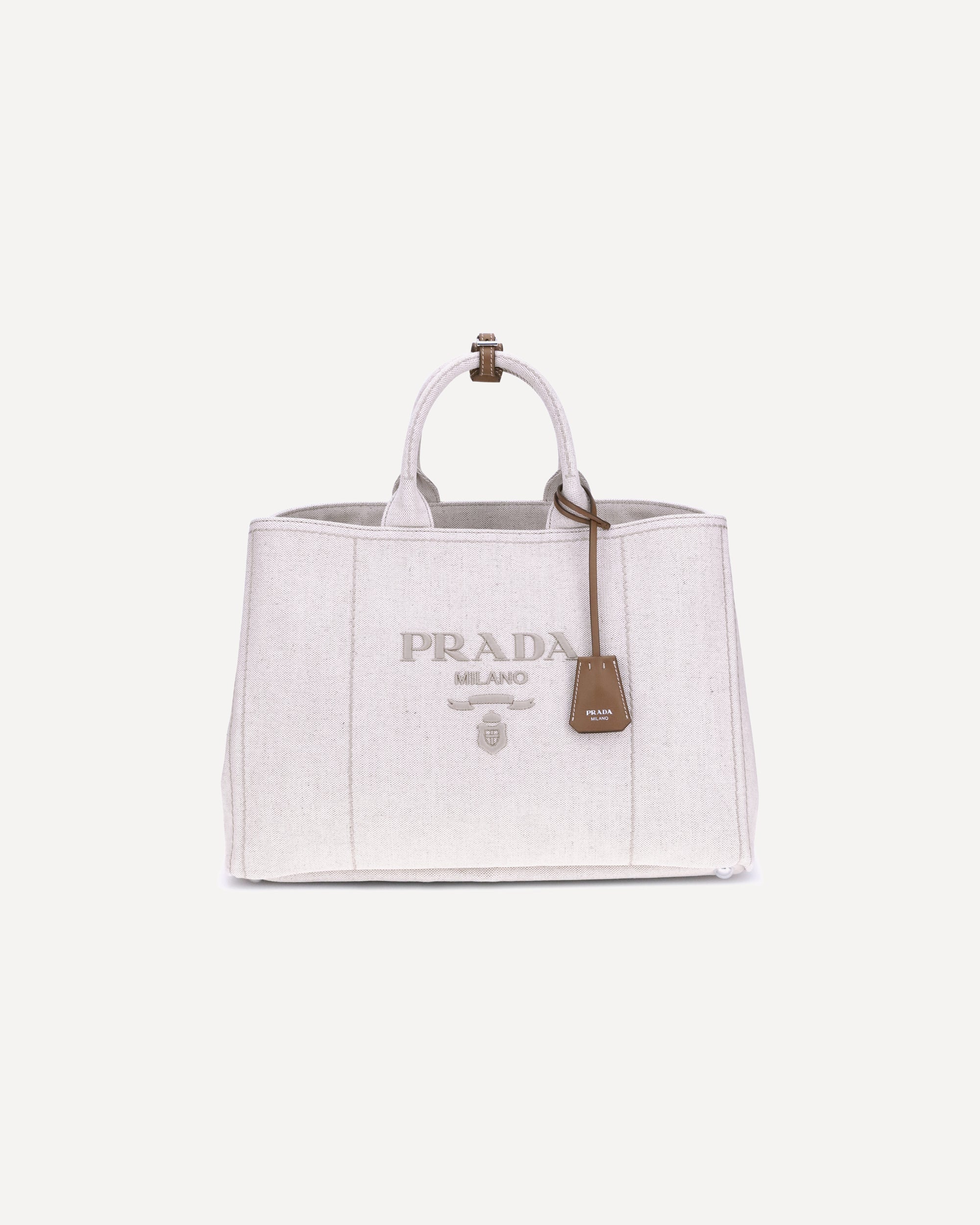 Prada's extra large Jardinière Handbag combines elegance and functionality in a high-quality linen blend. Featuring two tubular handles and exposed topstitching, it has an adjustable and removable ribbon shoulder strap for different modes of use. The design is embellished with embroidered front logo and lettering logo on leather pendant. Side snap button closure and removable leather key ring add practicality. Inside, a zipper pocket and patch pocket provide tidiness, while metal feet protect the base. Perfect for those seeking a capacious and sophisticated accessory.