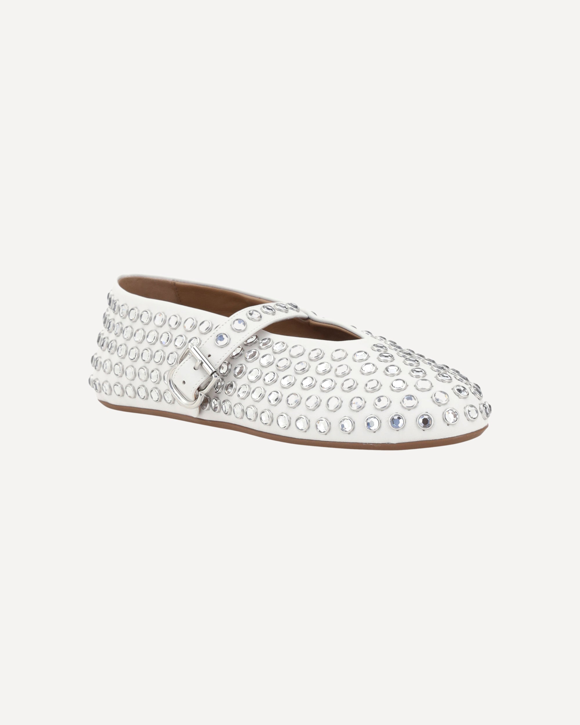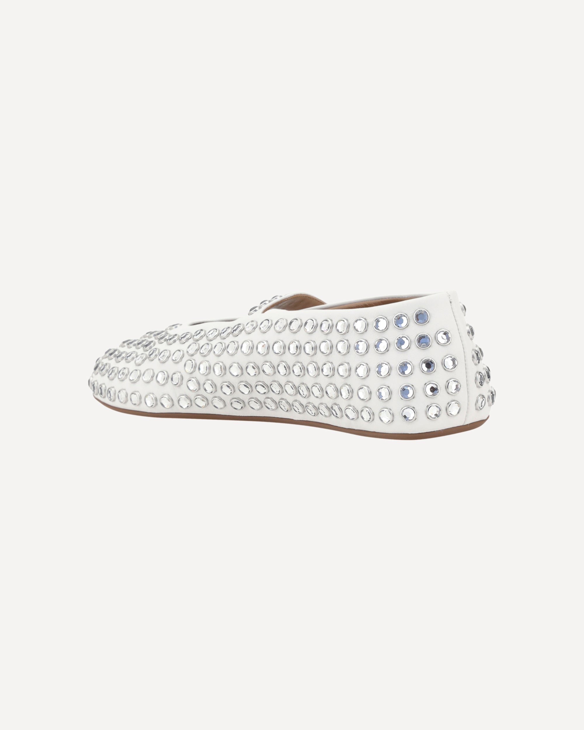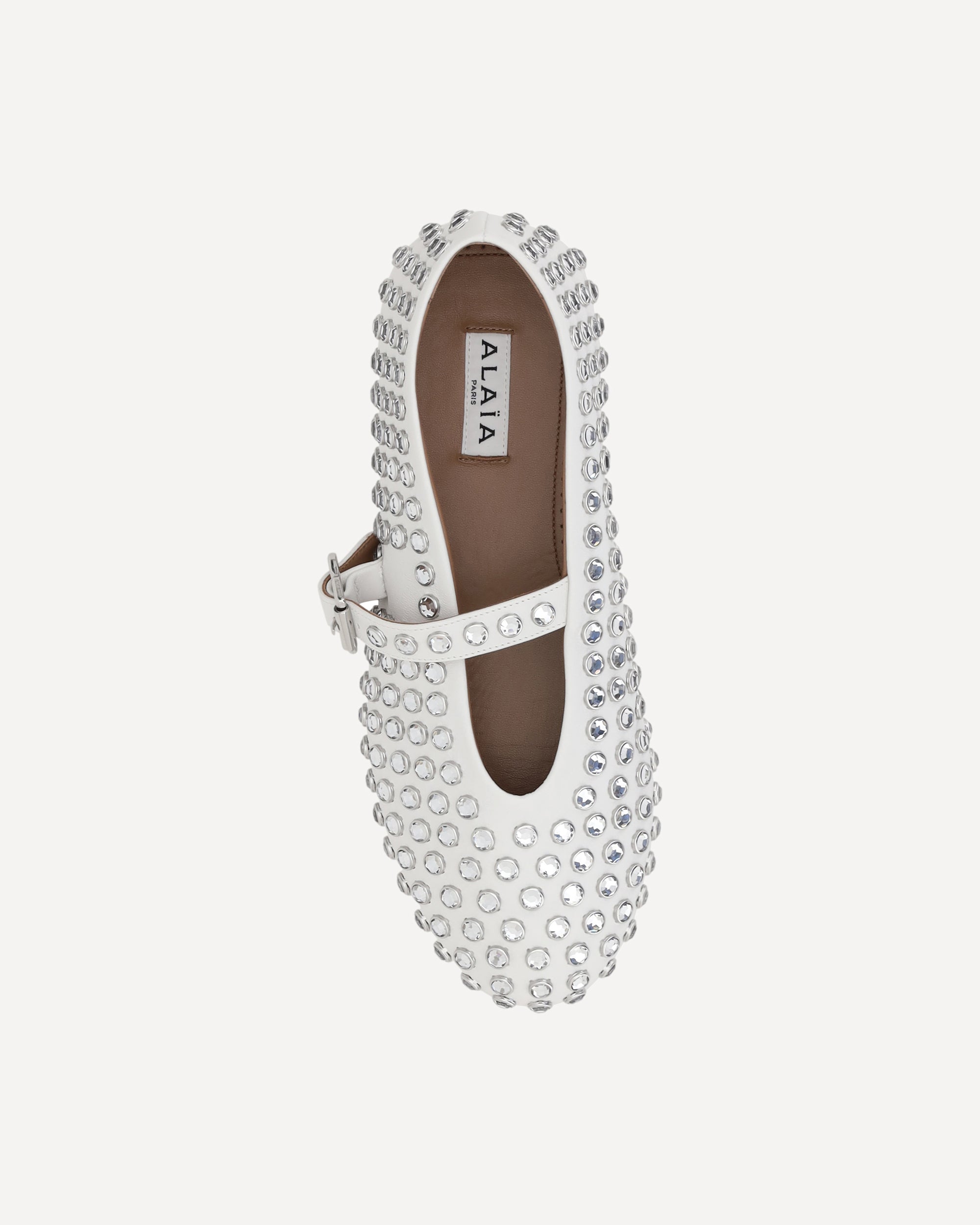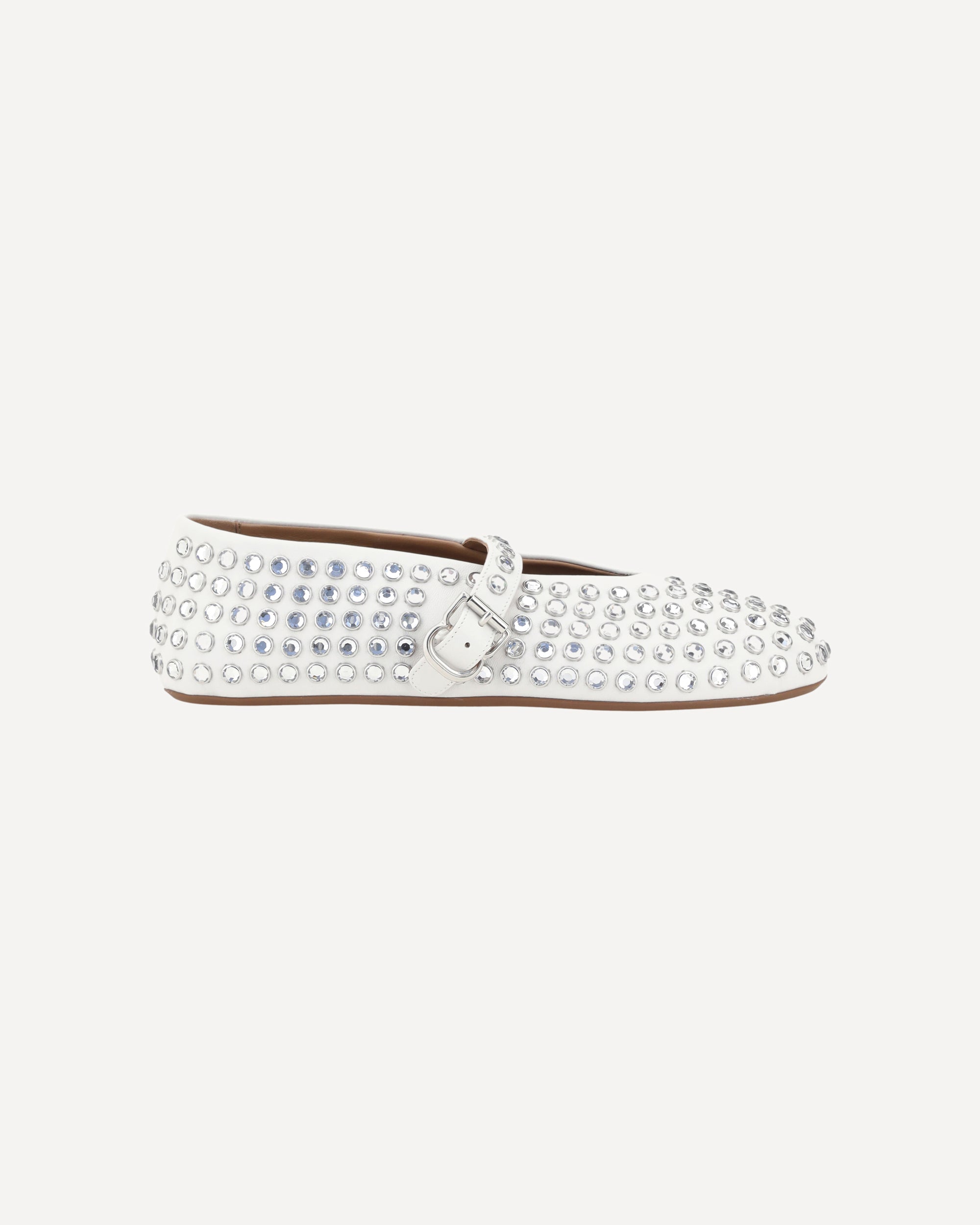 The lambskin Ballerinas by Alaïa are a masterpiece of elegance and sophistication. Featuring a flat sole for comfort, they have a round toe that adds a sweet touch to the design. The closure by an applied strap on the back of the foot offers a secure and delicate fit. The all-over contrasting applied rhinestone detail gives a touch of light and luxury, making these ballet flats ideal for completing elegant and sophisticated looks with a touch of sparkle.