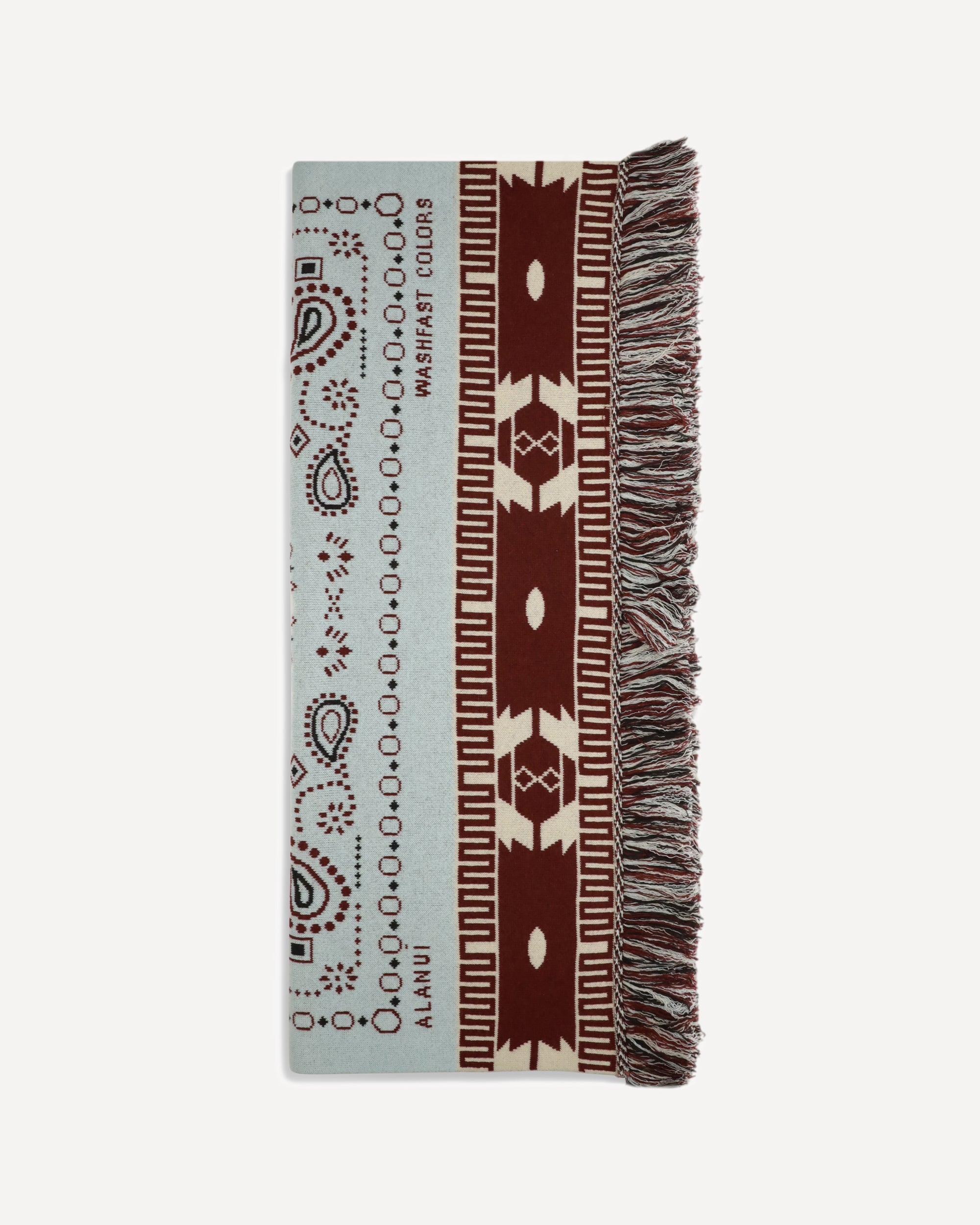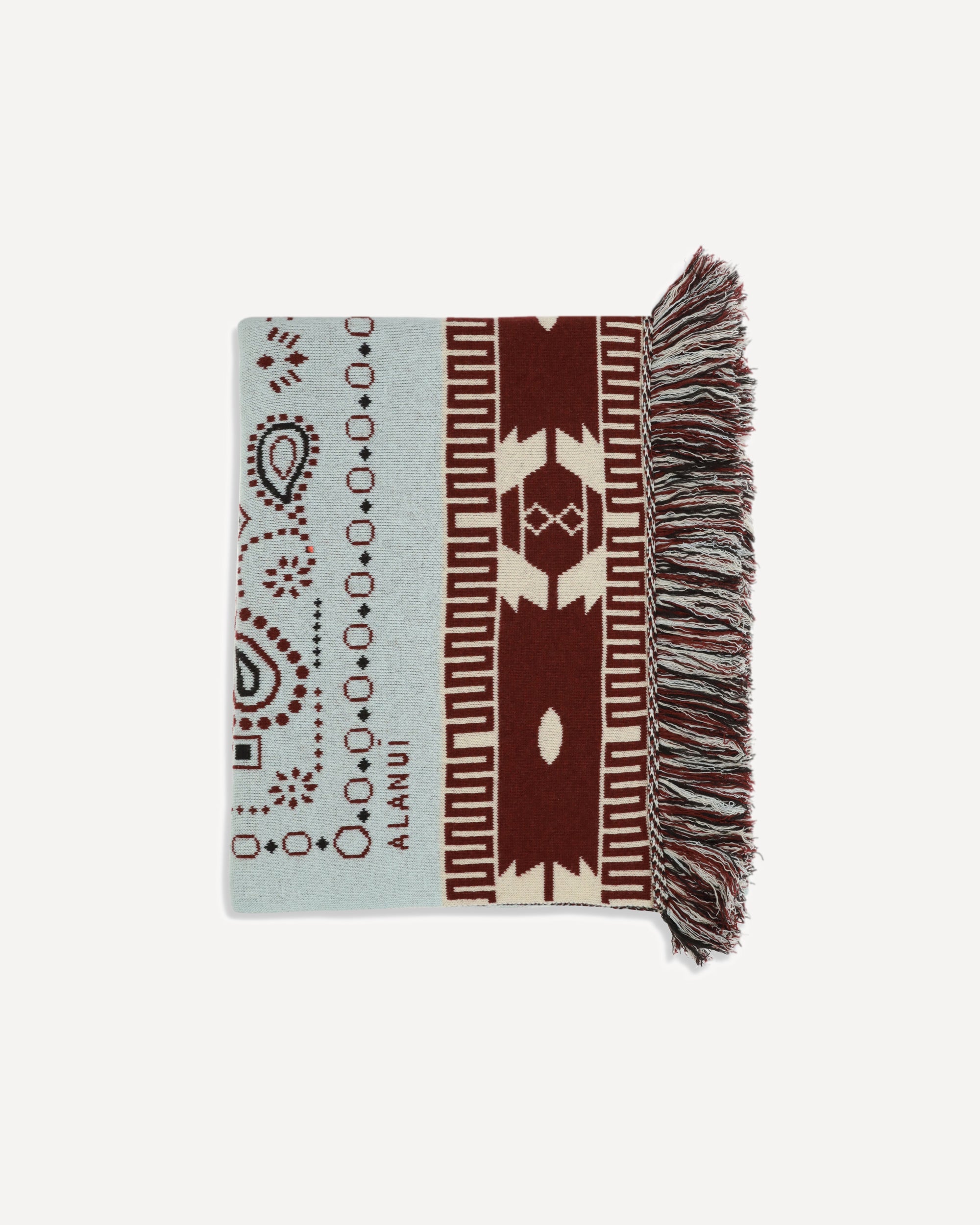 The jacquard Bandana Blanket by Alanui is a refined piece designed to enrich any home environment. Made of fine virgin wool, it features the iconic Alanui hybrid pattern and long frayed edges, combining distinctive aesthetics and handcrafted details. Perfect for milder seasons, it combines style and comfort in a timeless design accessory.