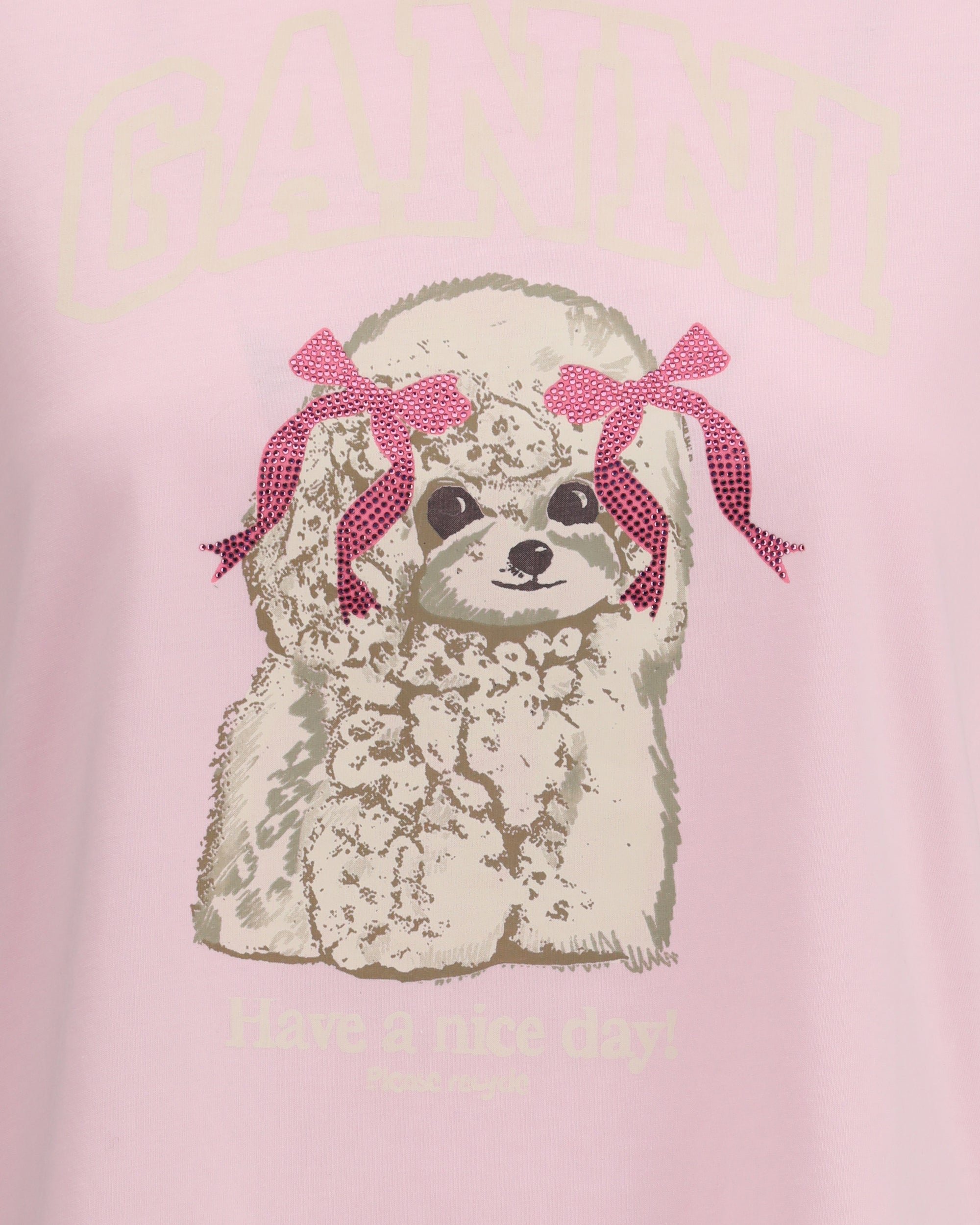 The Poodle T-shirt By Ganni elevates a simple staple with playful charm and modern attitude. The clean round neckline and short sleeves create an easy, relaxed silhouette, while the poodle print graphic adds a whimsical, standout element. Finished with the signature GANNI logo, it’s a piece that blends simplicity with expressive style, perfect for everyday looks.