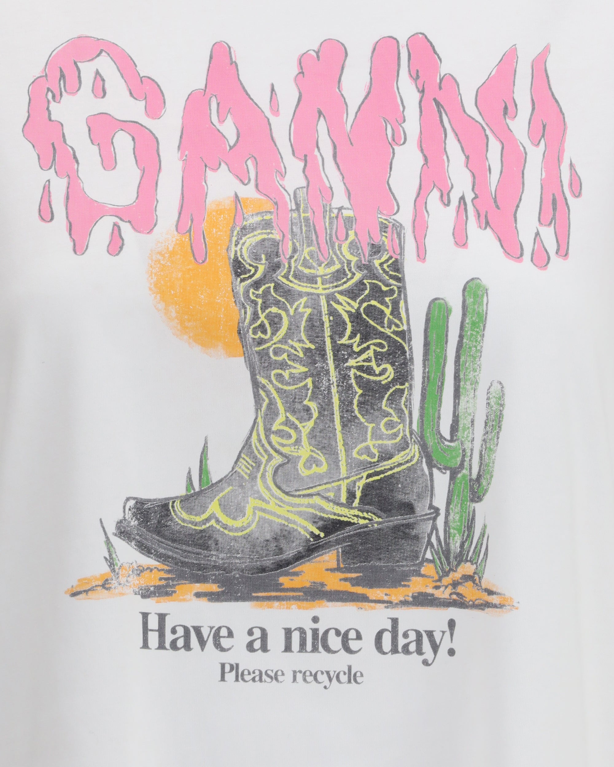 The Western Boot Print T-shirt By Ganni turns a classic silhouette into a playful and expressive piece. The clean round neckline and short sleeves frame the bold western boot graphic, a signature blend of whimsy and style. The message “Have a nice day! Please recycle” adds a warm, conscious note that echoes the brand’s identity. A simple yet impactful T-shirt that brings personality into everyday dressing.