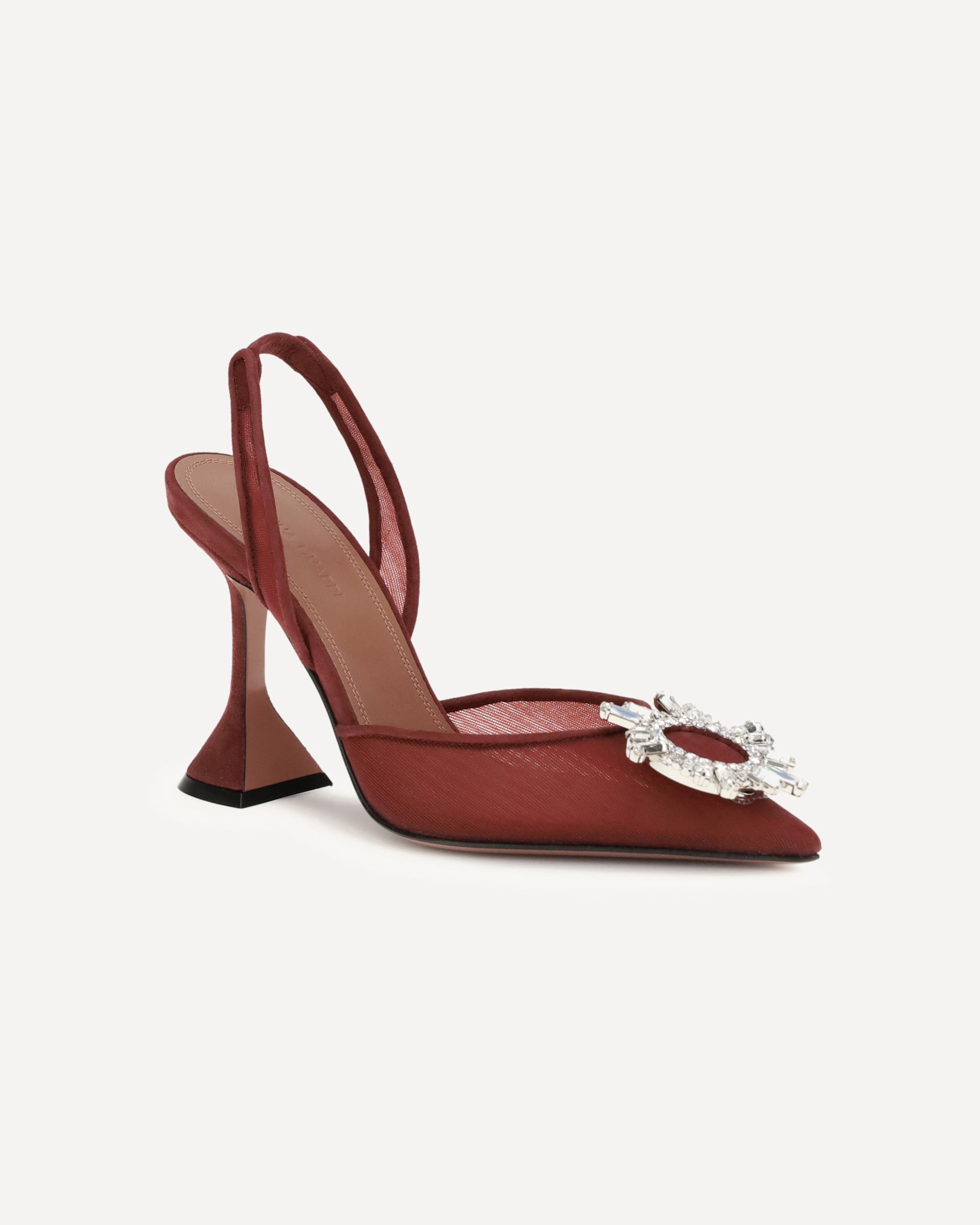 The Begum Pumps by Amina Muaddi, a masterpiece of elegance and glamour. The elongated almond toe at the front lends a refined and sophisticated profile, while the geometric leather heel adds a bold modern touch. The slingback detail at the heel not only ensures a secure fit but also adds an element of style. The rhinestone and glitter jewel applied in relief on the toe catches the light and enriches the design with a touch of shimmering luxury. The press studded leather insole offers comfort and an exclusive detail that perfectly completes the look.
