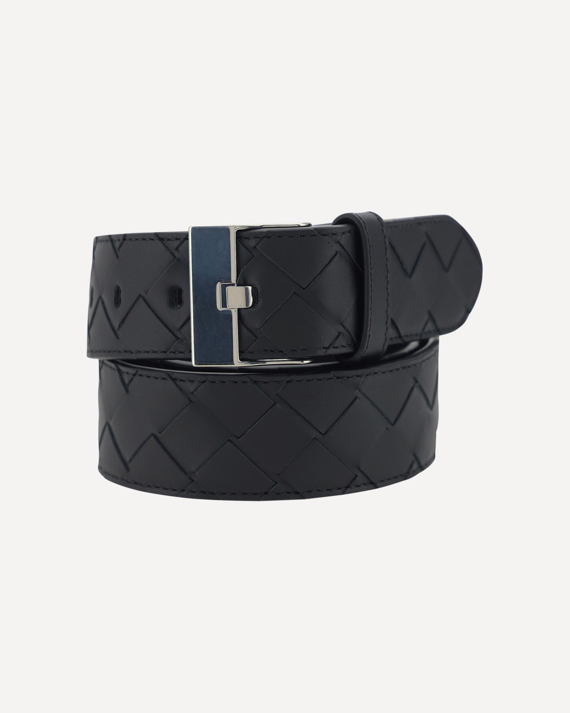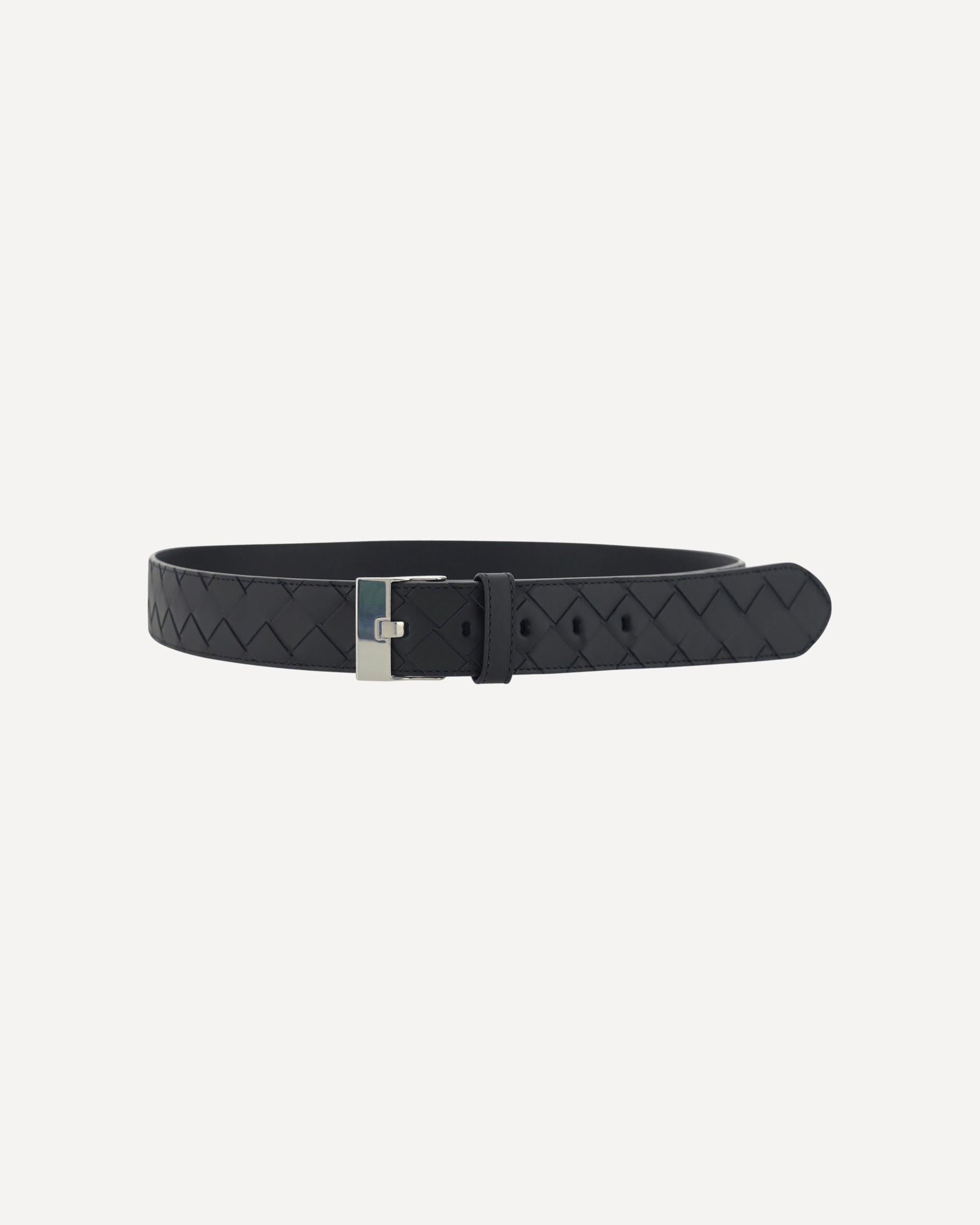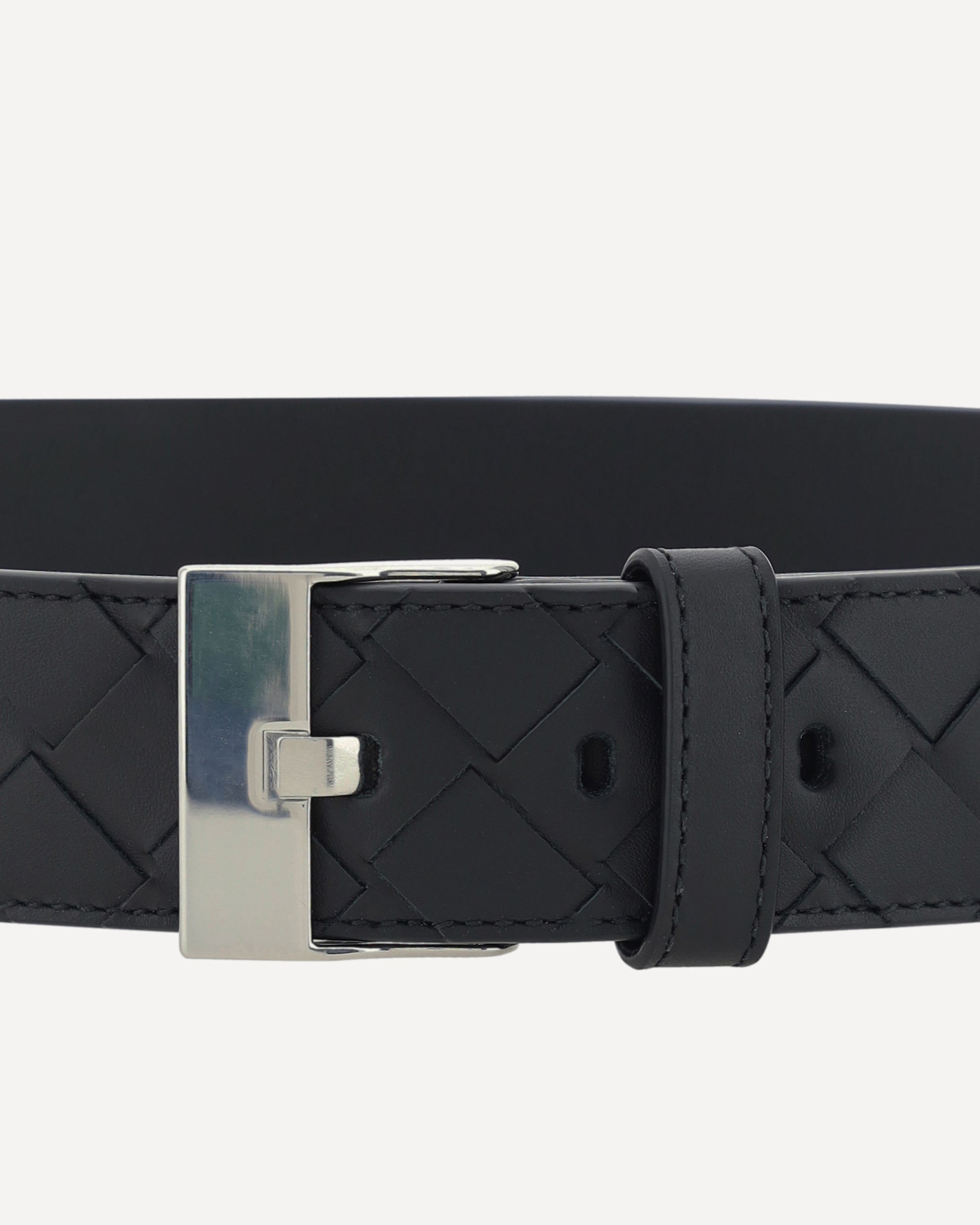 Leather Belt by Bottega Veneta is a timeless accessory, embellished with a distinctive intrecciato design that expresses the brand's excellent craftsmanship. The contrasting metal buckle adds a bold modern touch, elegantly complementing both formal and casual looks.