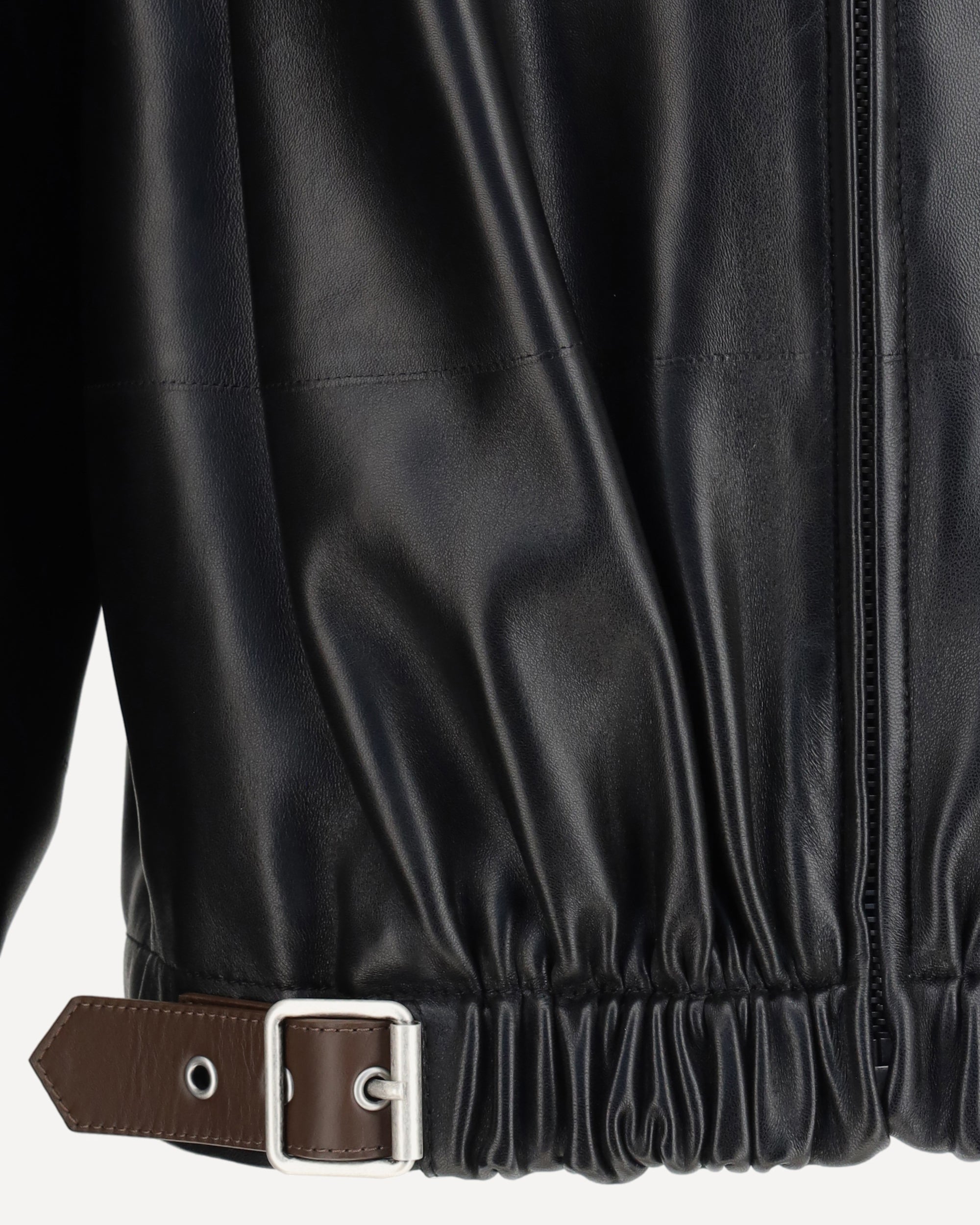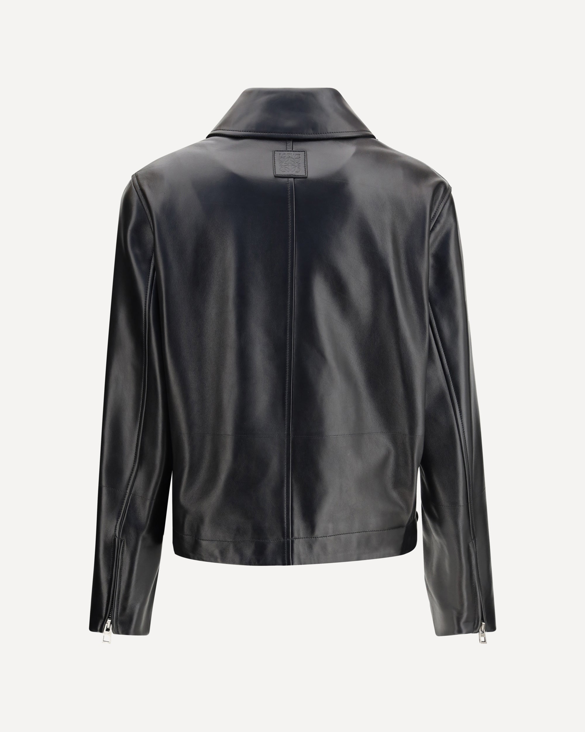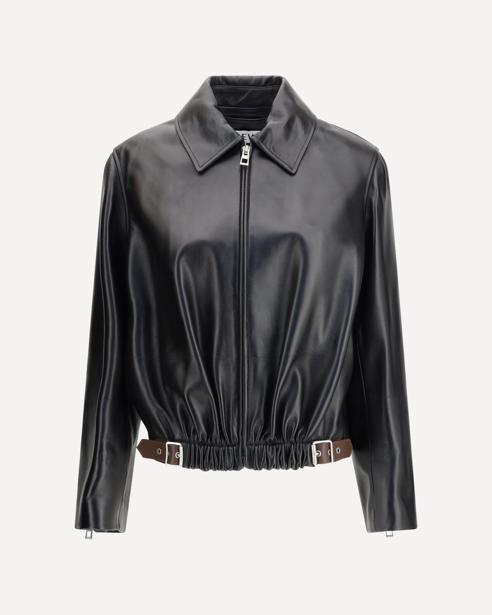 The lightweight lambskin plongé Jacket by Loewe embodies understated sophistication through its refined detailing and balanced proportions. The softly gathered front highlights the waist, accentuated by a contrasting leather belt that adds both definition and modern appeal. Designed with a classic collar, front zip fastening, and zipped cuffs, the piece combines functionality with timeless elegance. Seam pockets and an interior welt pocket preserve its clean silhouette, while full lining ensures comfort and structure. A tonal leather patch embossed with the LOEWE logo at the back provides a subtle yet distinctive signature finish.
